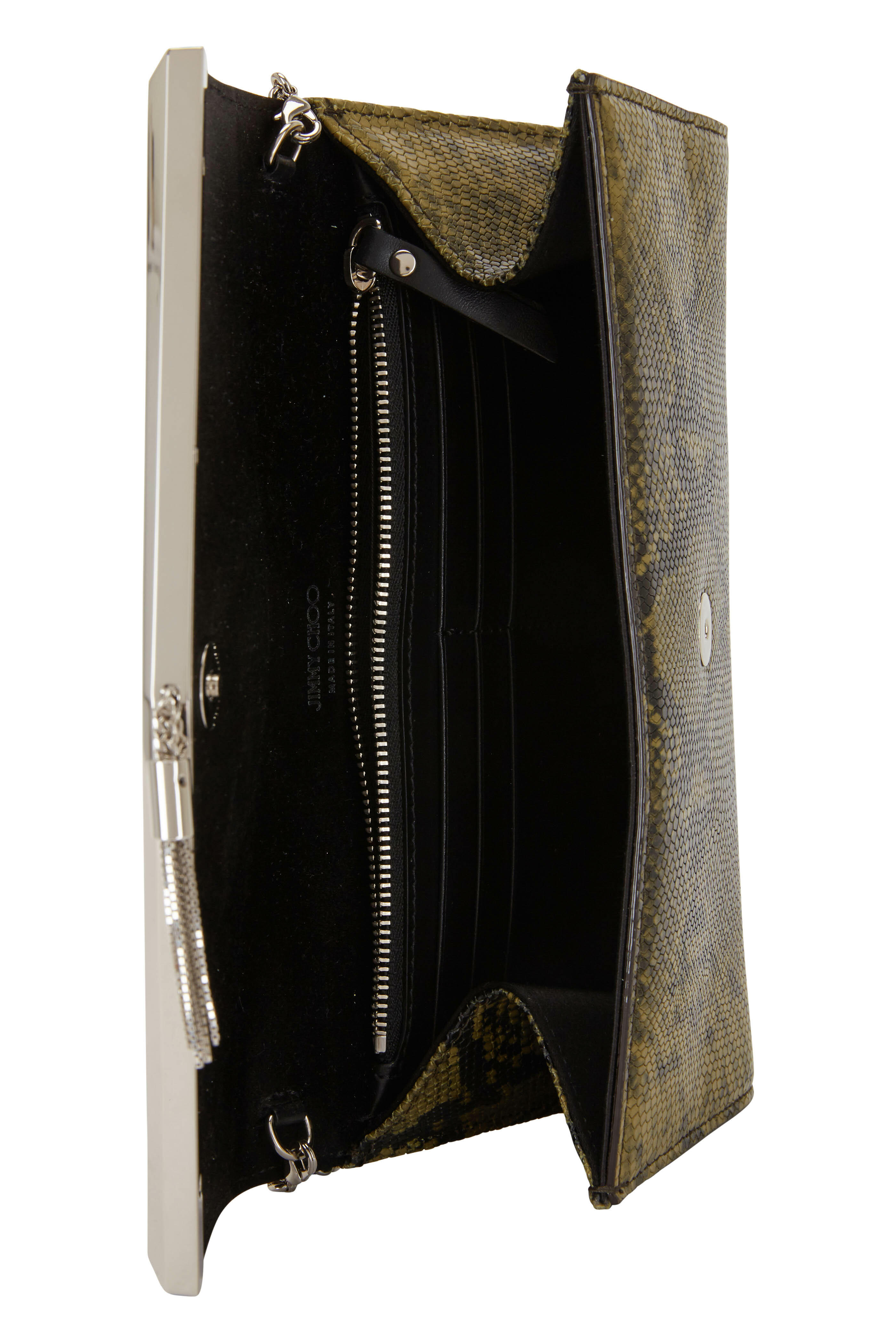 Snake embossed leather. Removable chain shoulder strap. Envelop flap; snap closure. Logo-engraved metal bar. Exterior, hanging chain tassel. Interior, zip pocket and six card slots. Made in Italy. Shoulder strap drop length: 15.5". Width: 8.5". Height: 4.5". Depth: 1".