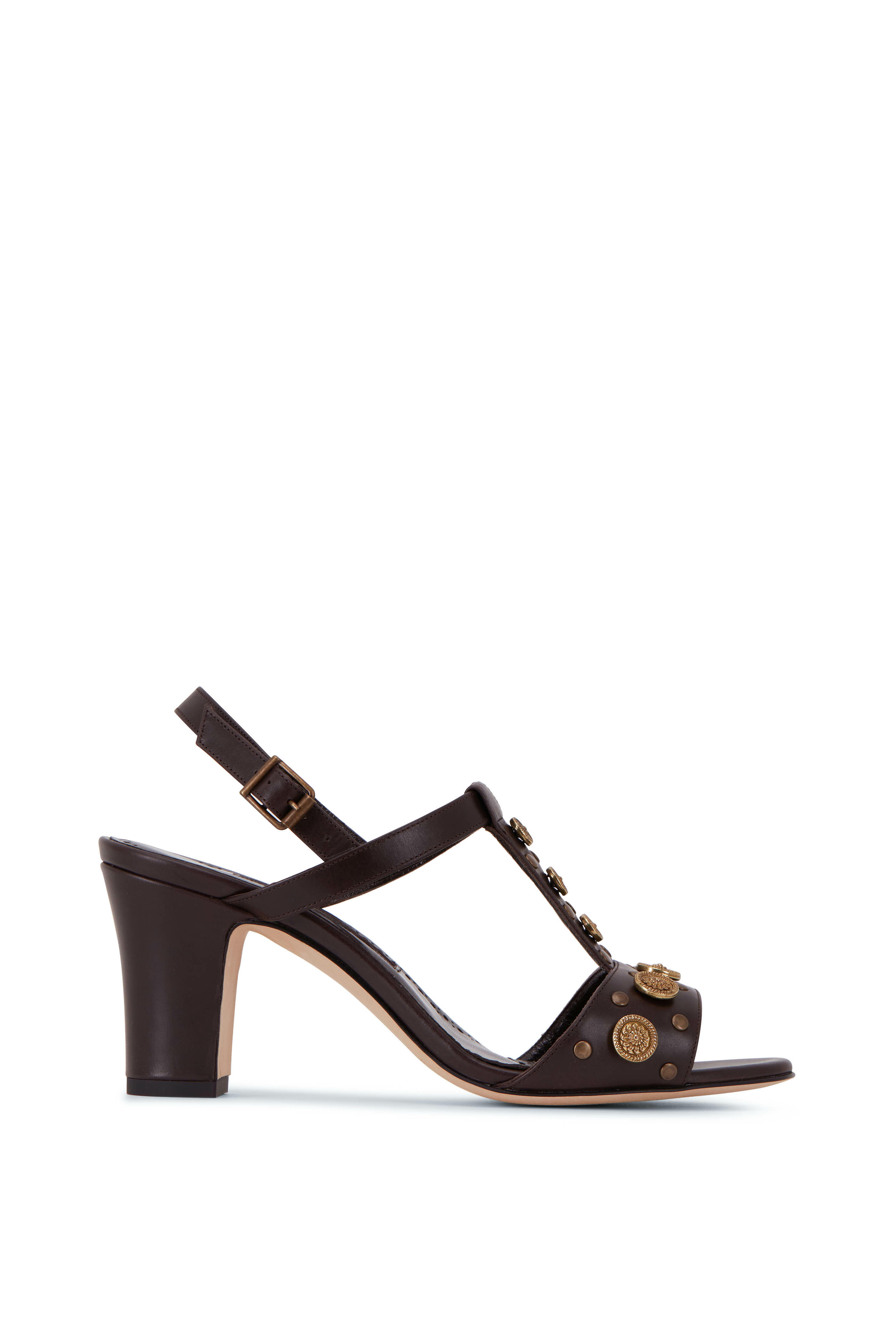 Leather lining. Open, round toe. Adjustable buckle. Gold-tone coin accents. Leather lining and insole. Leather sole. Made in Italy. Heel measurement: 70mm (2.75").