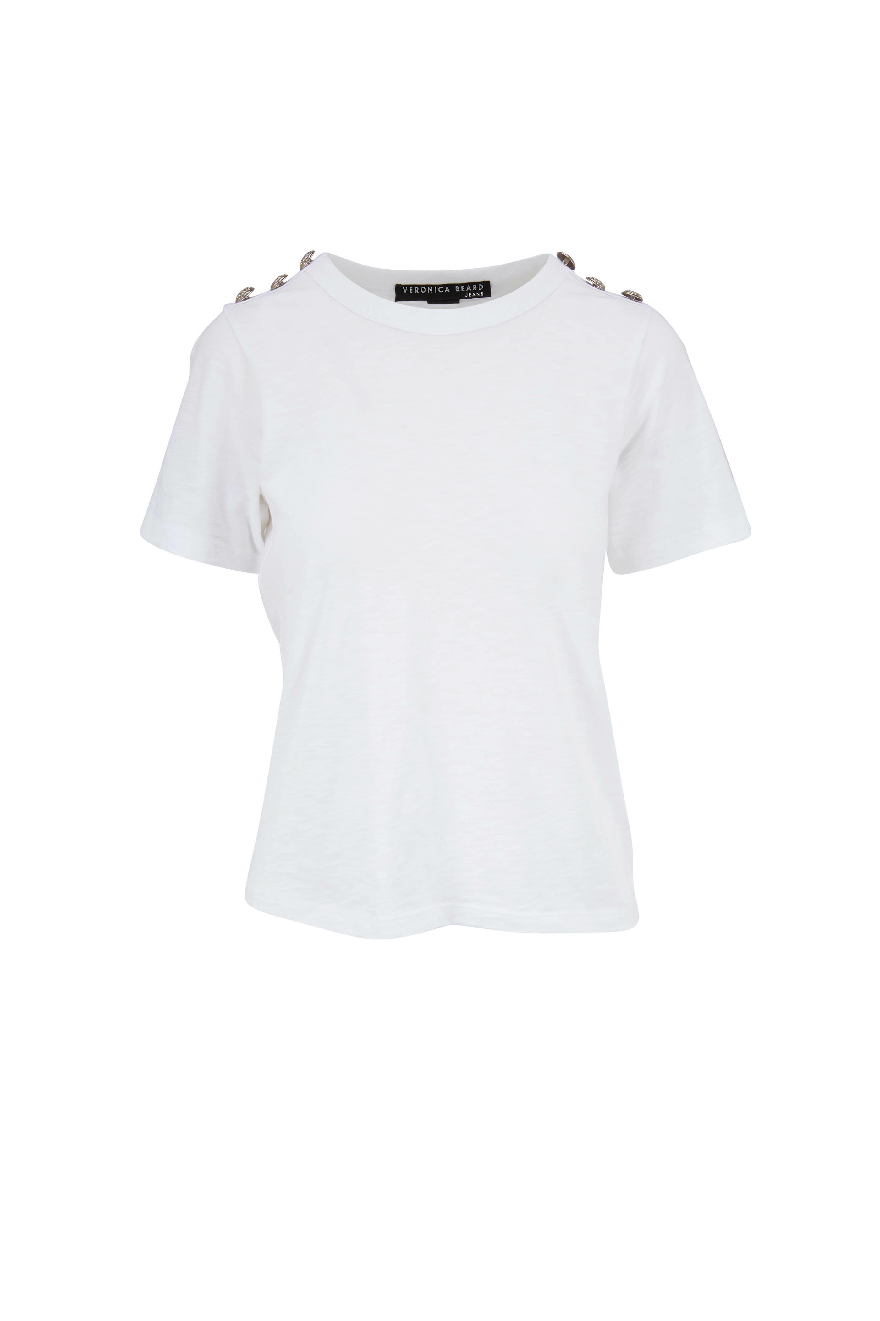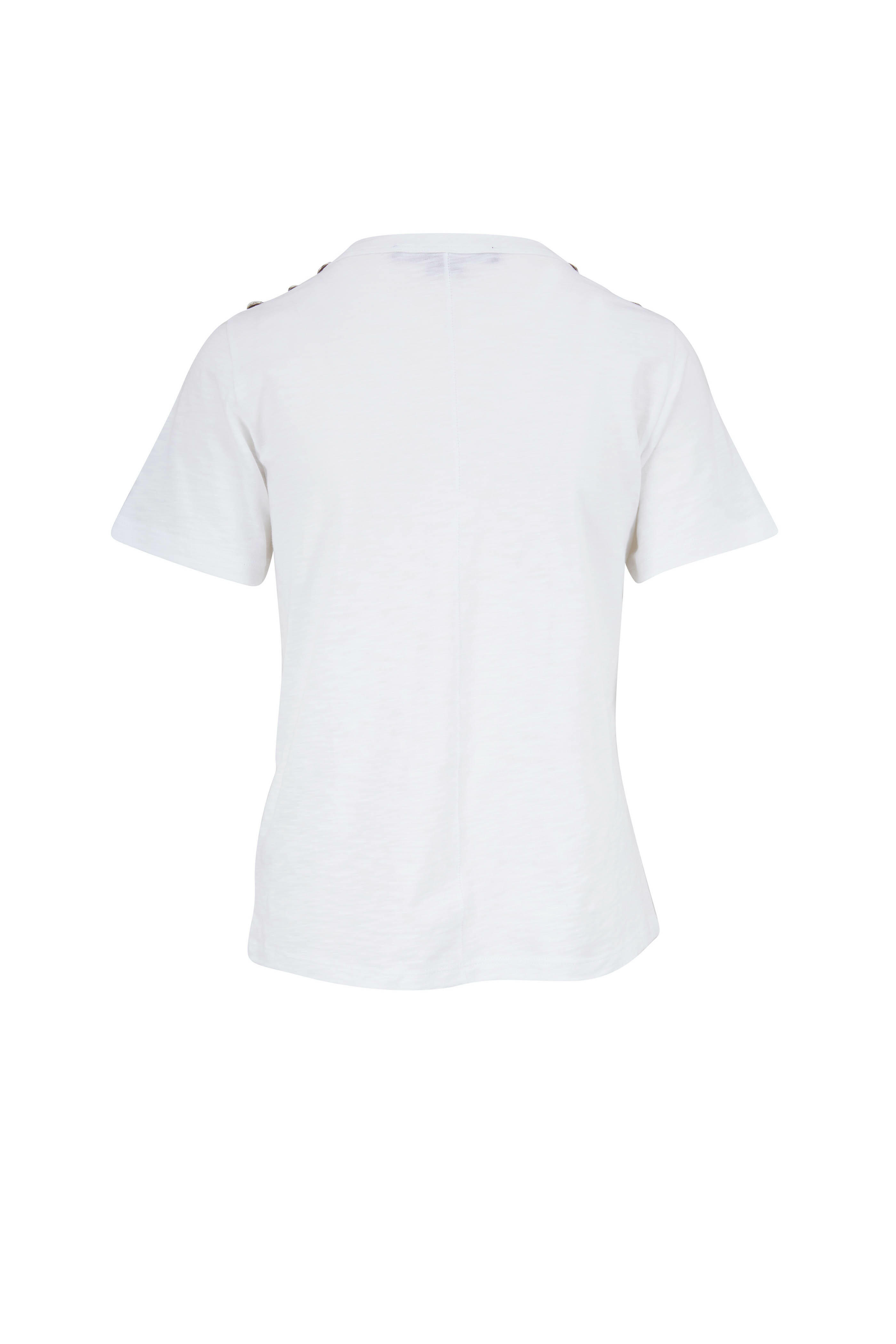 Crewneck. Silver-toned button shoulder detail. Made in Peru. 100% pima cotton. Machine wash inside out.