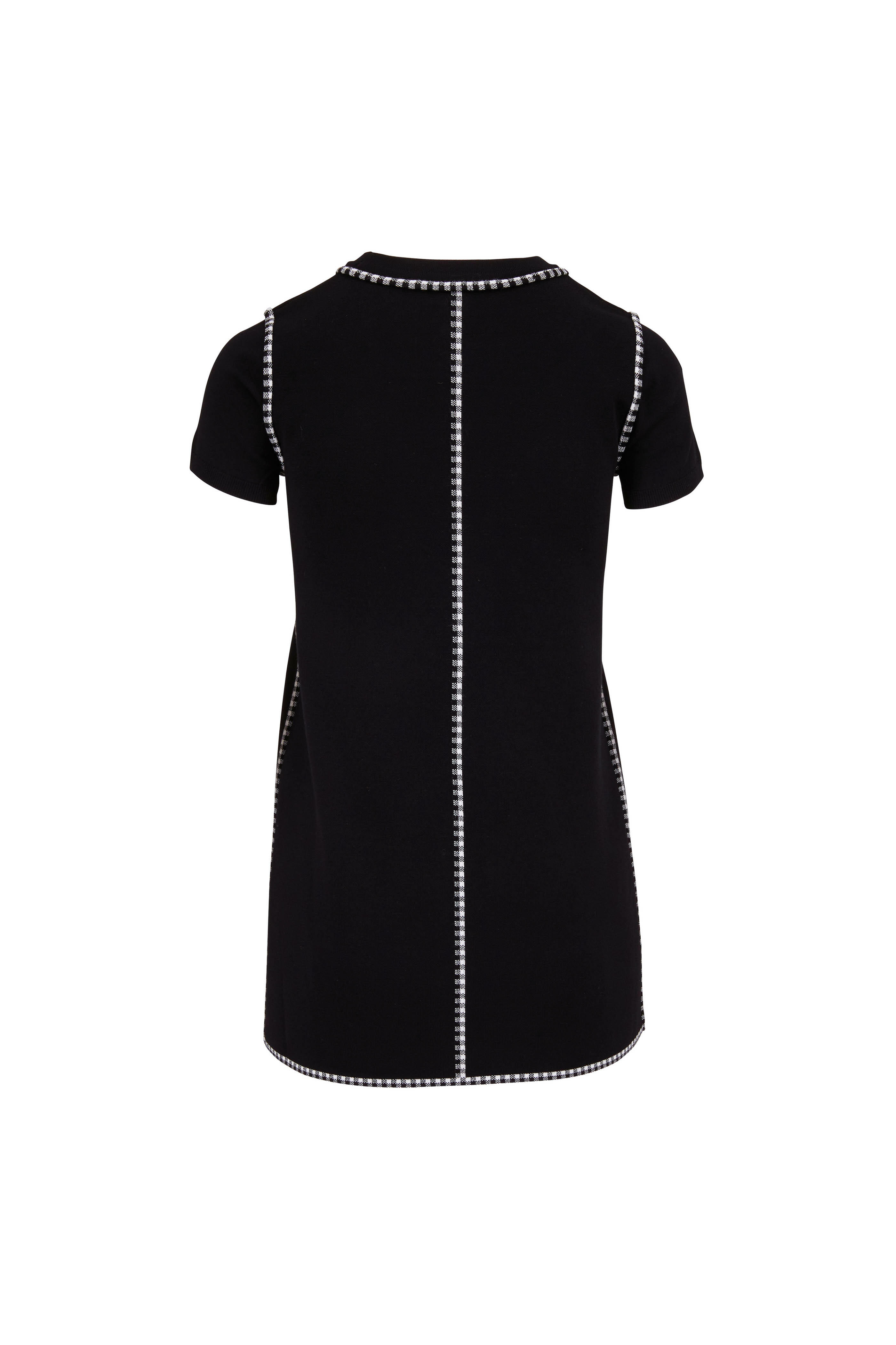 Jewel neckline. Slip over style. Contrast straight hem. Imported. 36" shoulder to hem. 72% viscose, 28% polyamide. Dry clean.
