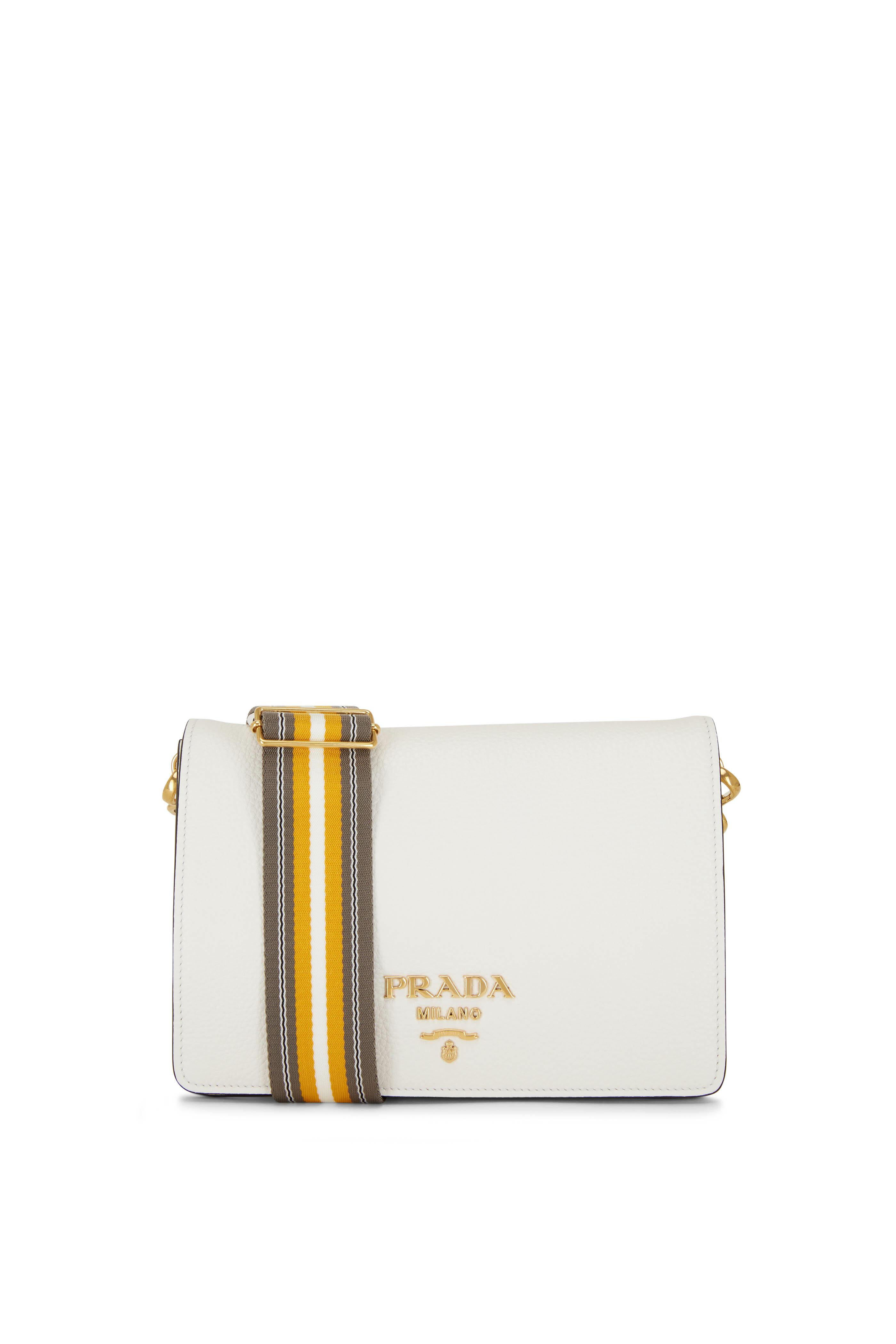 Detachable and adjustable flat leather strap; secondary nylon shoulder strap leather inset strap. Flap front, magnetic closure. Gold-tone logo. Two interior compartments; one zip pocket, one slip pocket. Lined in leather. Made in Italy. Width: 9". Height: 6". Depth: 4".
