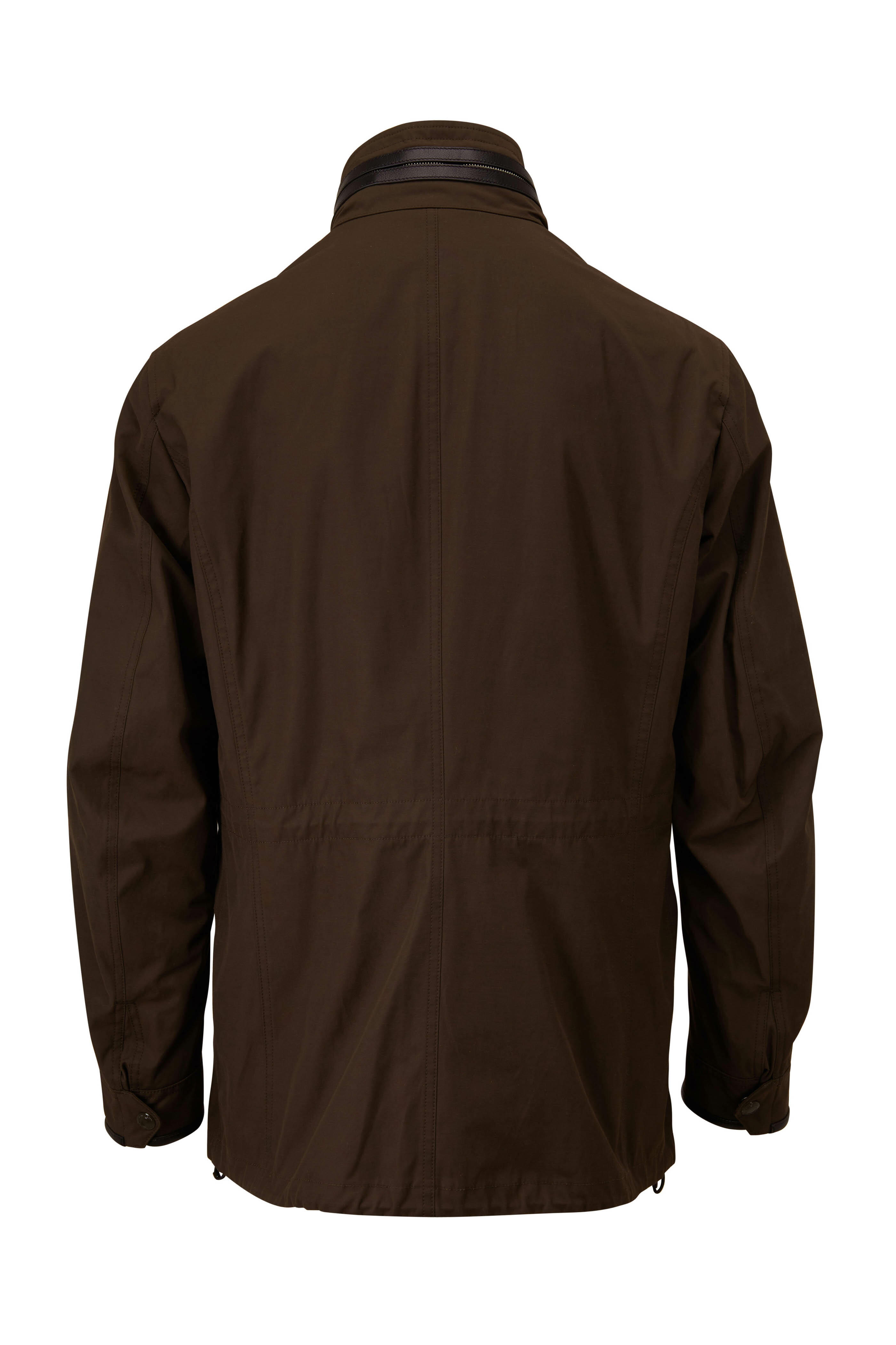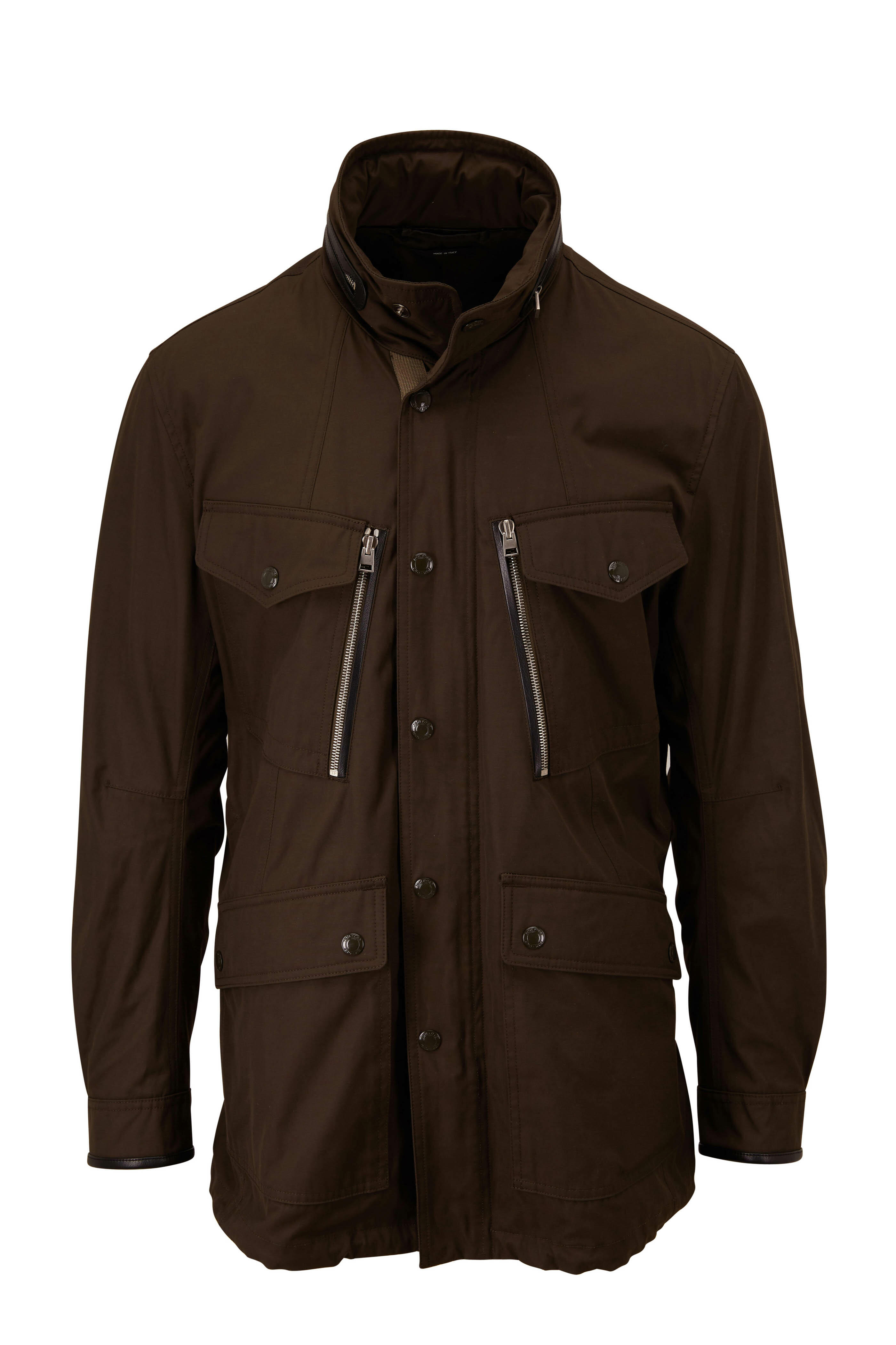 Specialist clean. Stand collar; zip detail. Concealed two-way zip; snap placket. Single snap cuffs. Lower snap flap pockets; chest flap pockets; chest vertical zip pockets. Internal adjustable drawcord at waist. Made in Italy. 65% polyester, 35% cotton; leather trim.
