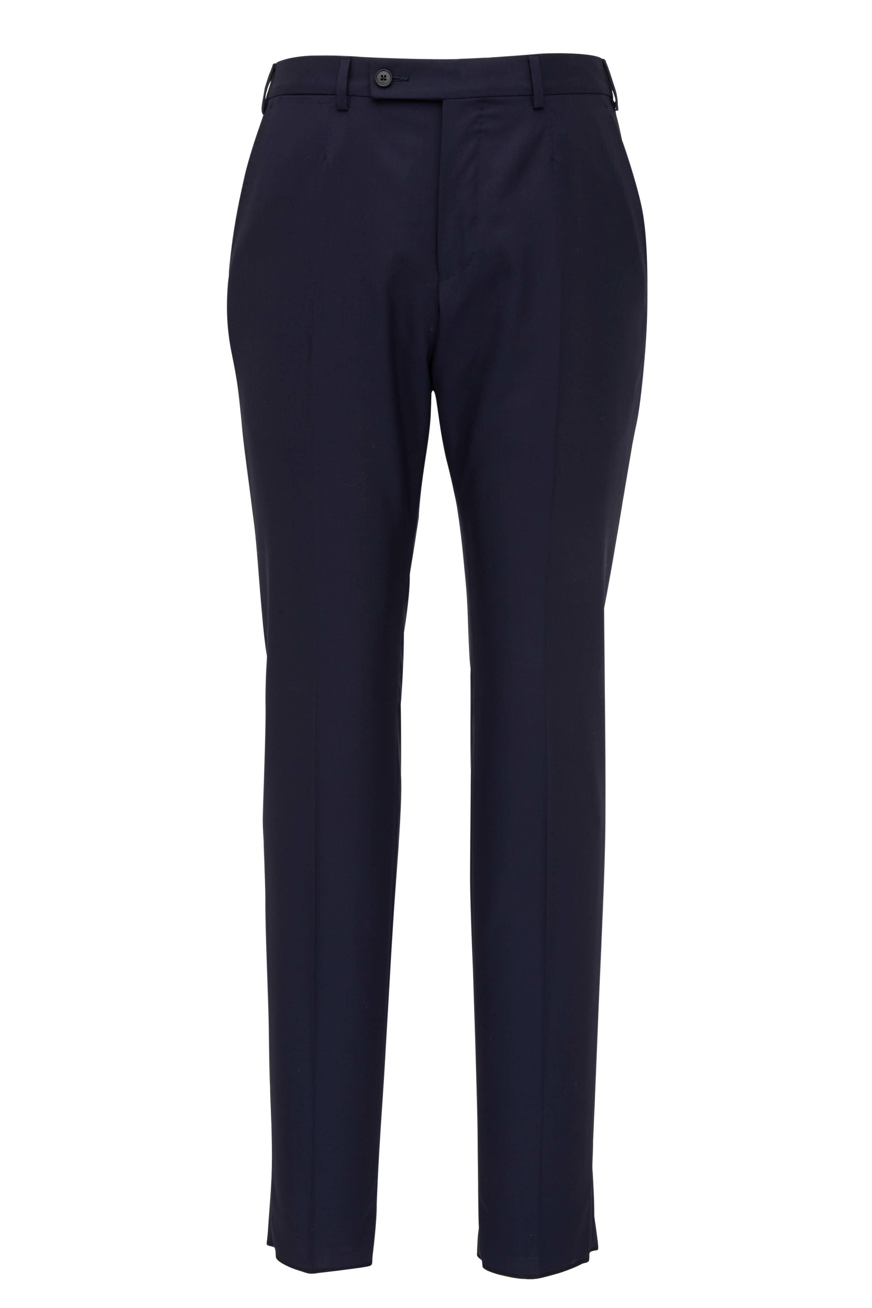 Made in Italy. Jacket: Fully lined. Notched lapels. Two button closure. Lower flap pockets; chest welt pocket. Double vent. Pant: Belt loops. Front slip pockets; back besom pockets; ticket pocket. Unfinished hem. 100% wool. Dry clean.