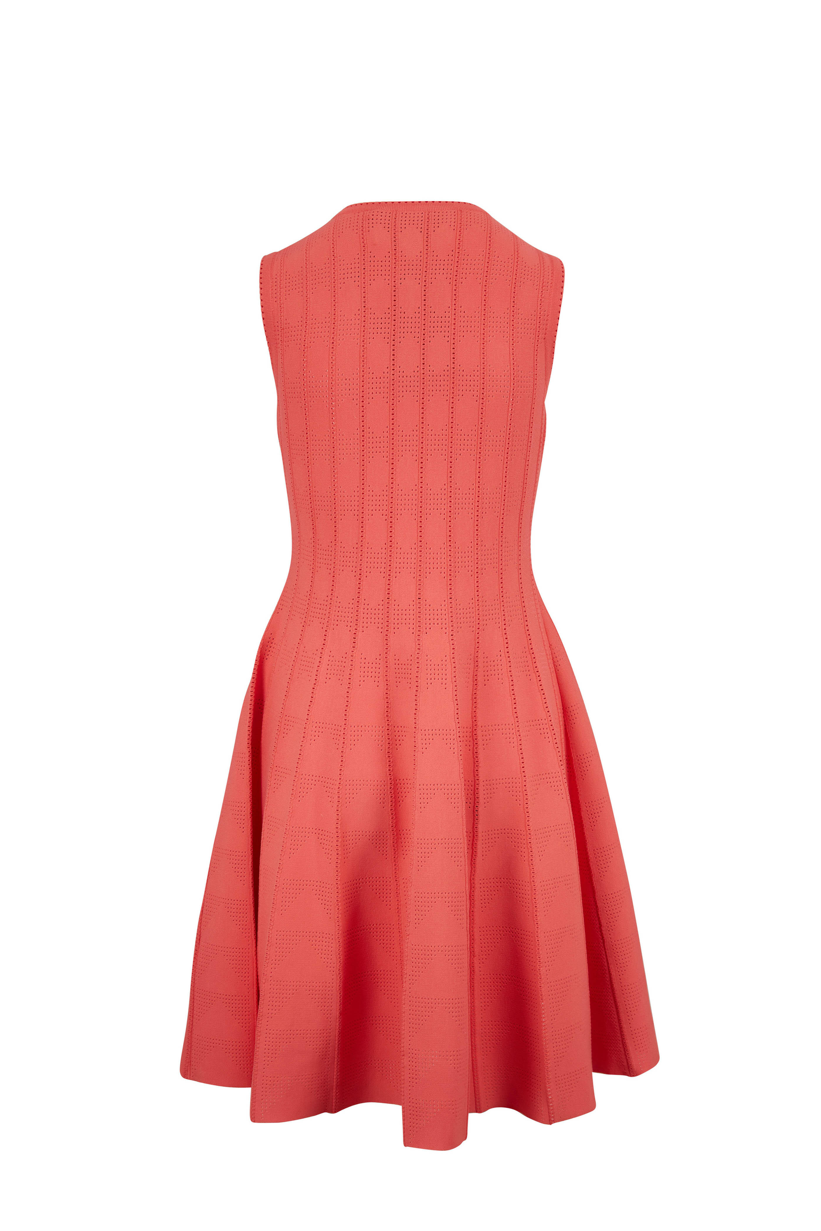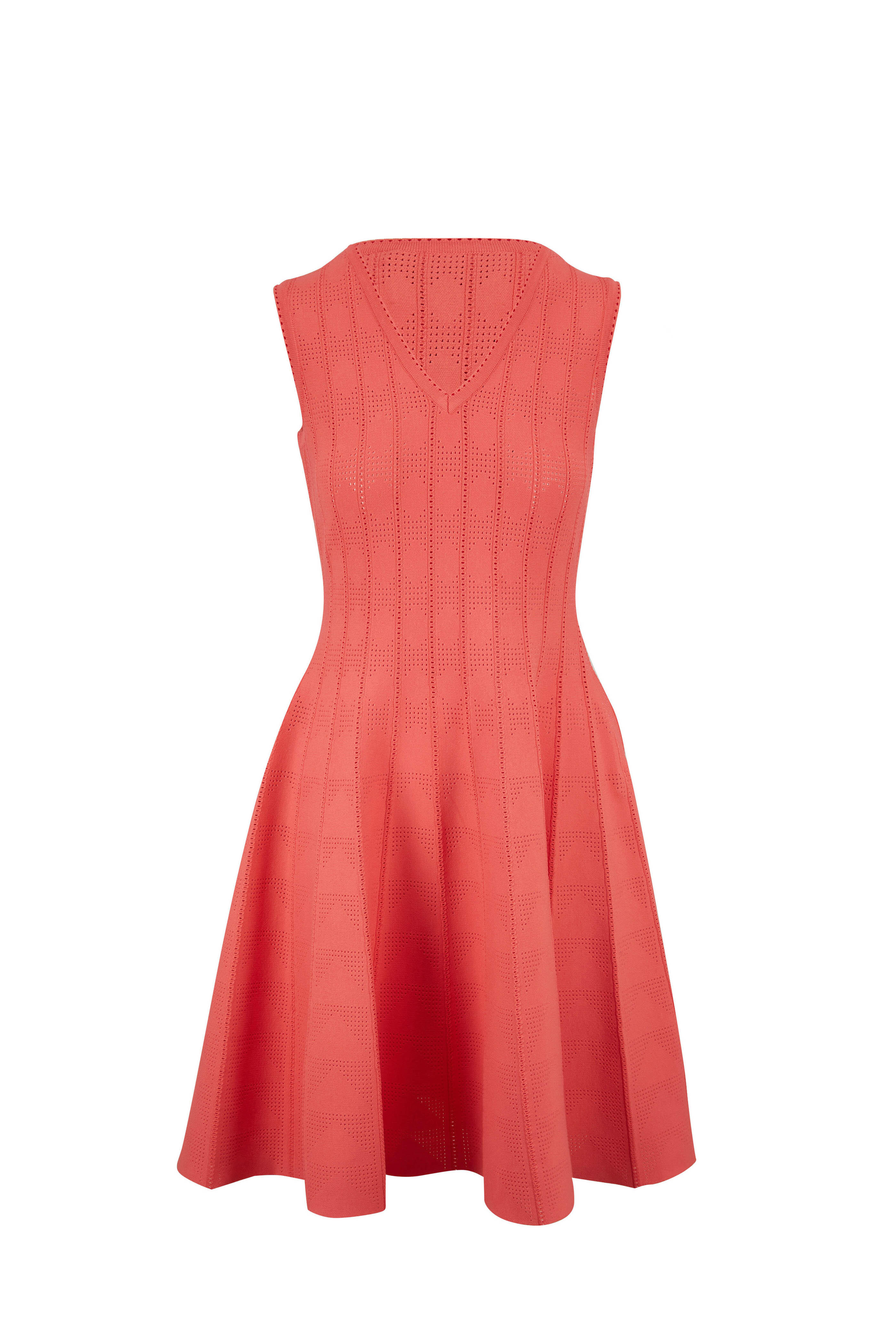 V-neckline. Concealed side zip. Pointelle stitch throughout. Made in Italy. Fit and flare silhouette. Length waist to hem: 21.5 inches. 66% viscose, 31% polyocellester, 3% lyocell. Dry clean.