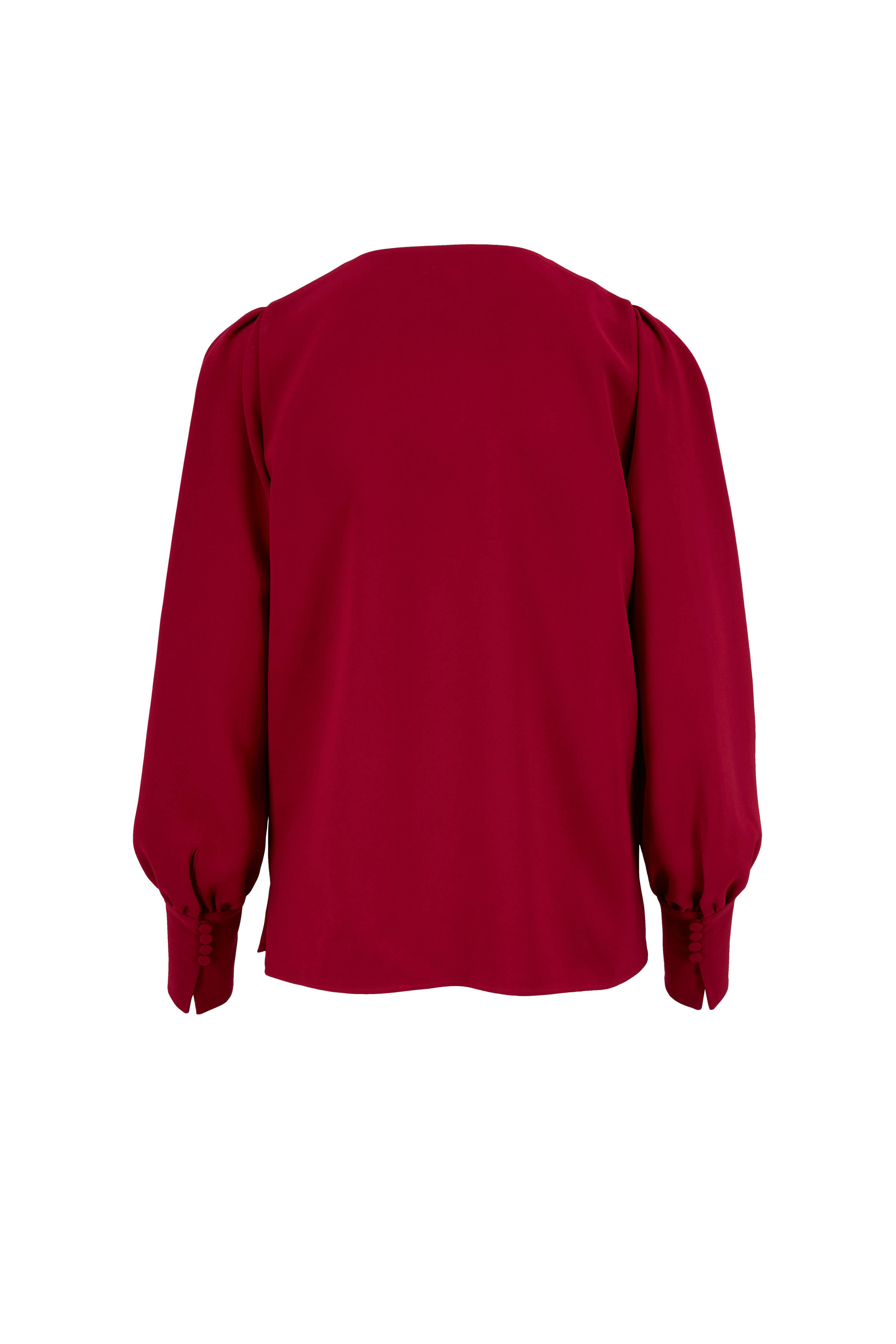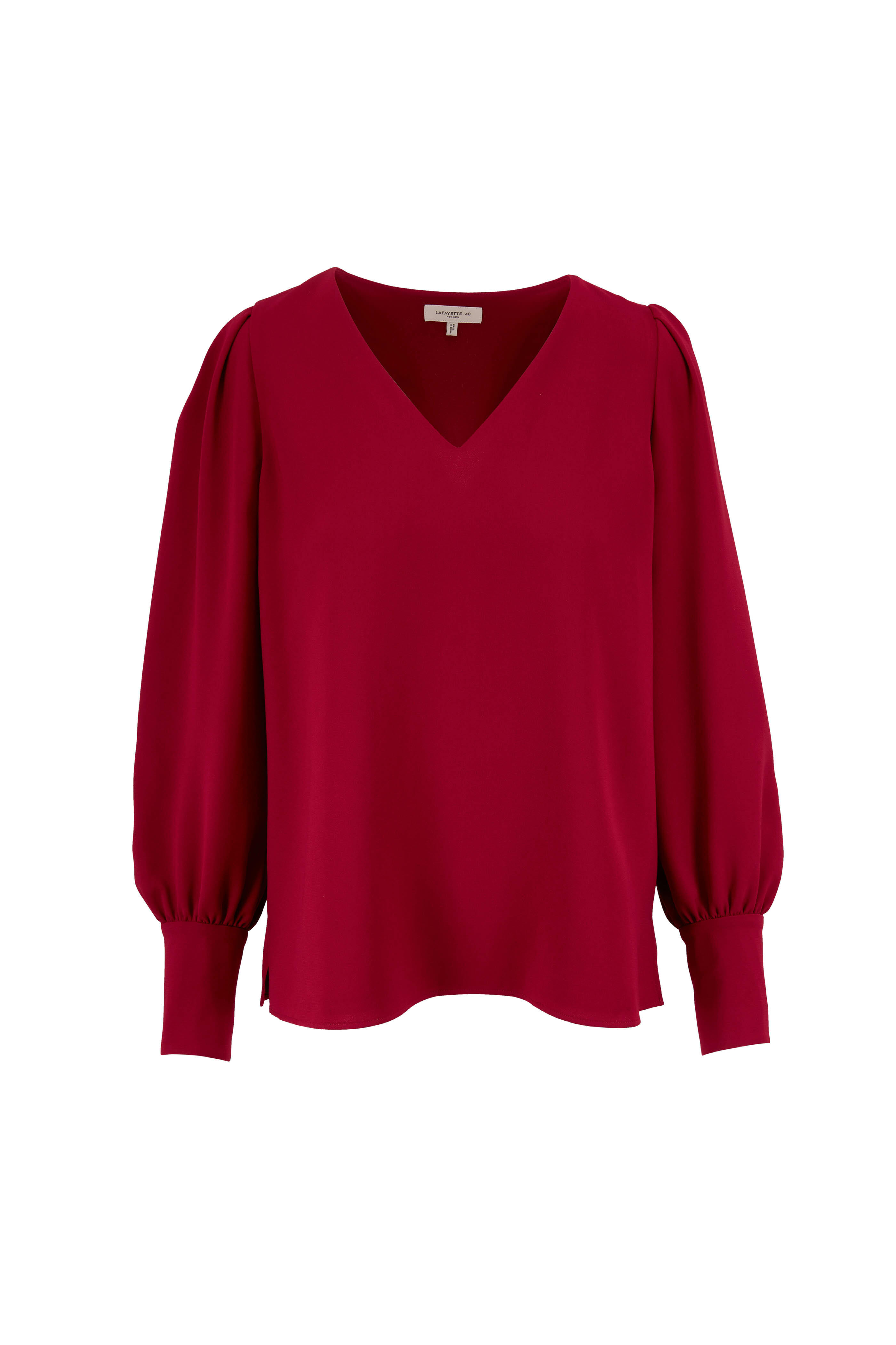 V-neckline. Blouson sleeves. Straight hem. Imported. 71% acetate, 29% polyester. Dry clean.