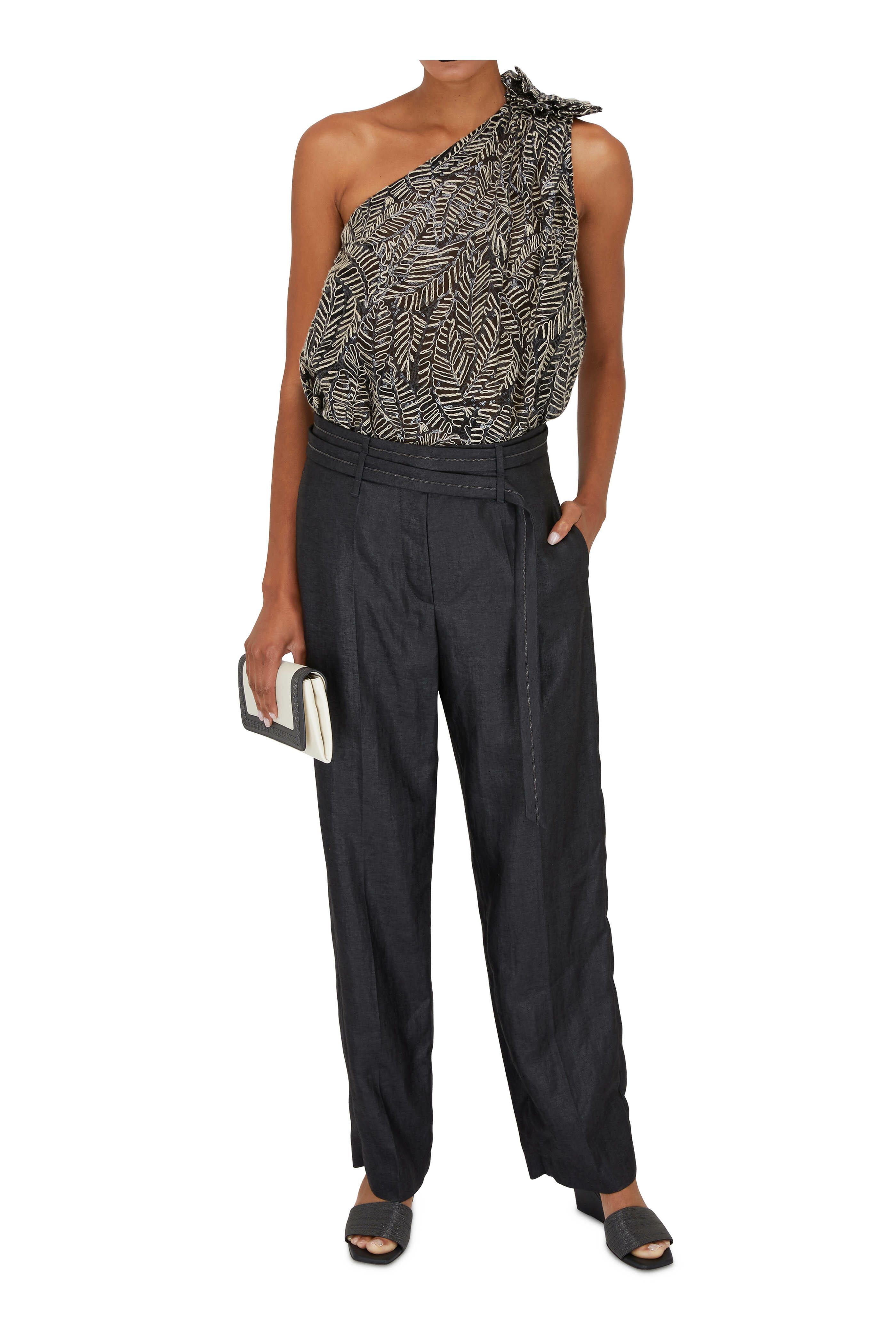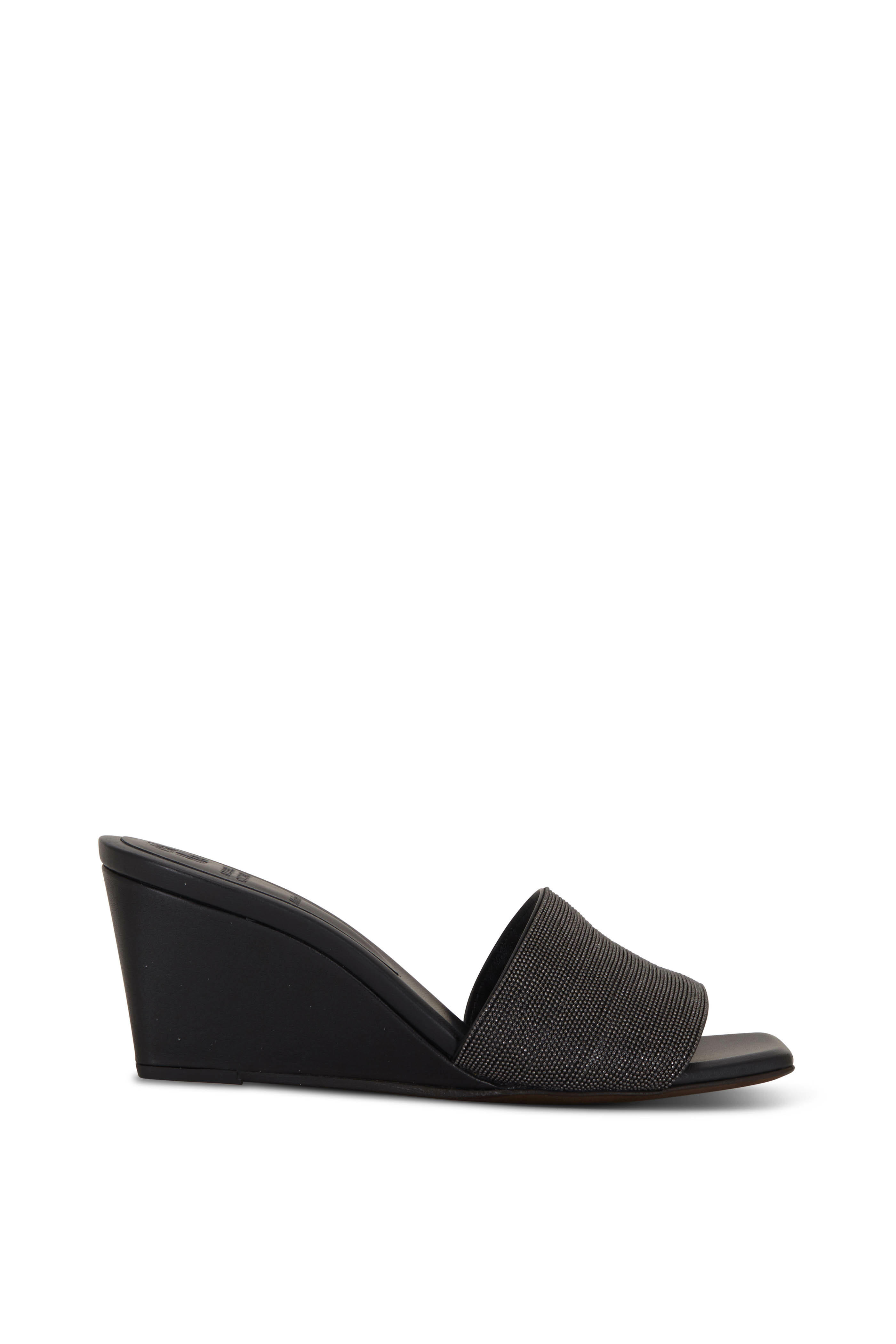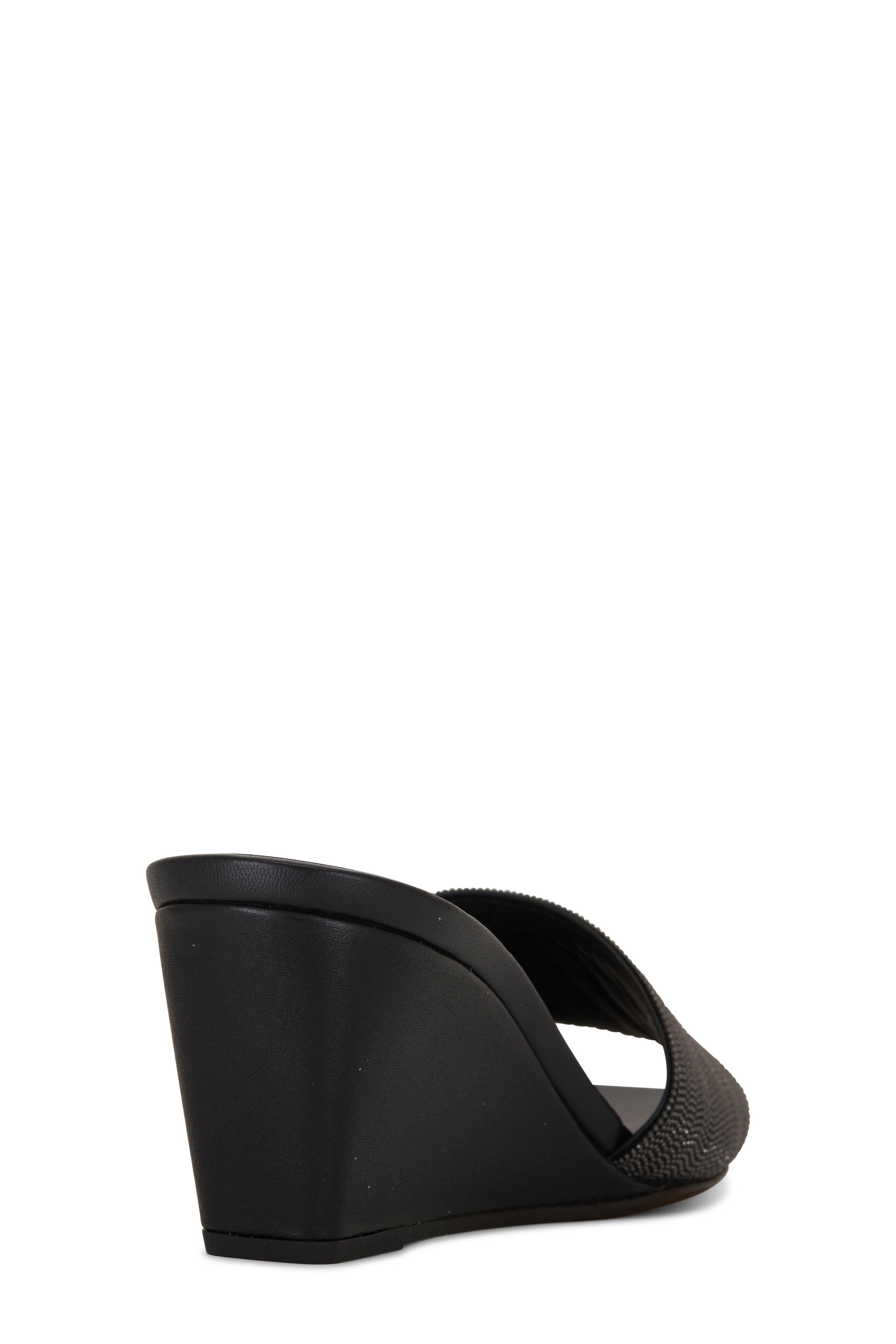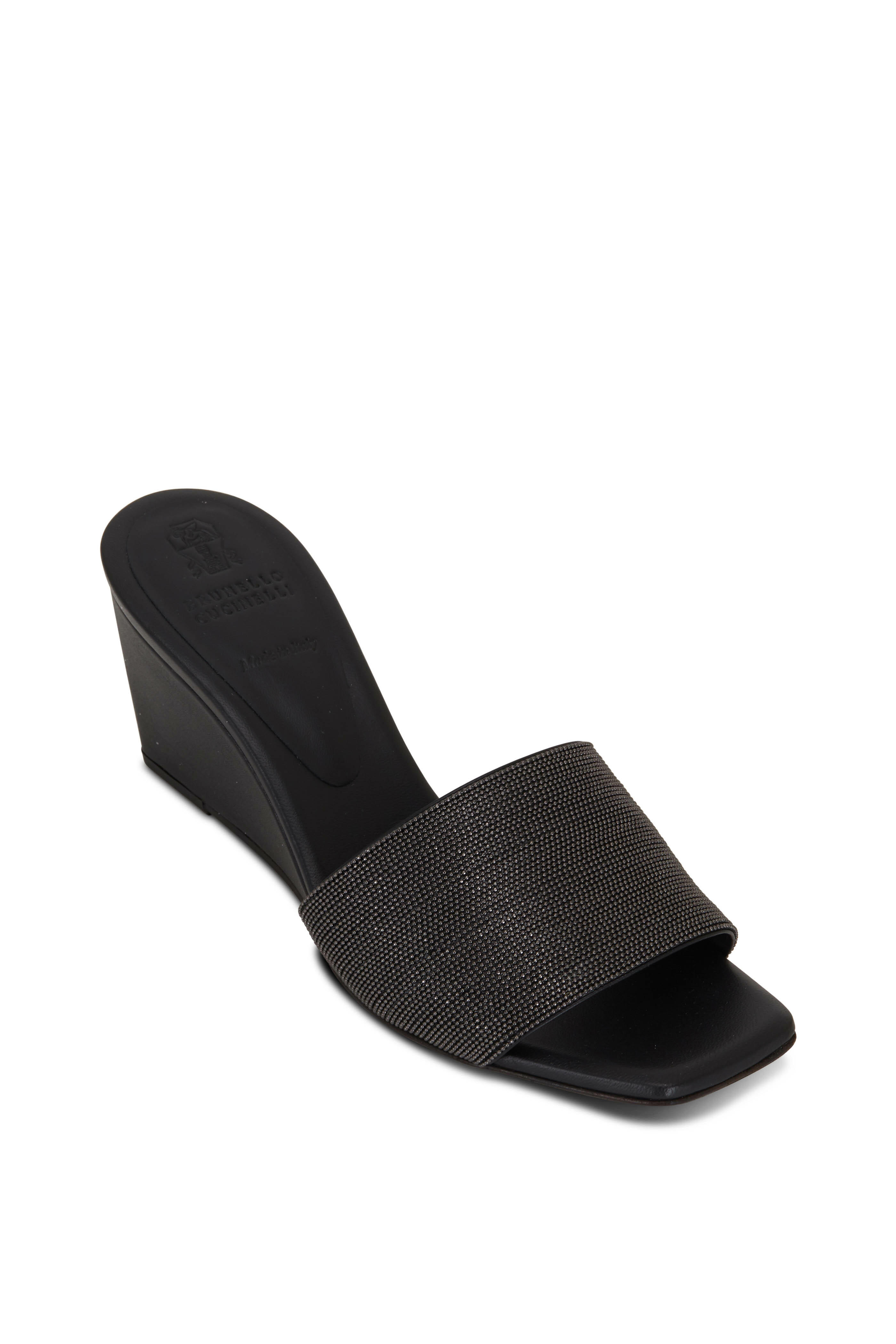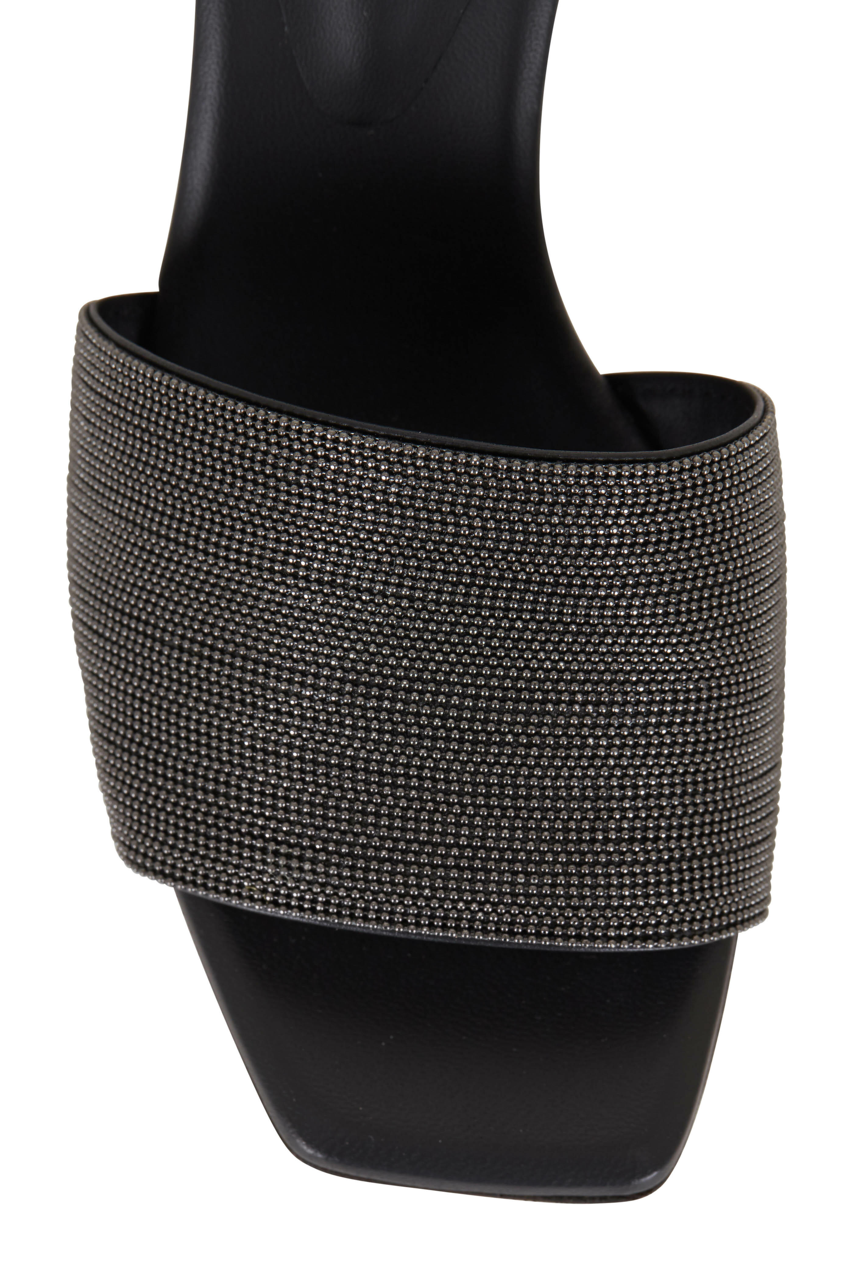 Leather upper. Open, square toe. Slip on style. Wide monili band at vamp. Leather lining and insole. Leather and rubber inset sole. Made in Italy. Heel measurement: 60mm (2 ½").