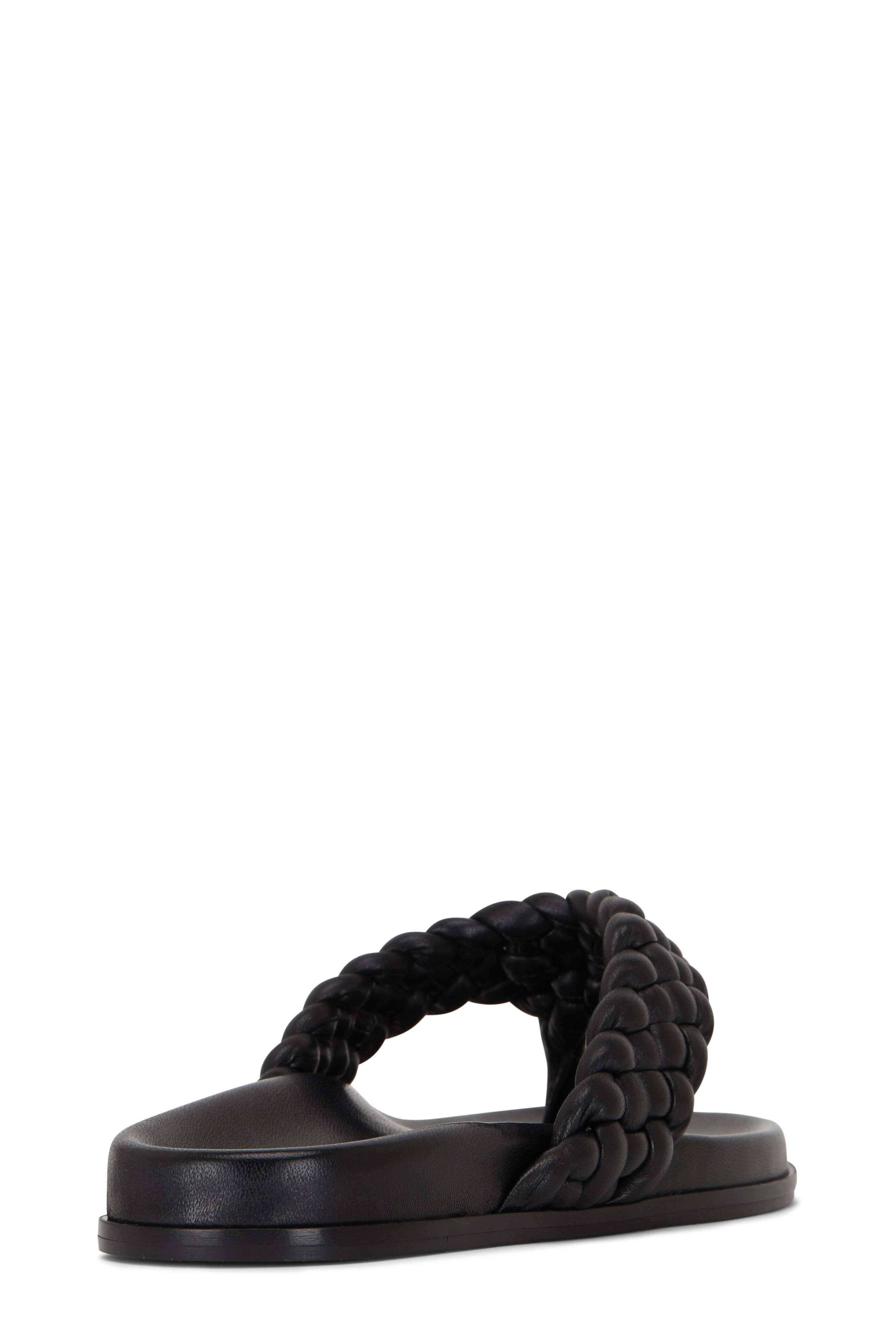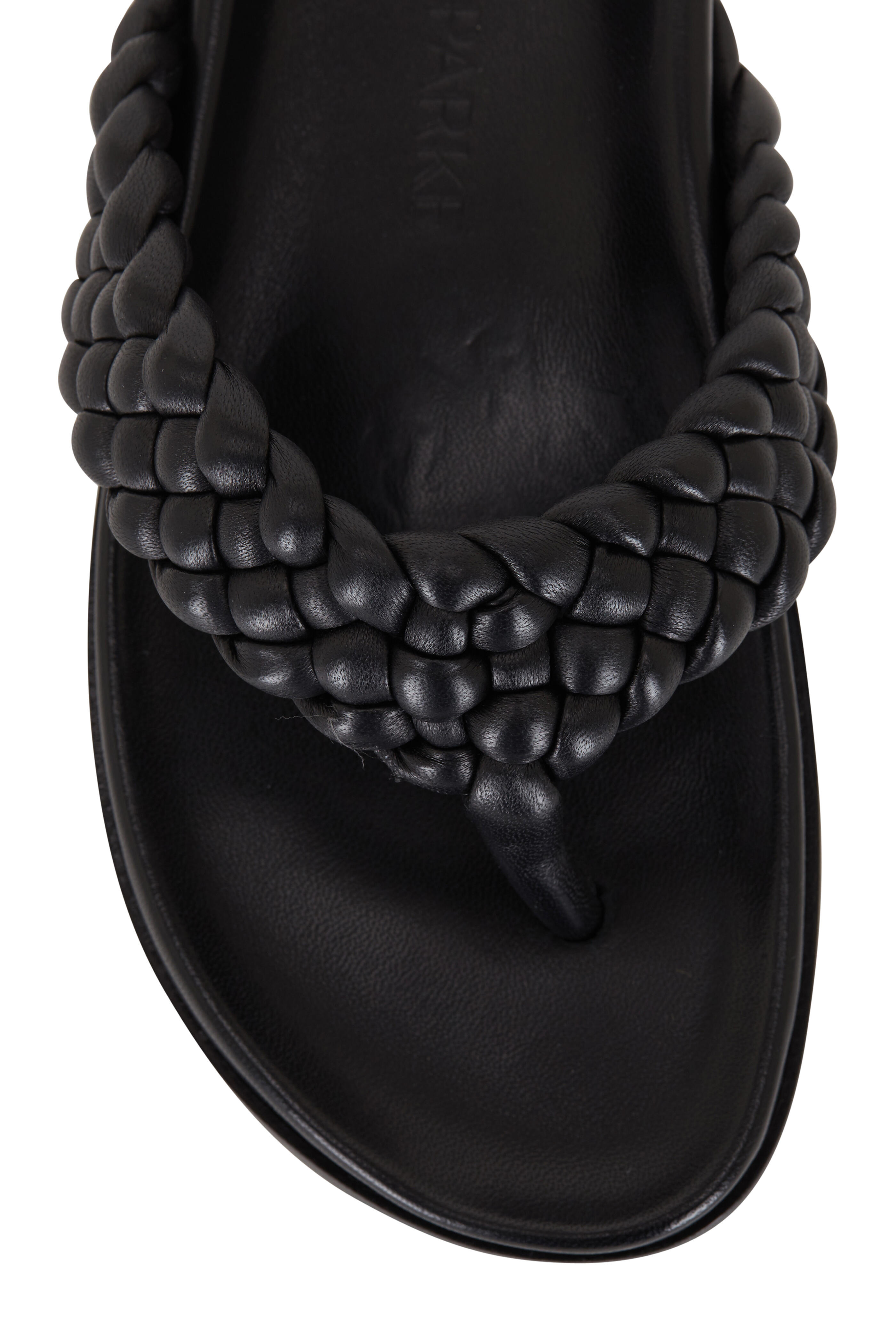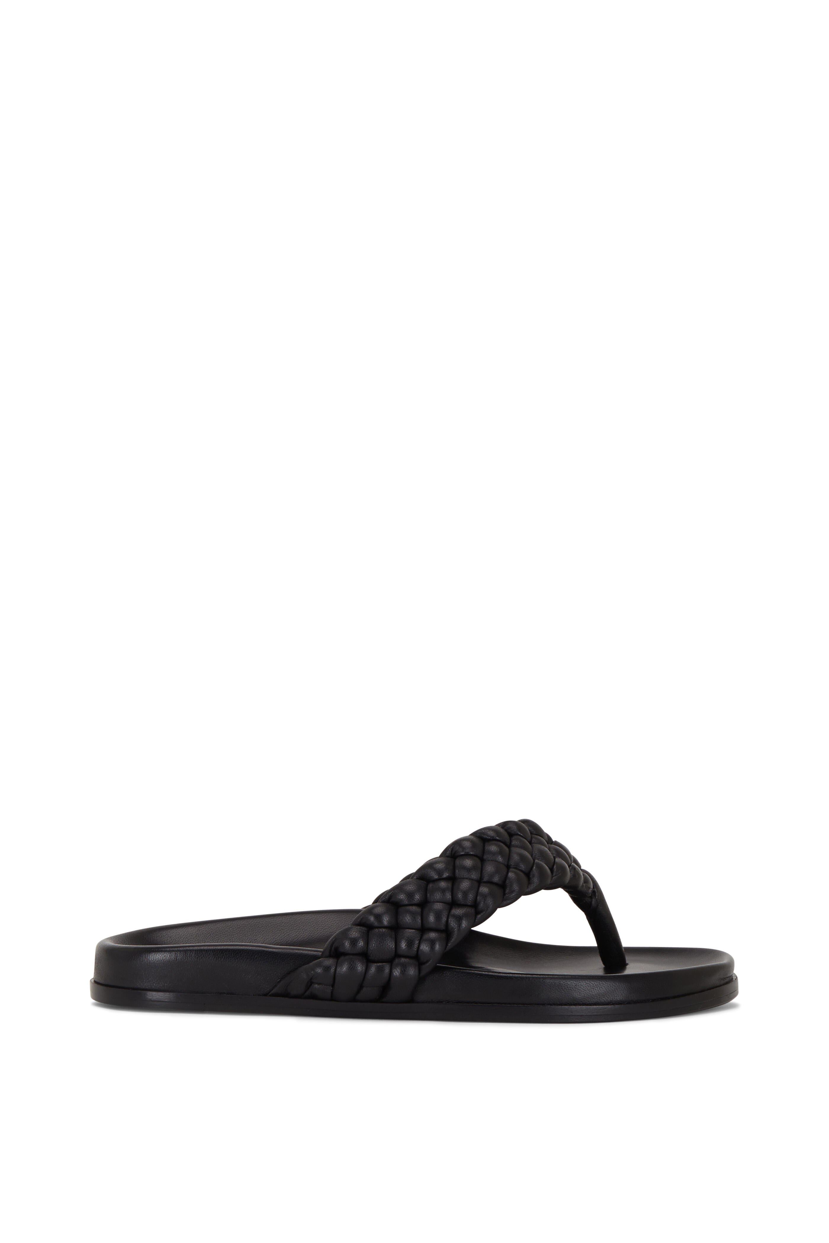 Leather upper. Open, round toe; thong strap. Slide on style. Molded foot bed. Made in Italy.