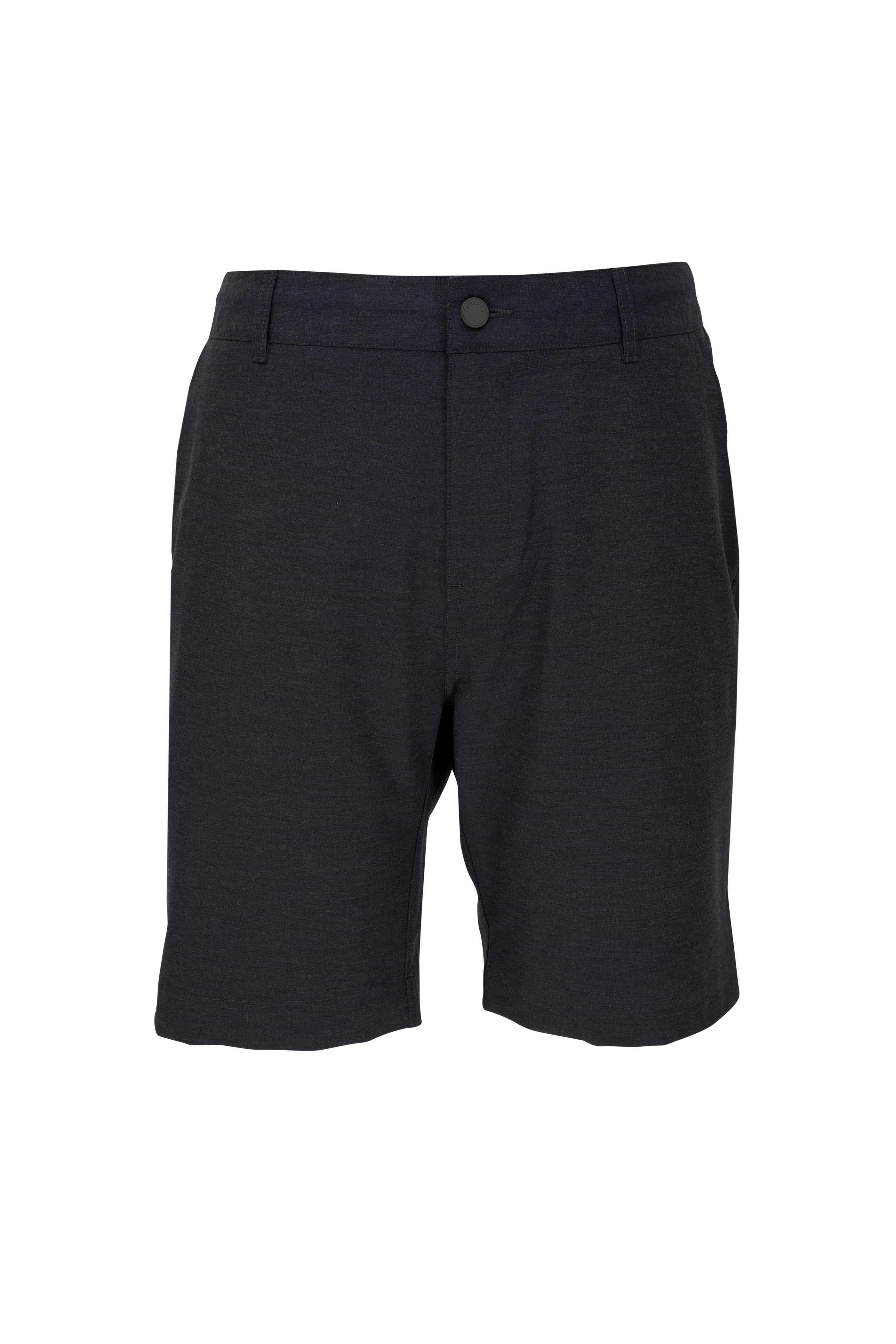 Banded waist; belt loops. Side slip pockets; back zip welt pocket. Imported. Color: Charcoal Gray. 9" inseam. 75% recycled polyester, 17% cotton, 8% spandex. Machine wash.