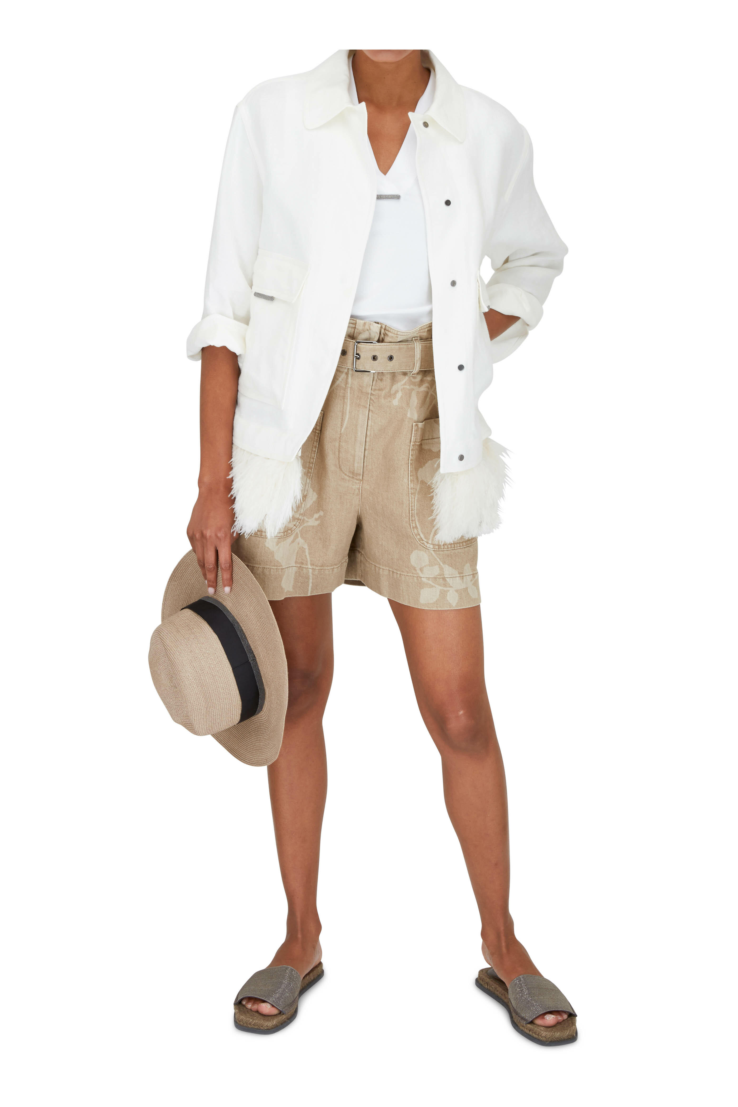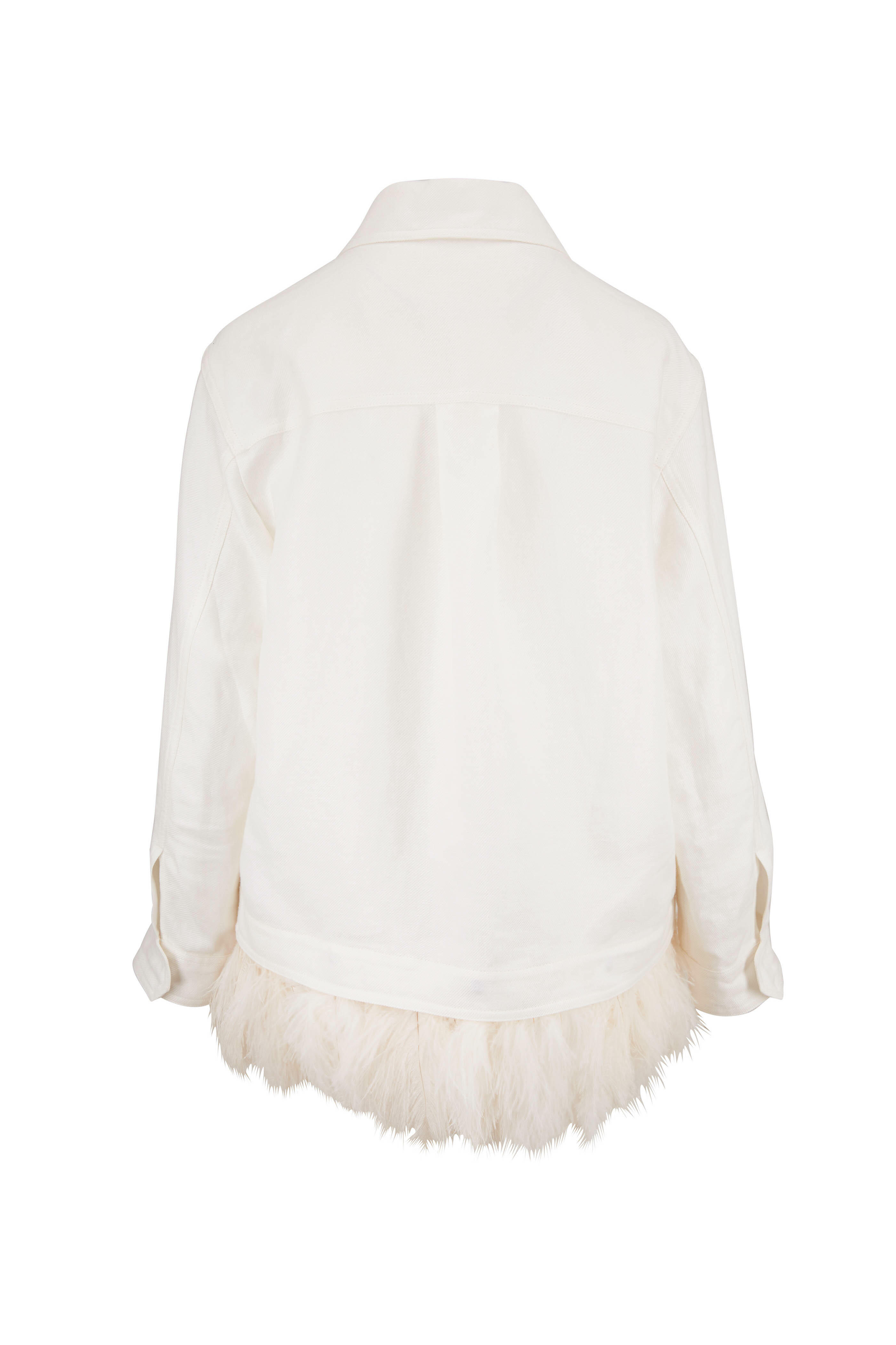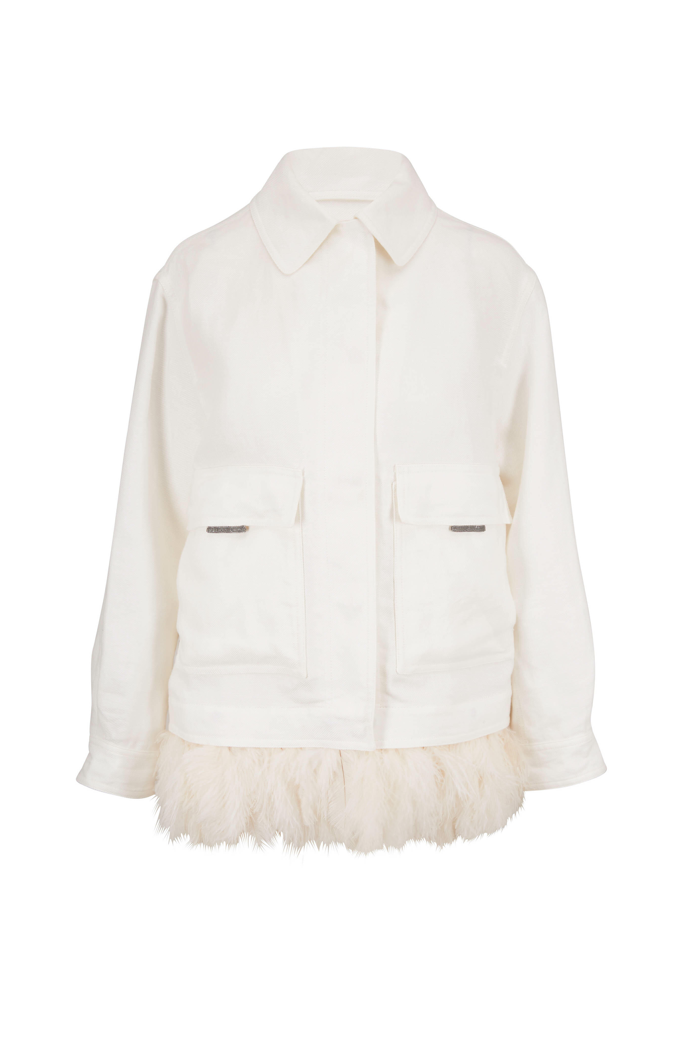 Spread collar. Two front patch pockets with flaps with monili detail. Two side pockets. Detachable ostrich feathers hem. Made in Italy. 100% linen ; lining: 74% acetate, 26% silk. Dry clean.