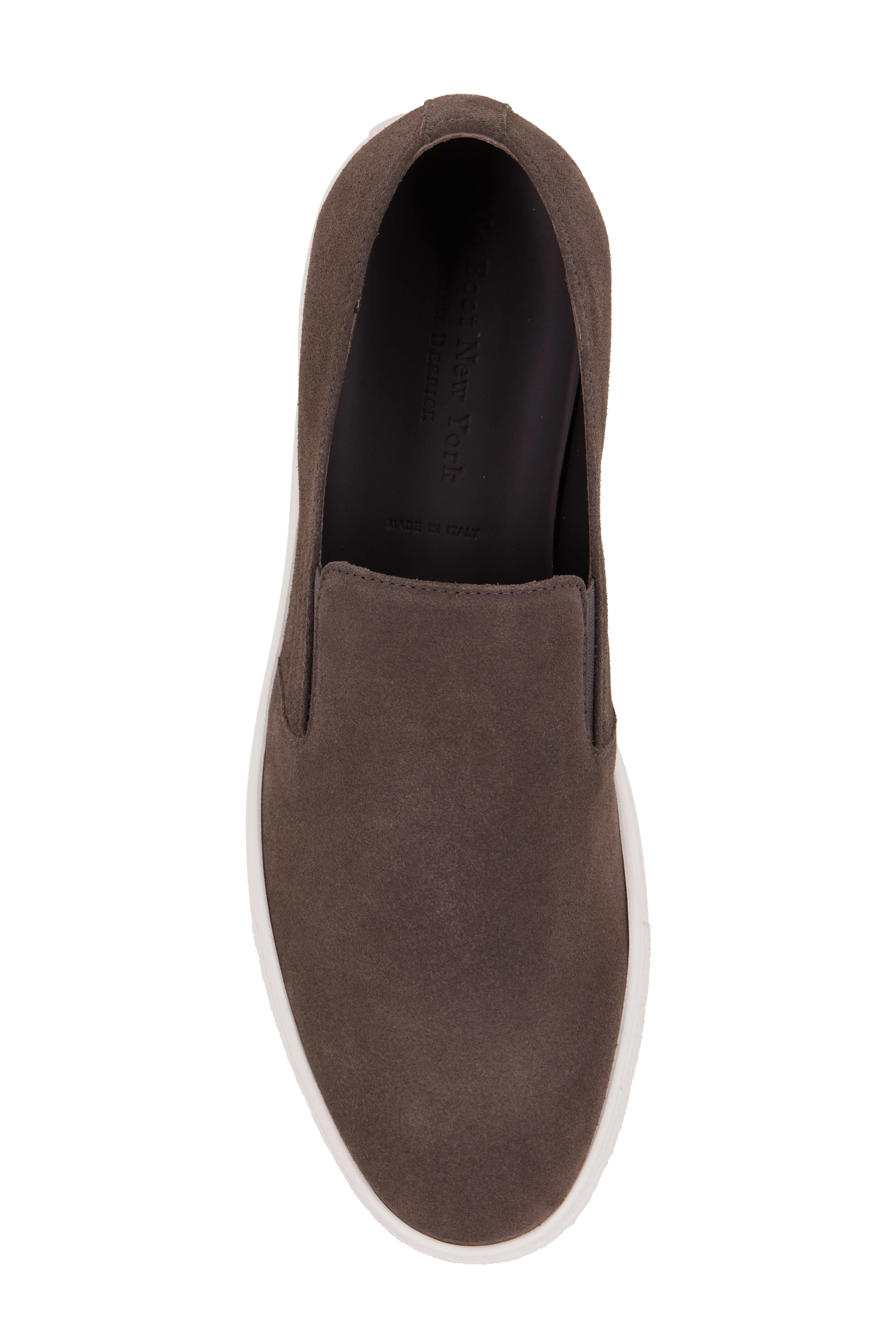 Suede upper. Round roe. Slips on. Rubber sole. Made in Italy.
