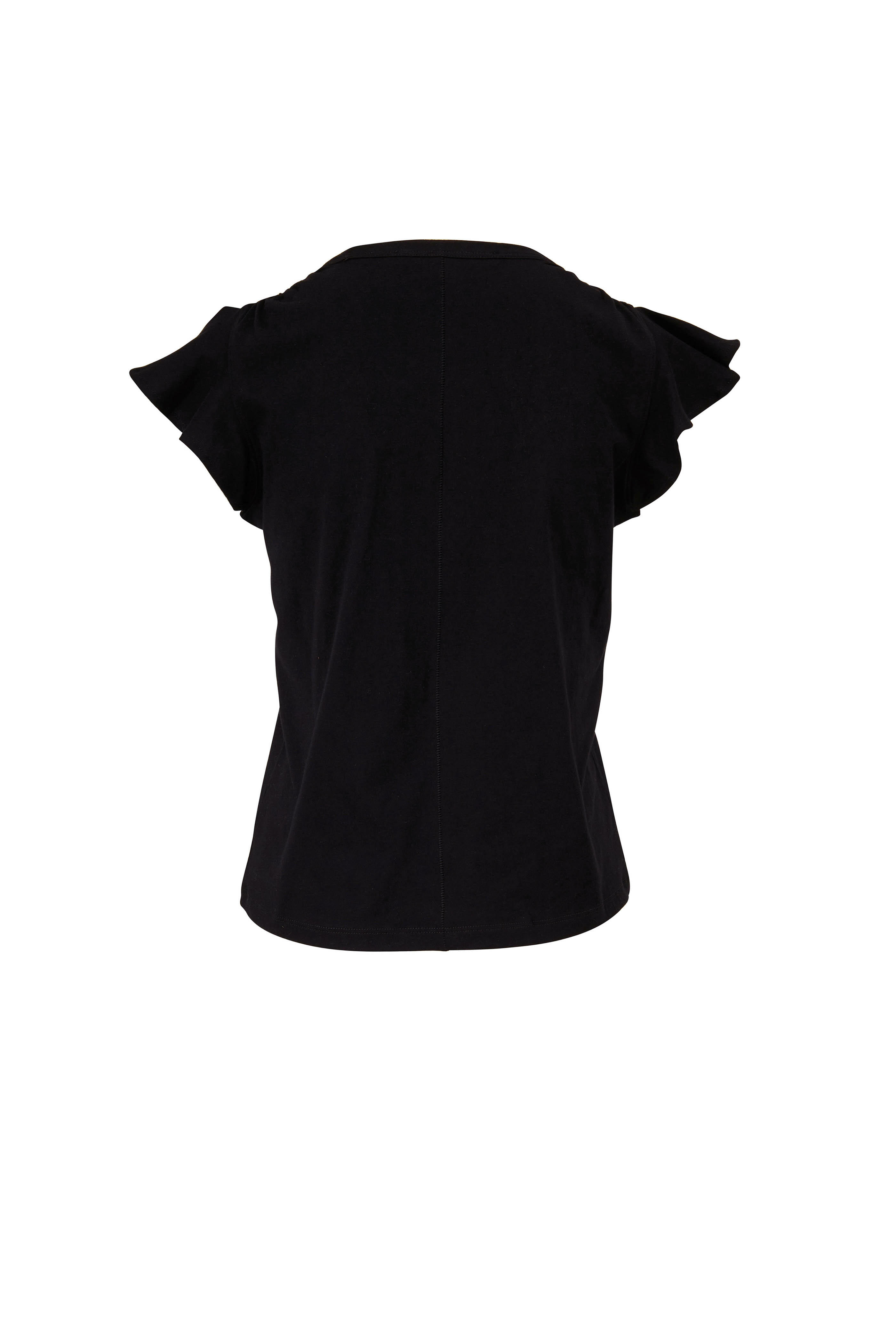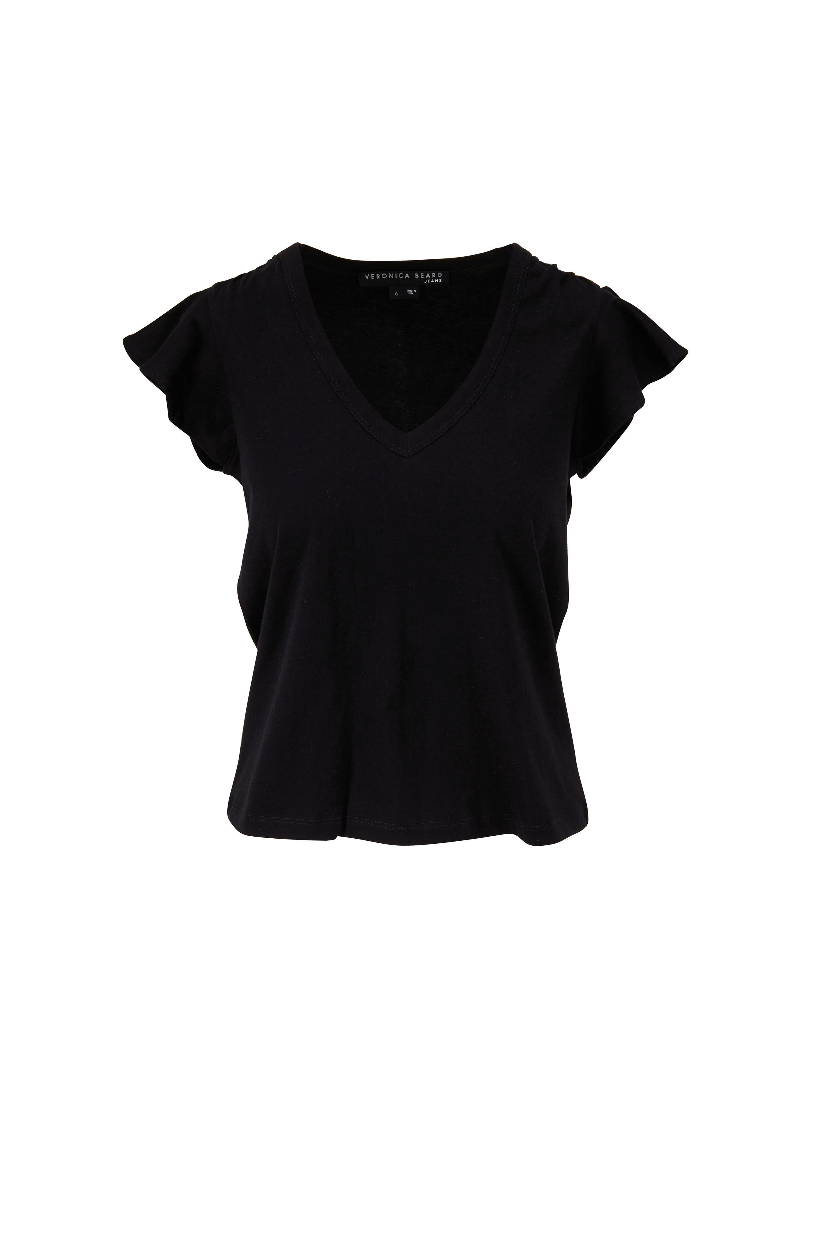 V-neckline. Flutter sleeves. Made in Peru. 100% pima cotton. Machine wash.