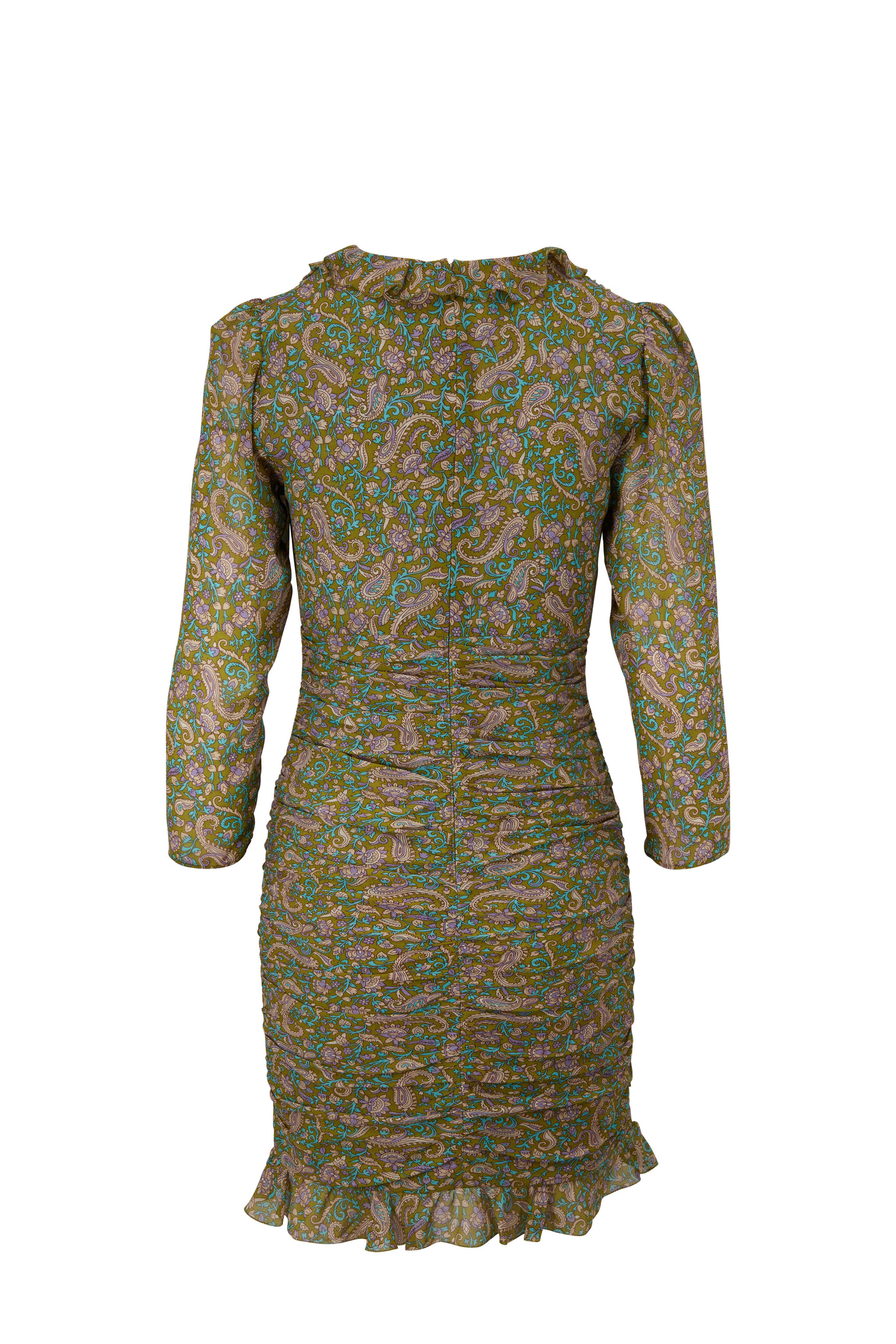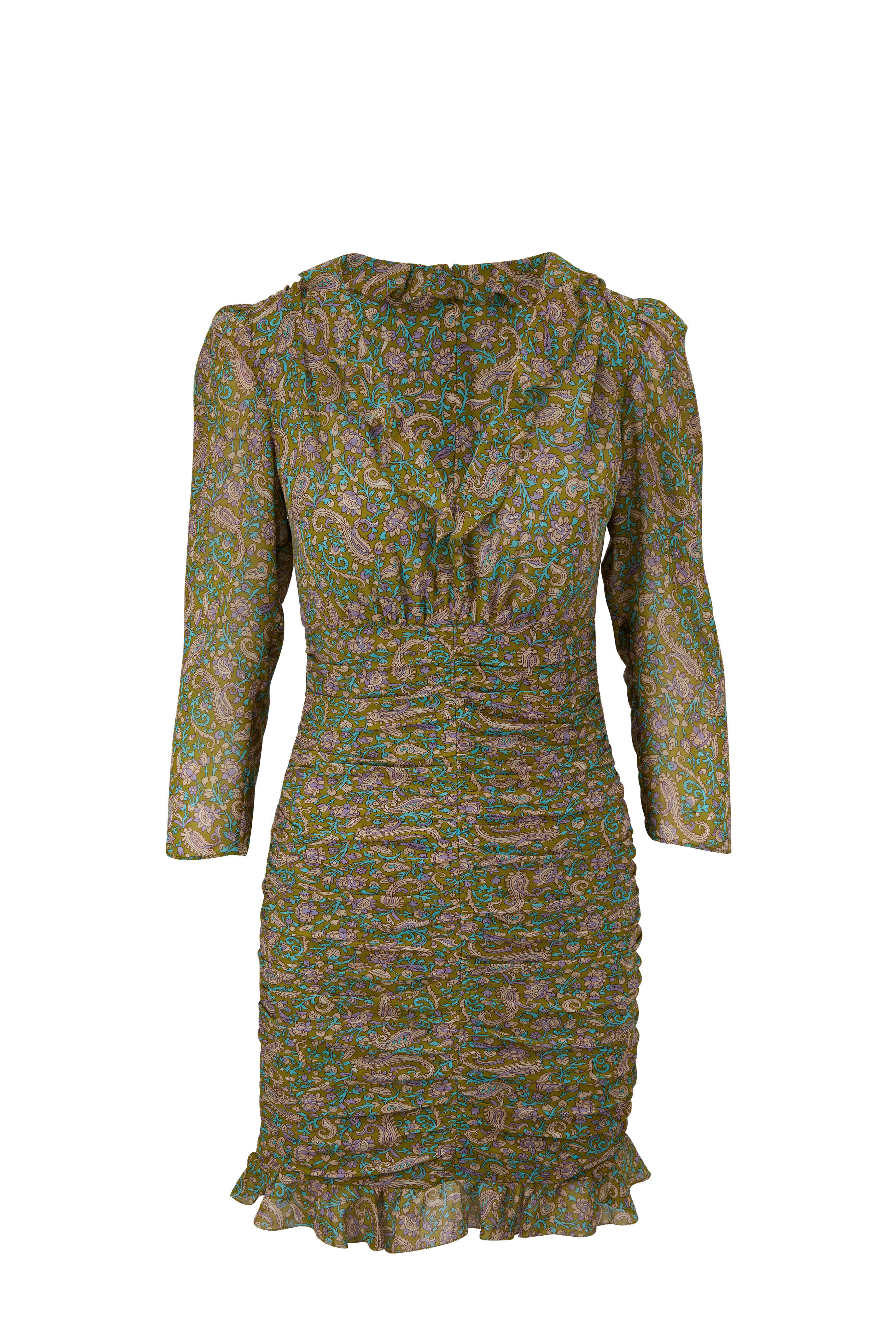 V-neckline; ruffle detail. Concealed back zip. Three-quarter sleeves. Ruffle hem. Ruched bodice. Imported. 35.5" shoulder to hem. 100% silk. Dry clean.