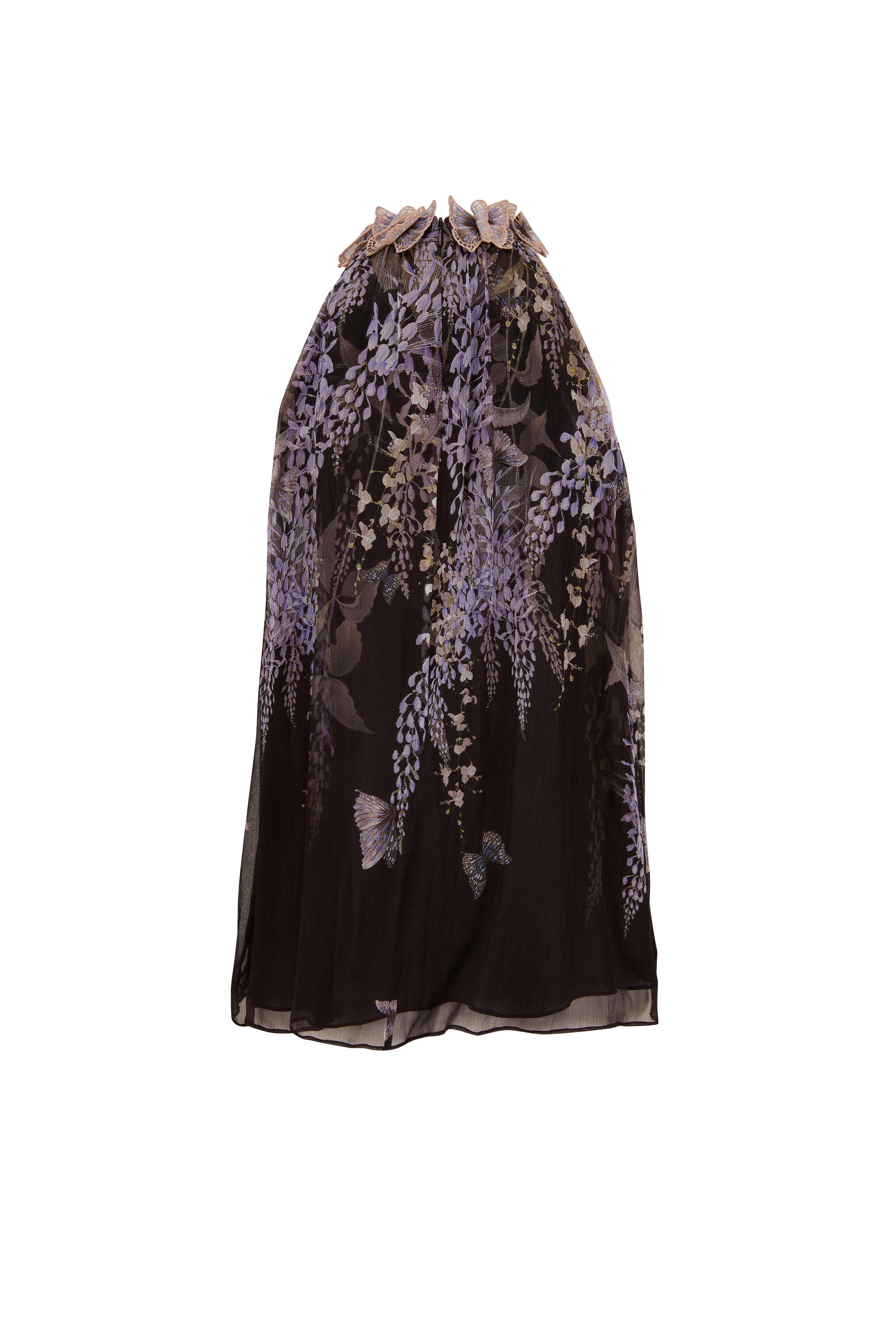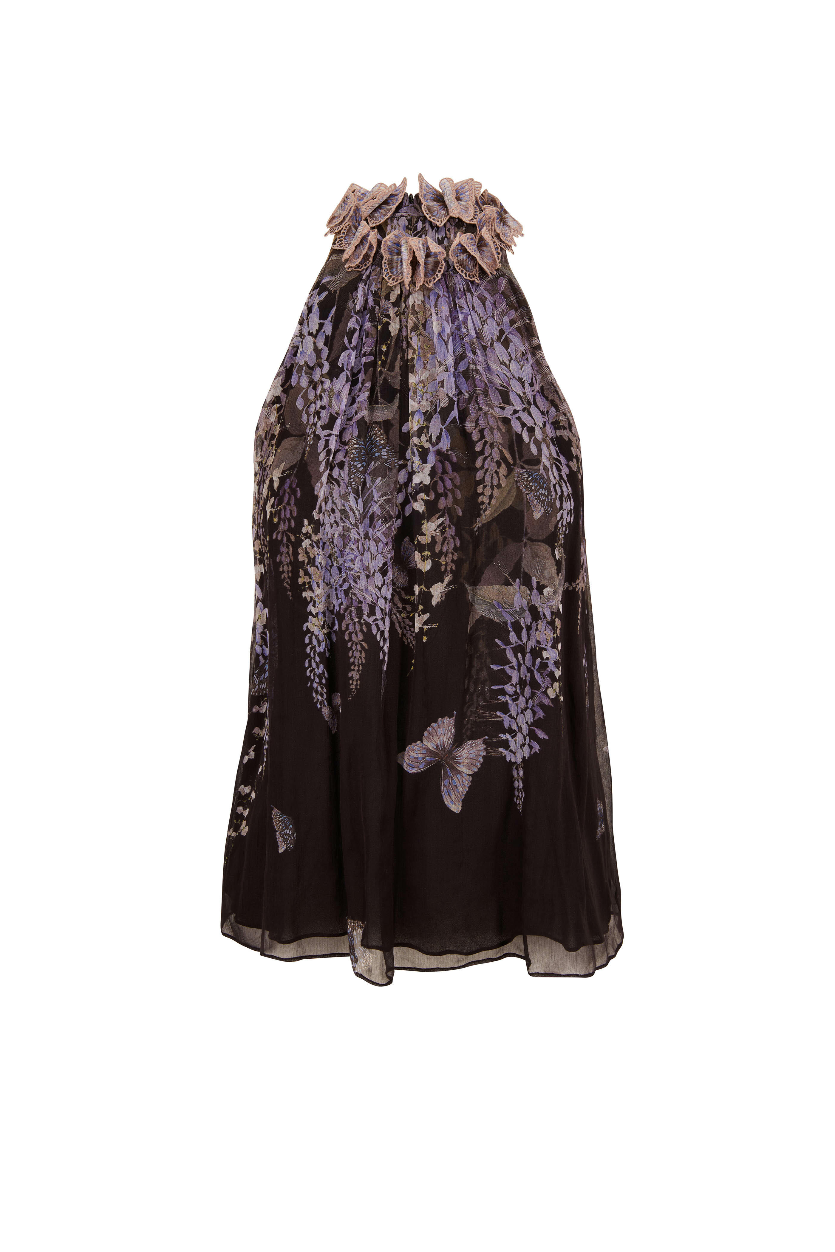 - High-neck; embroidered butterfly detailing