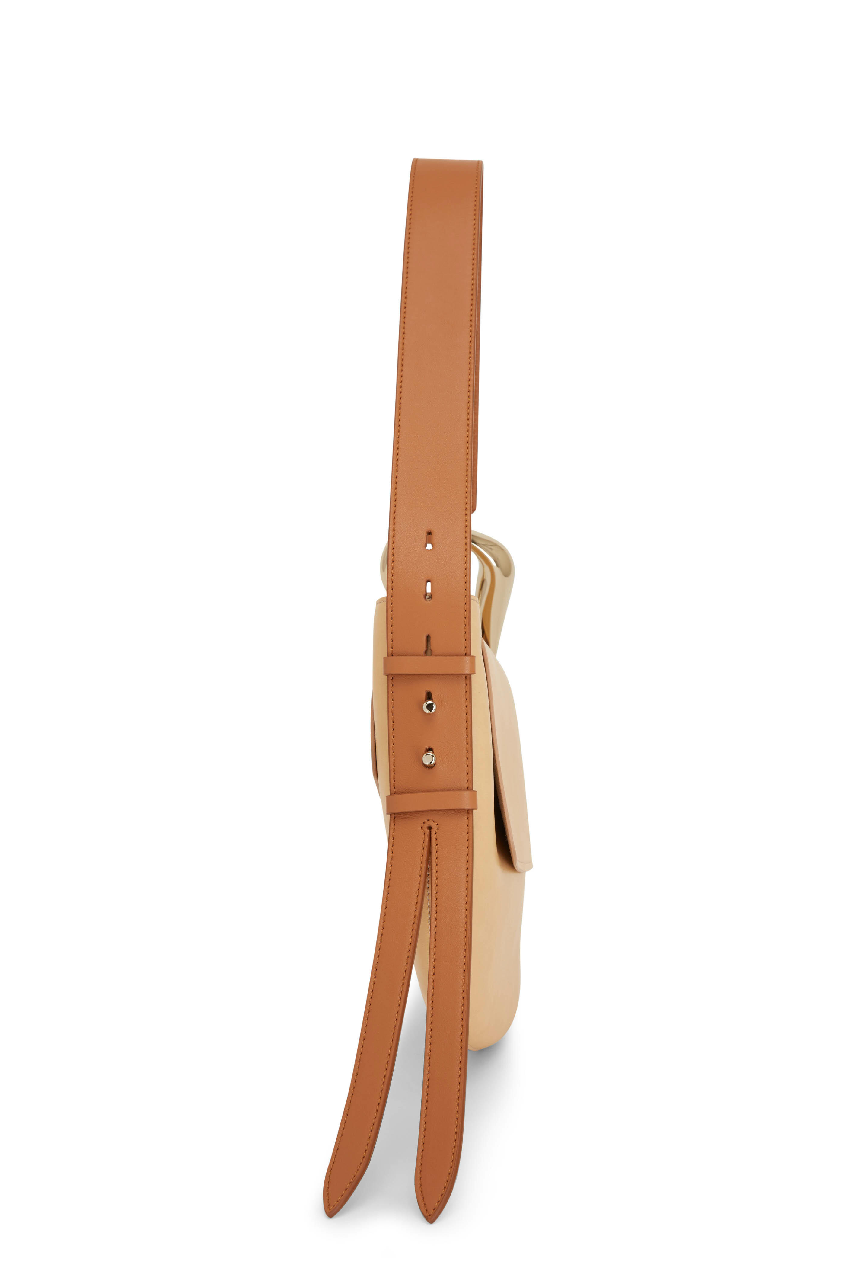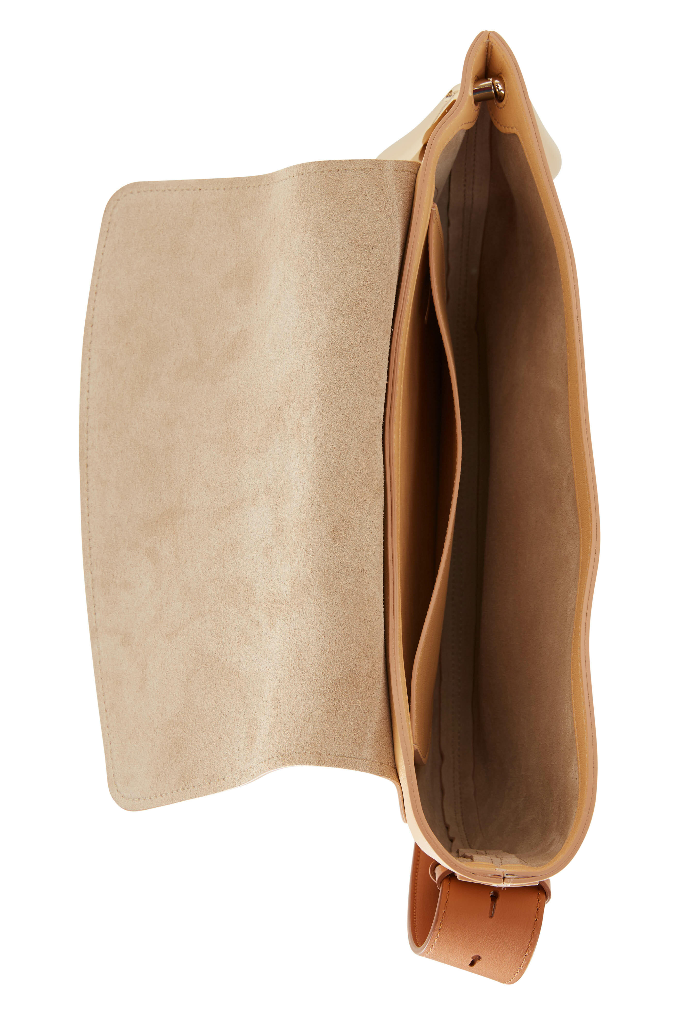Calf leather. Adjustable shoulder strap; large metal ring detail. Front flap; magnetic closure. Internal slip pocket. Suede lining. Made in Spain. Width: 13.8". Height: 9.8". Max. strap drop: 14.2".