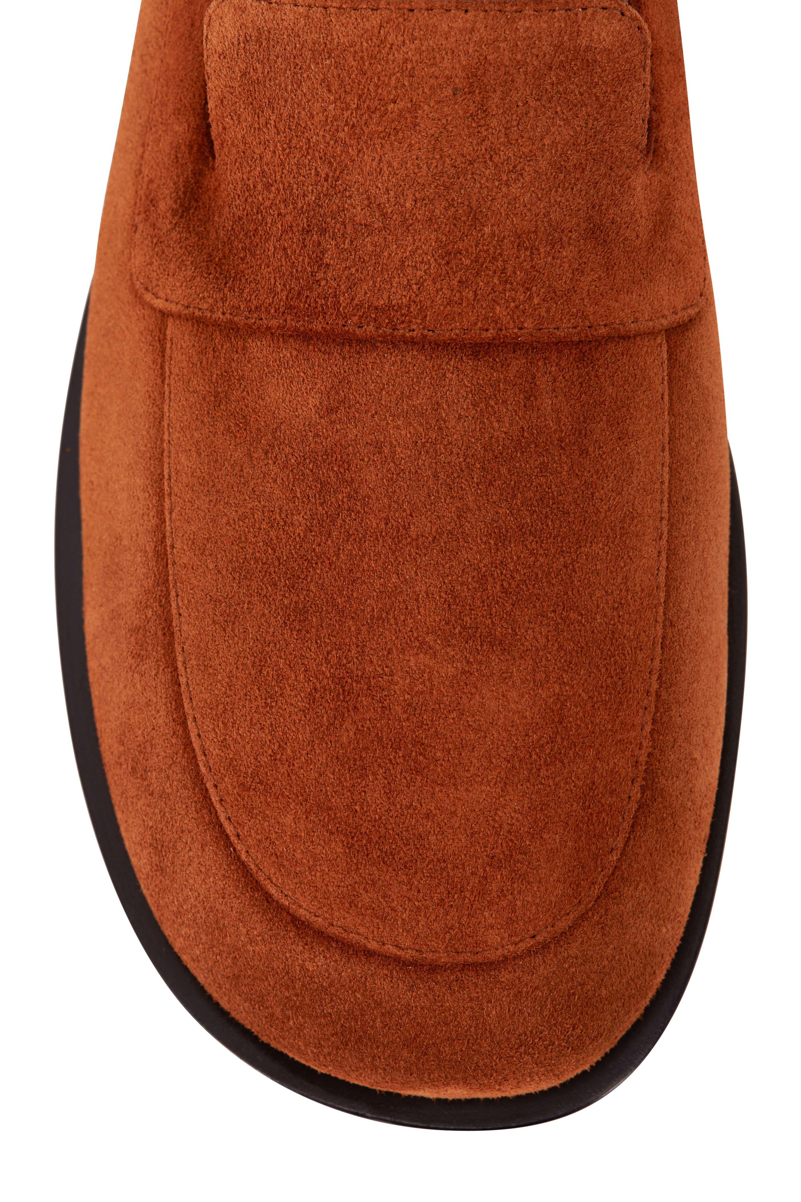 Suede upper. Square, apron toe. Slip on style. Notched vamp. Stacked heel. Rubber sole. Made in Italy.