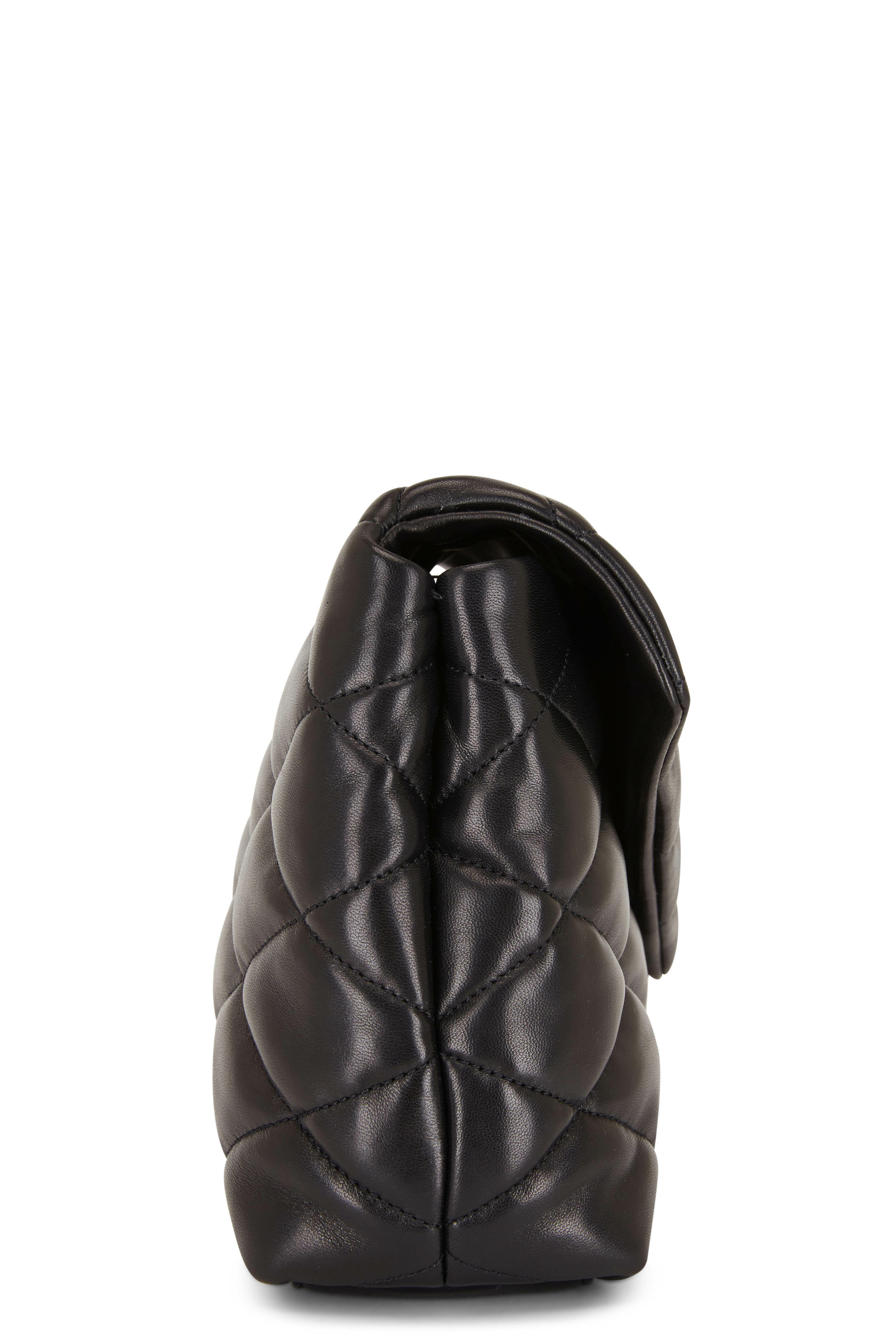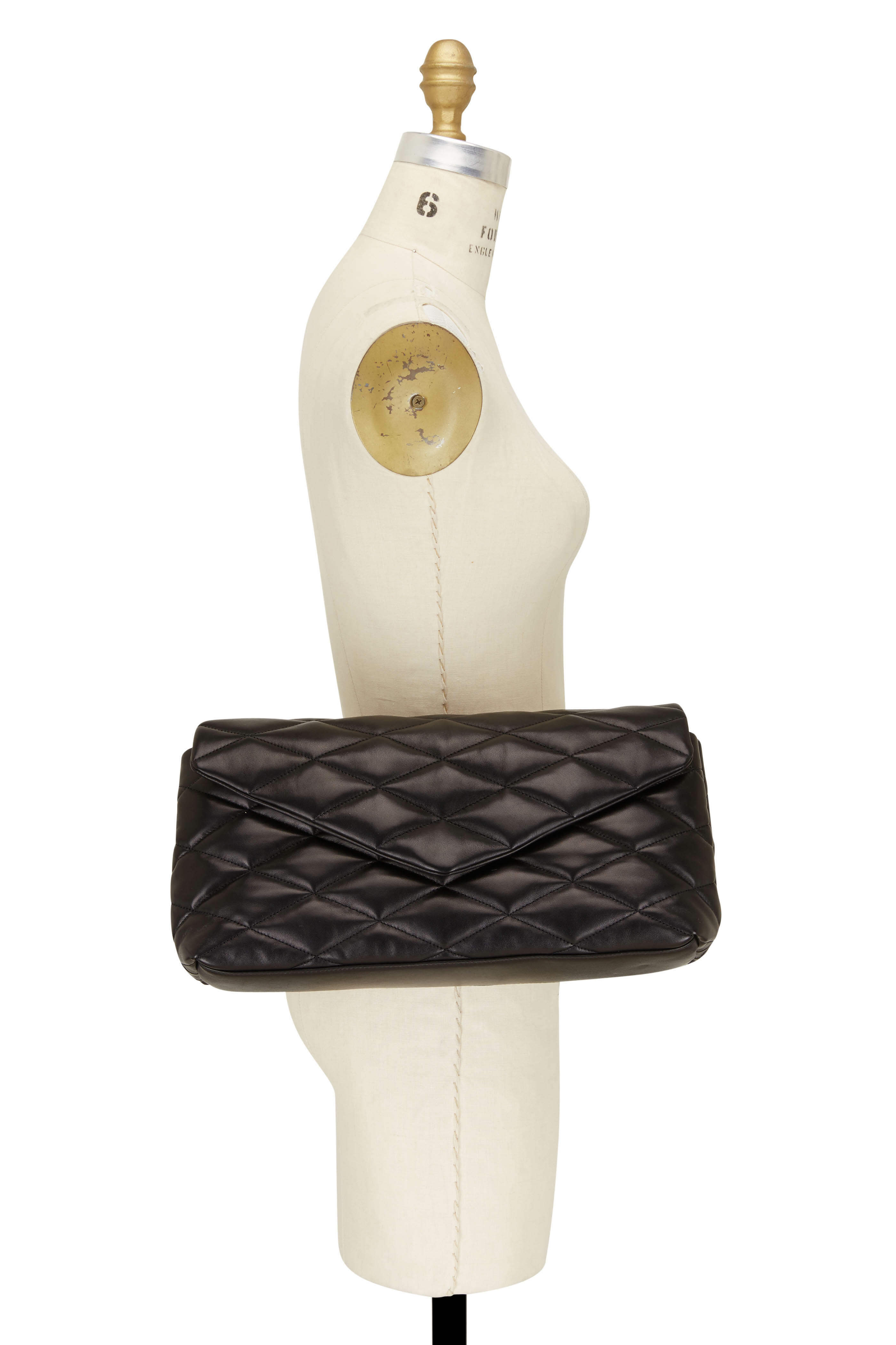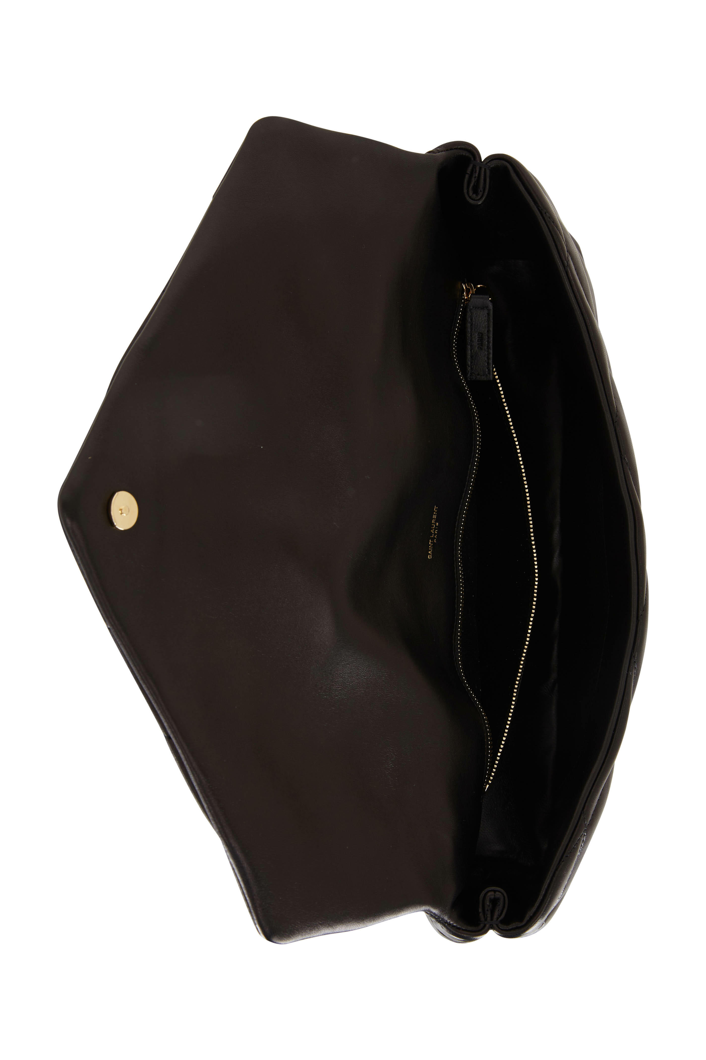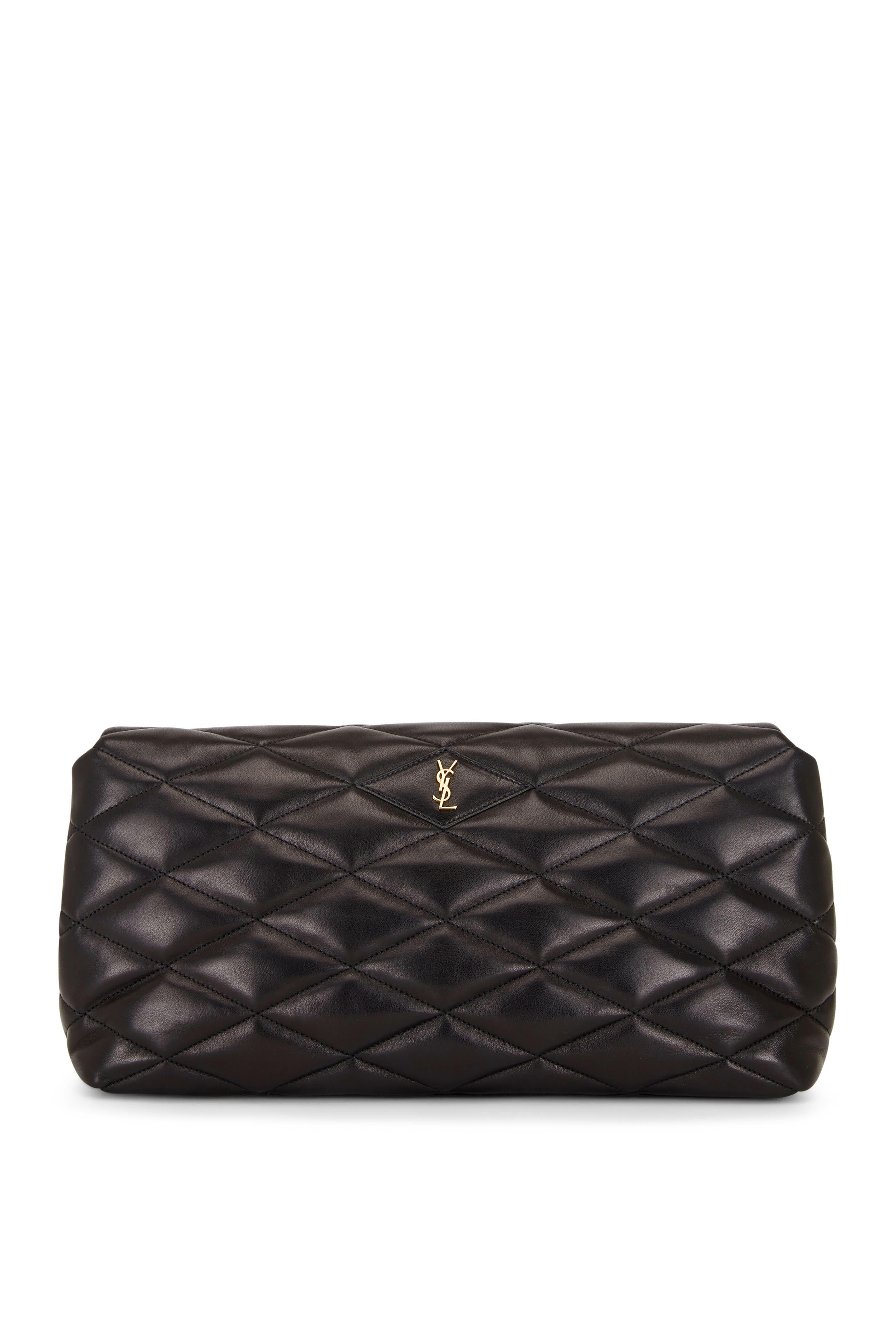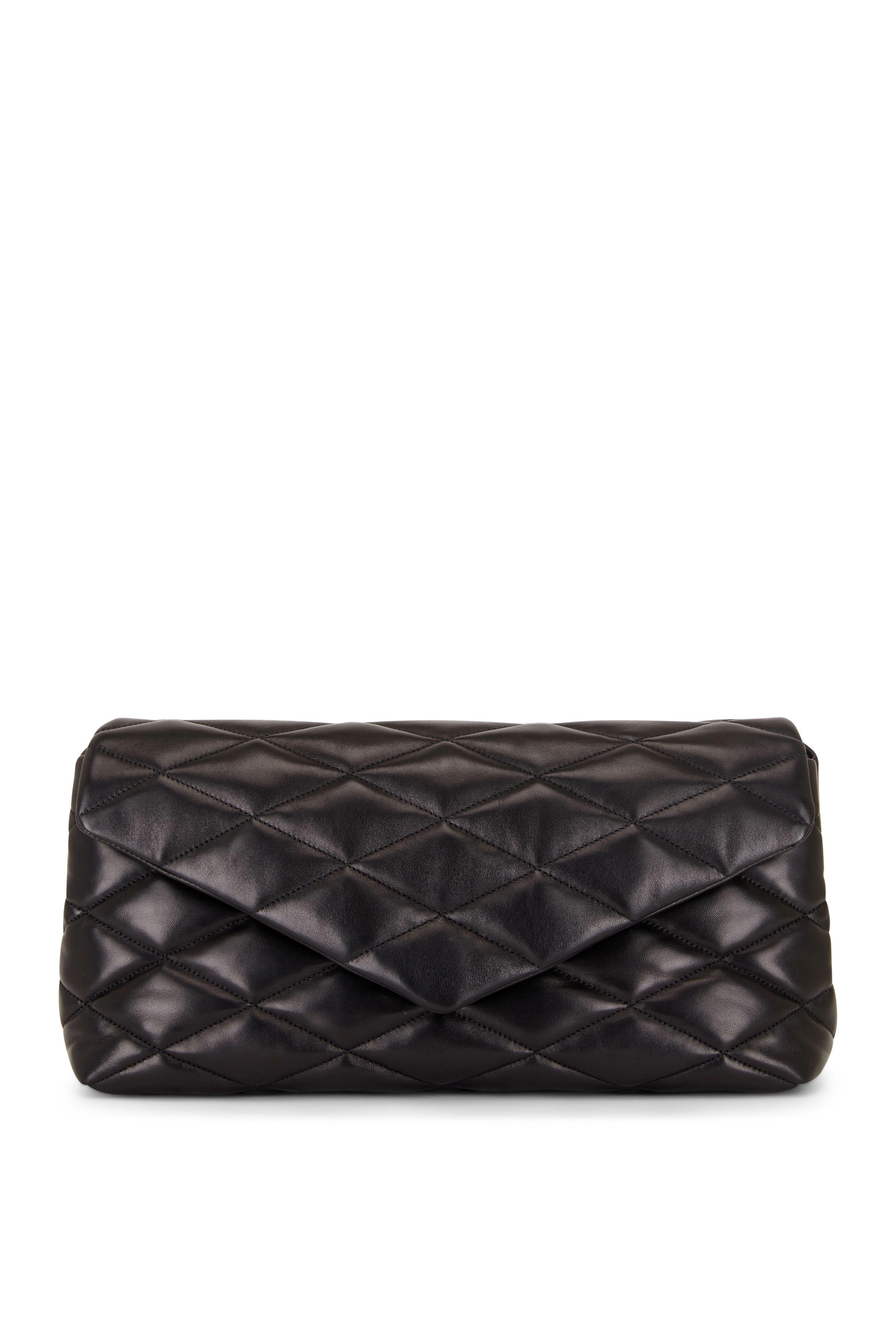 Smooth quilted leather. Front flap; magnetic closure. Small gold-tone logo detail at back. Made in Italy. Height: 7". Width: 14". Depth: 4".