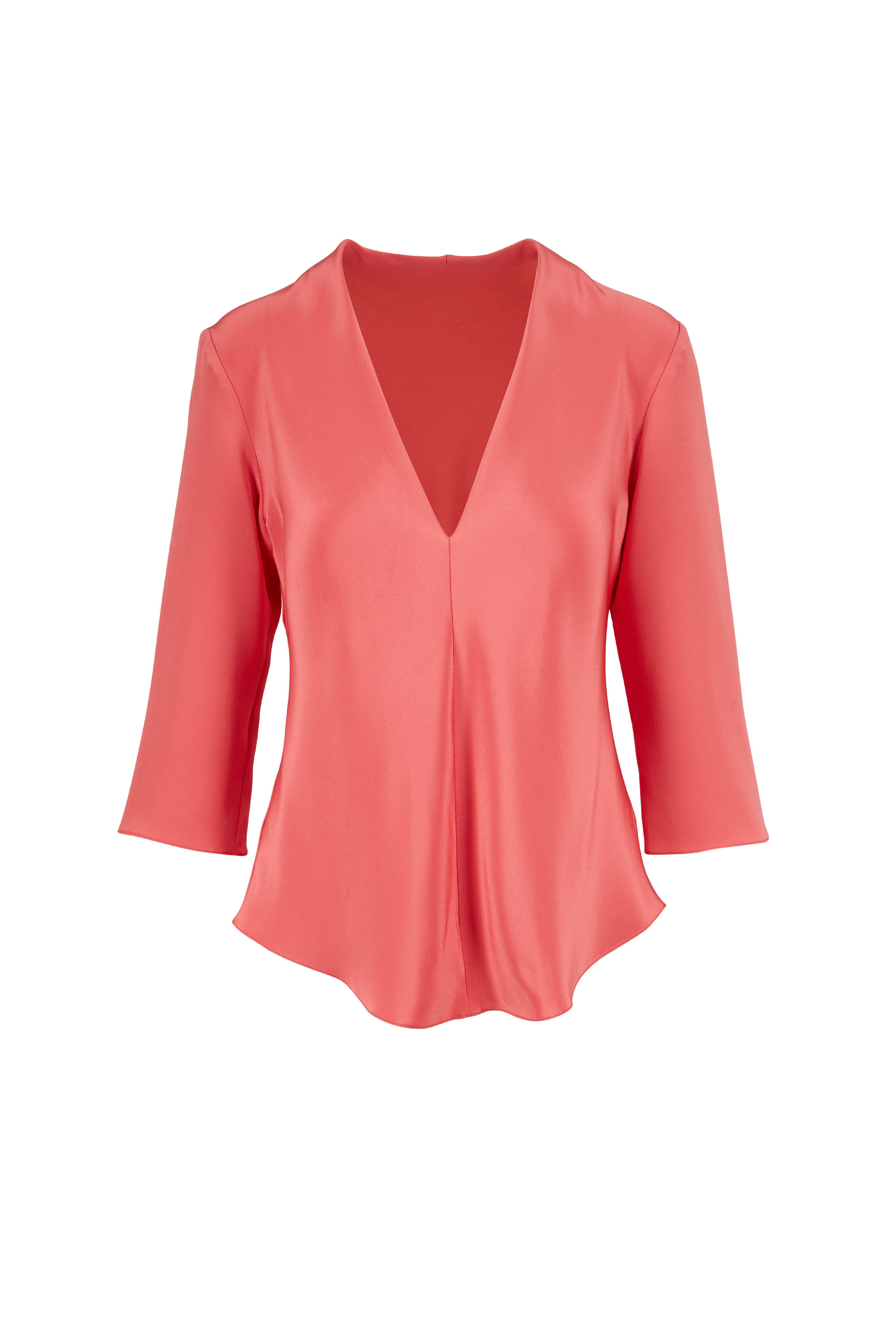 V-neckline. Three-quarter sleeves. Made in the USA. 100% silk. Dry clean.