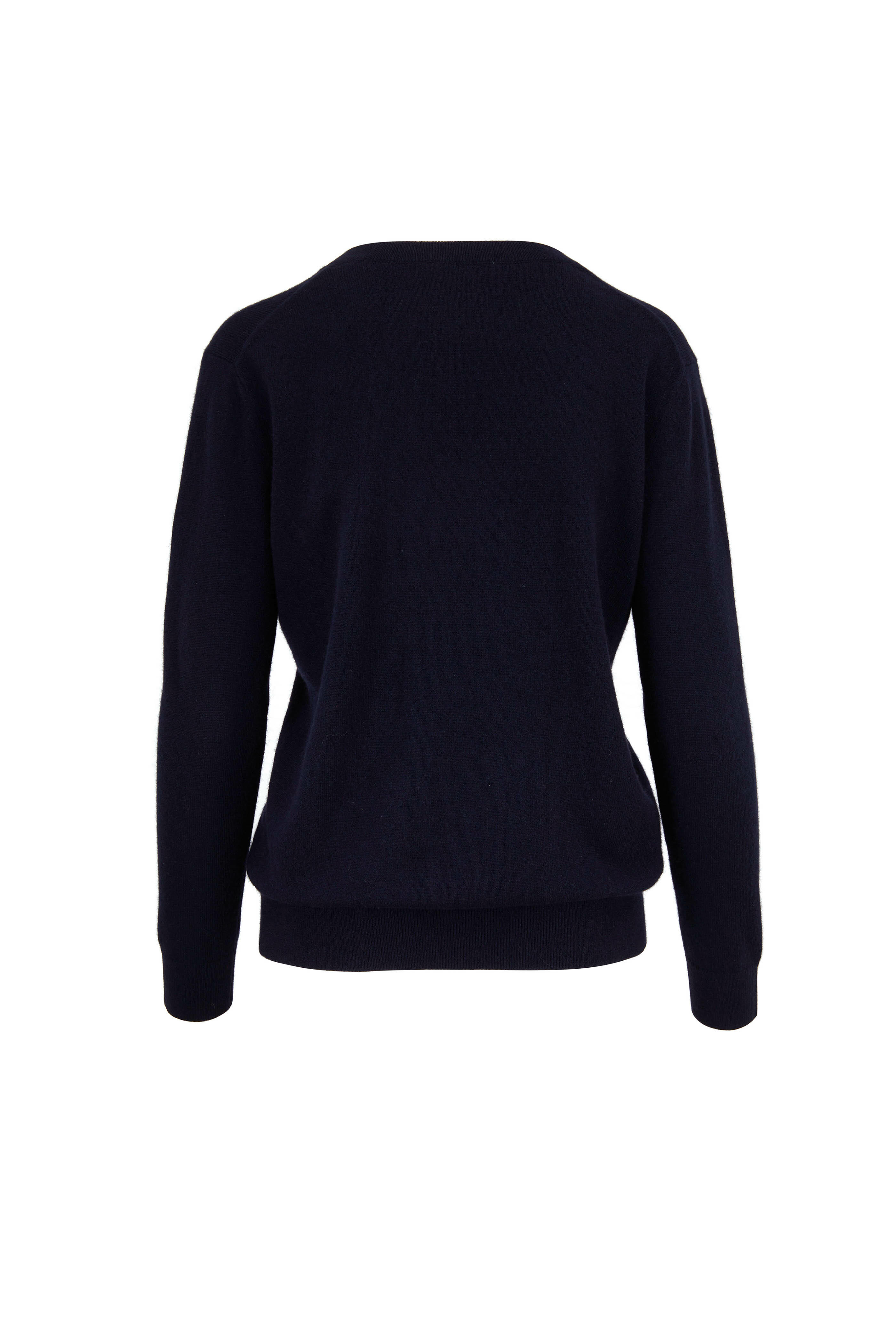 V-neckline. Ribbed trim. Imported. 100% cashmere. Hand wash.
