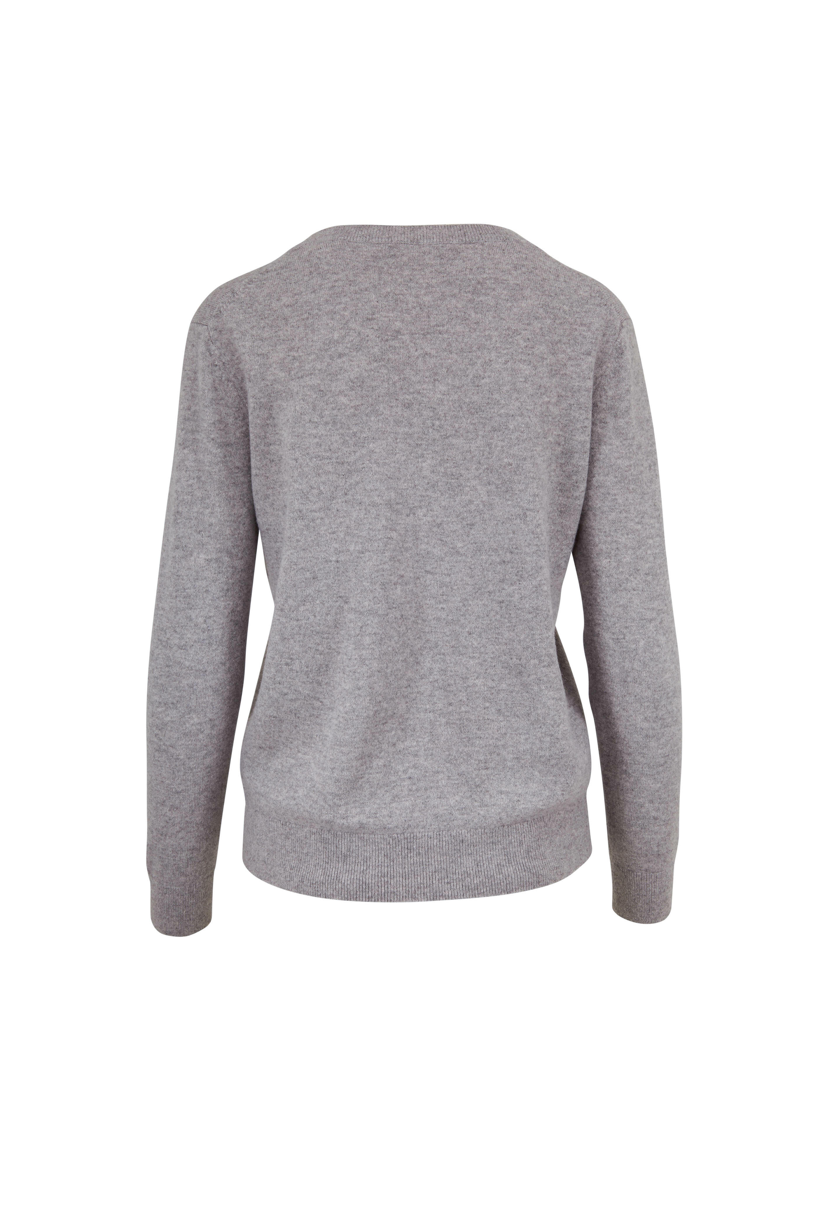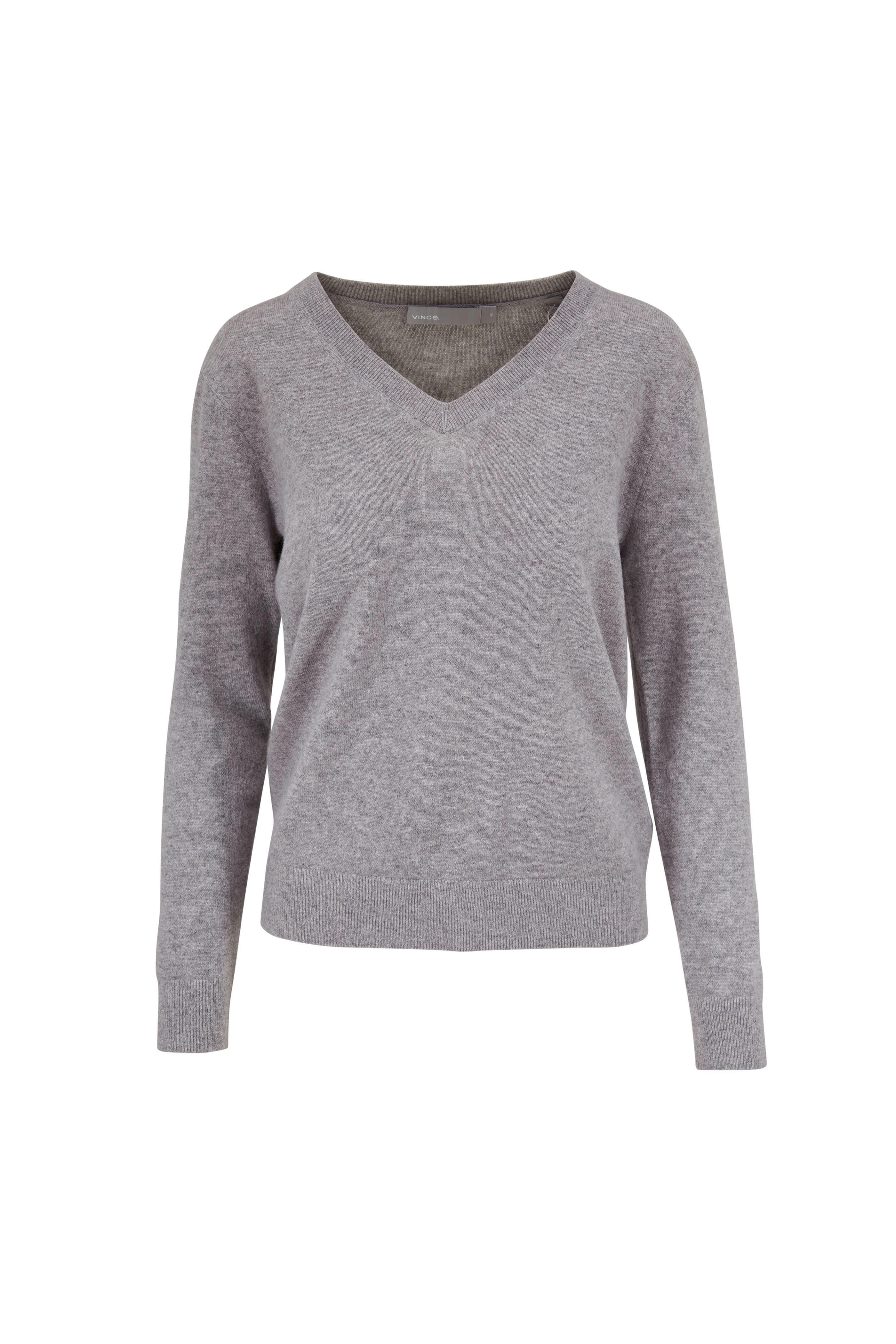 V-neckline. Ribbed trim. Imported. 100% cashmere. Hand wash.