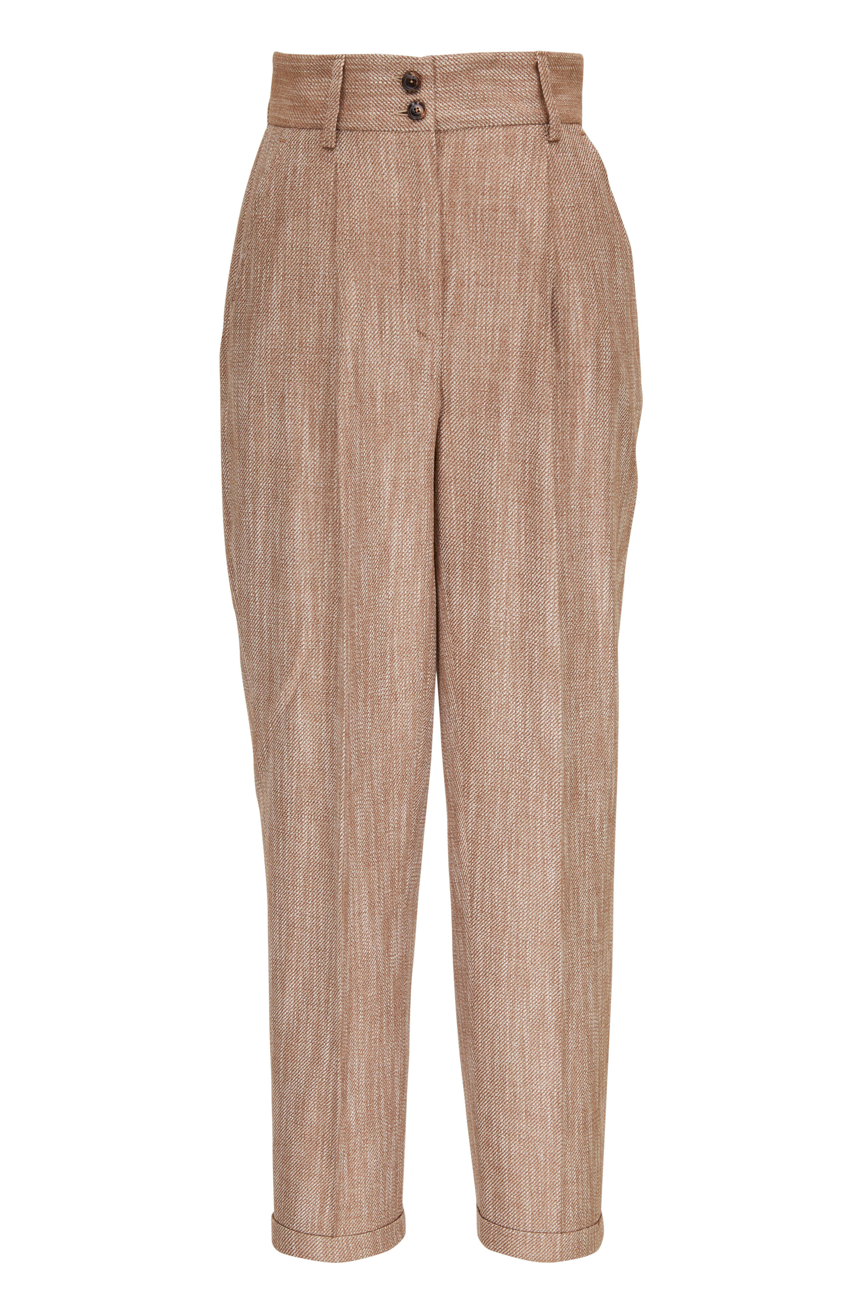 Linen/silk blend. Belt loops. Zip fly; double button closure. Back besom pockets. Folded cuffs. Made in Italy. Dry clean.