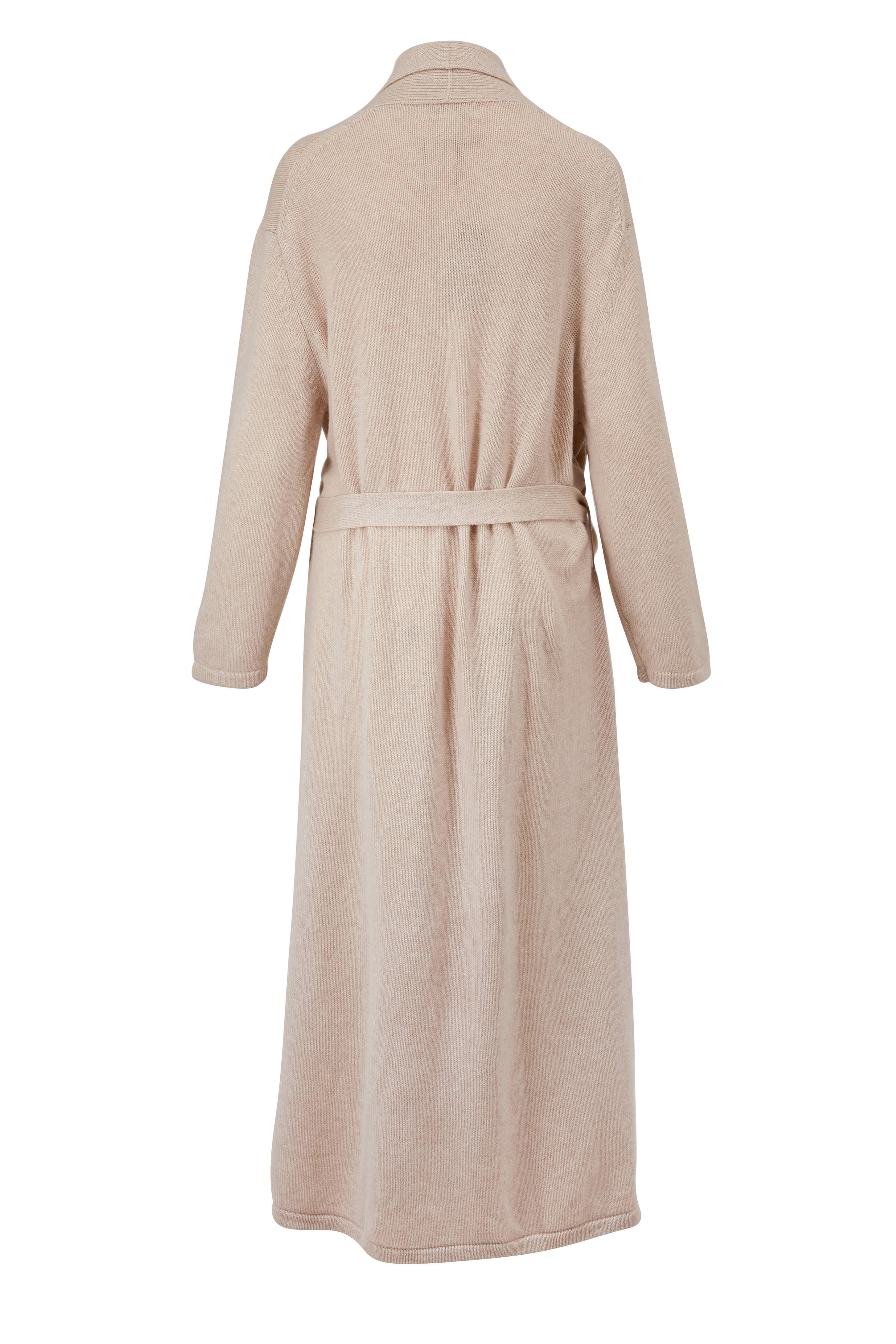 Shawl collar. Self-tie. Lower patch pockets. 100% cashmere.