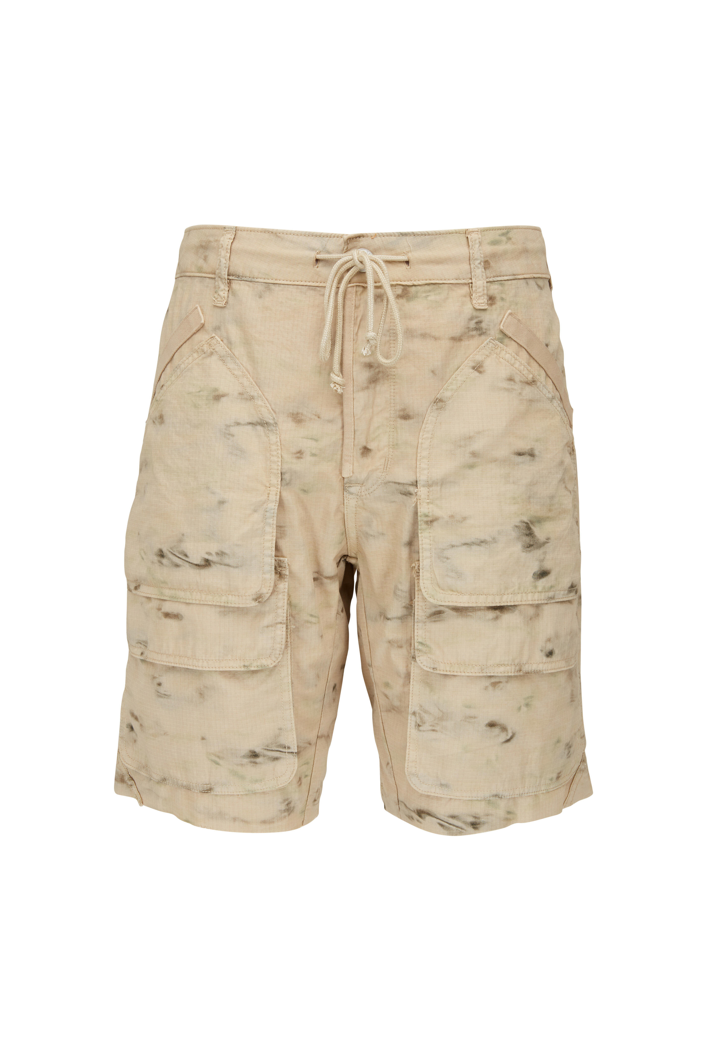 Drawstring waist; belt loops. Zip fly; button closure. Front patch pockets; lower and back flap pockets. Raw edge hem. Imported. Color: Sea Camo. 9½" inseam. 100% cotton. Machine wash.