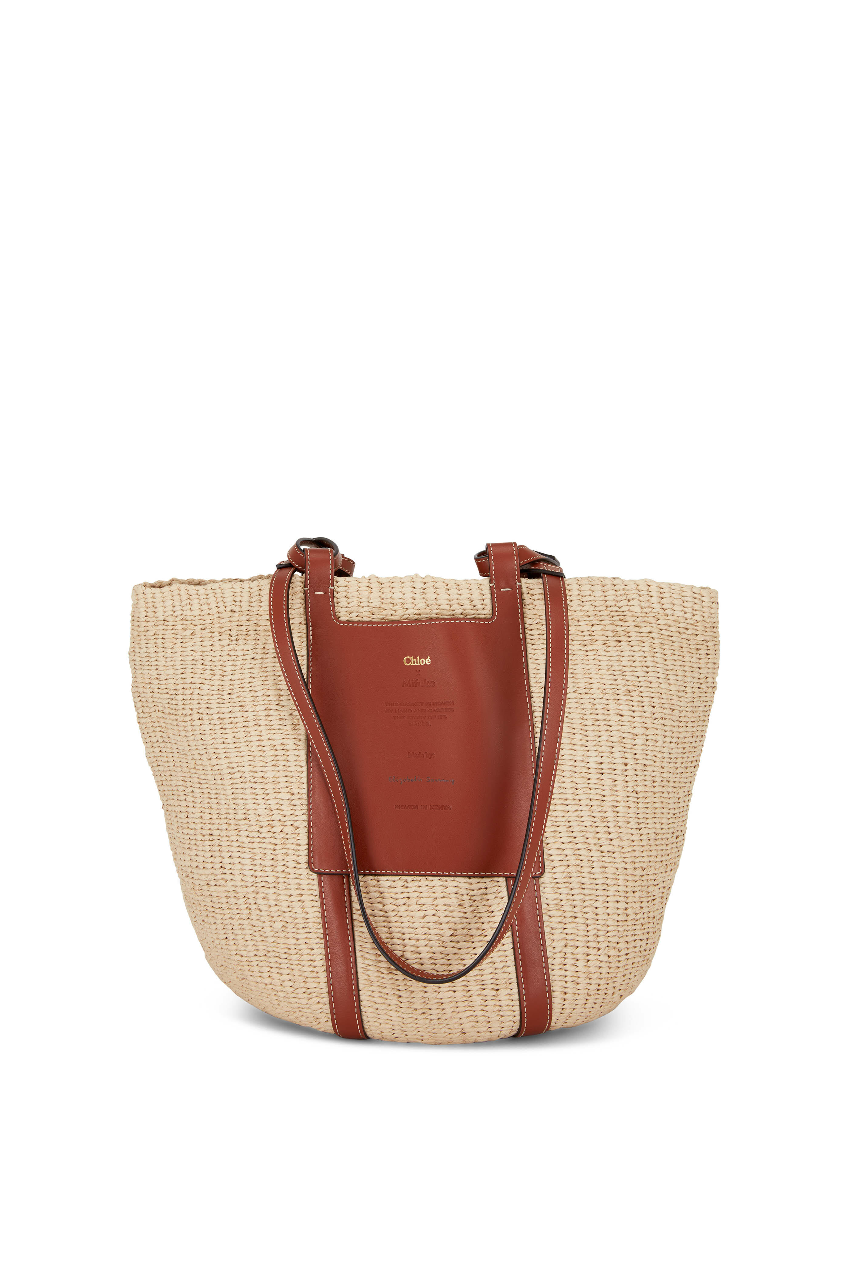 Fair trade paper and calf leather. Open top. Dual flat leather handles. Exterior leather patch doubles as slip pocket. One open compartment. Made in Kenya. Width: 11" (28 cm). Height: 18.9" (48 cm). Depth: 11" (28 cm). Strap drop: 14.2" (36 cm).