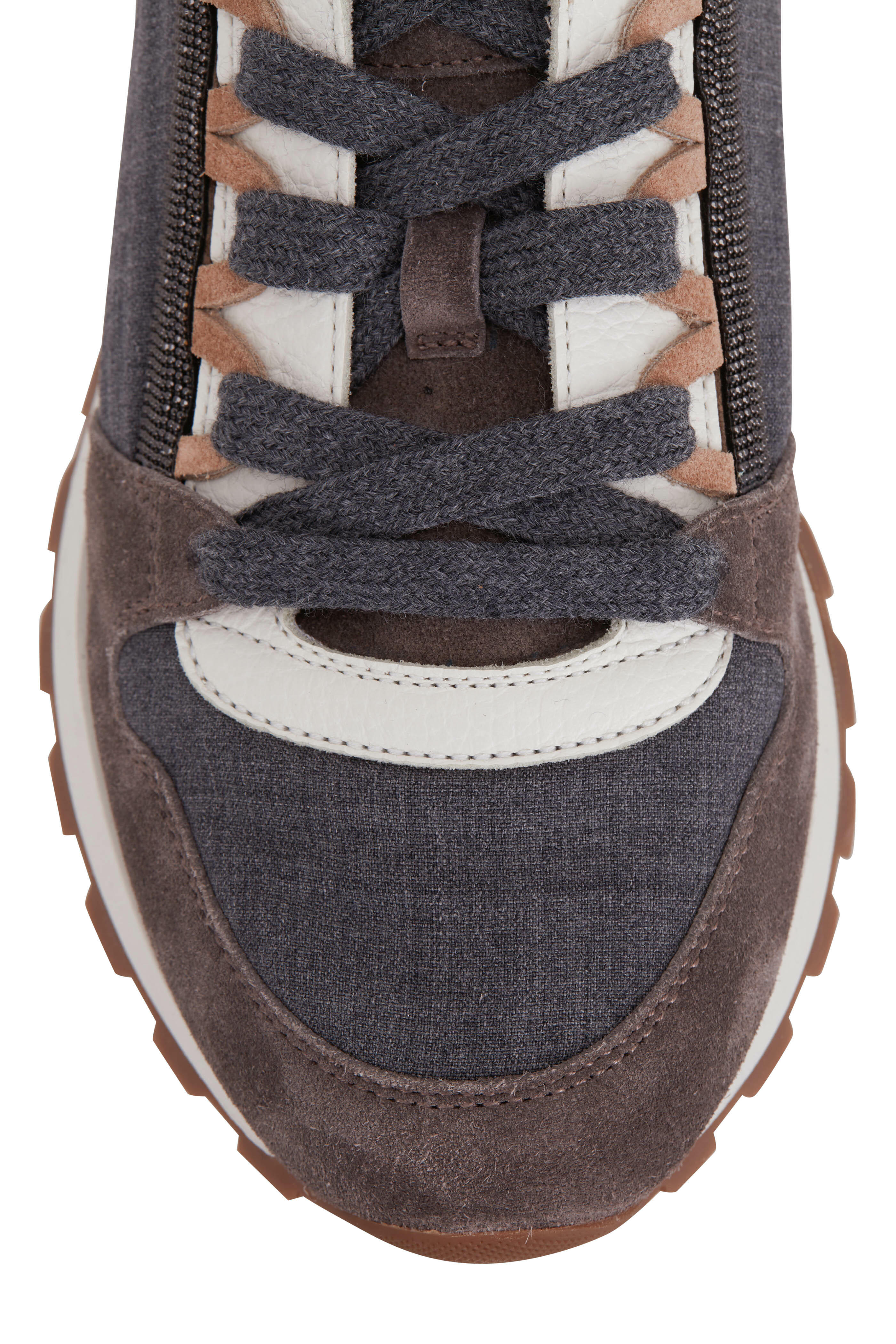 Suede, textile and leather upper. Round toe. Lace-up closure. Monili trim detailing. Textile lining; cushioned insole. Rubber sole. Made in Italy.