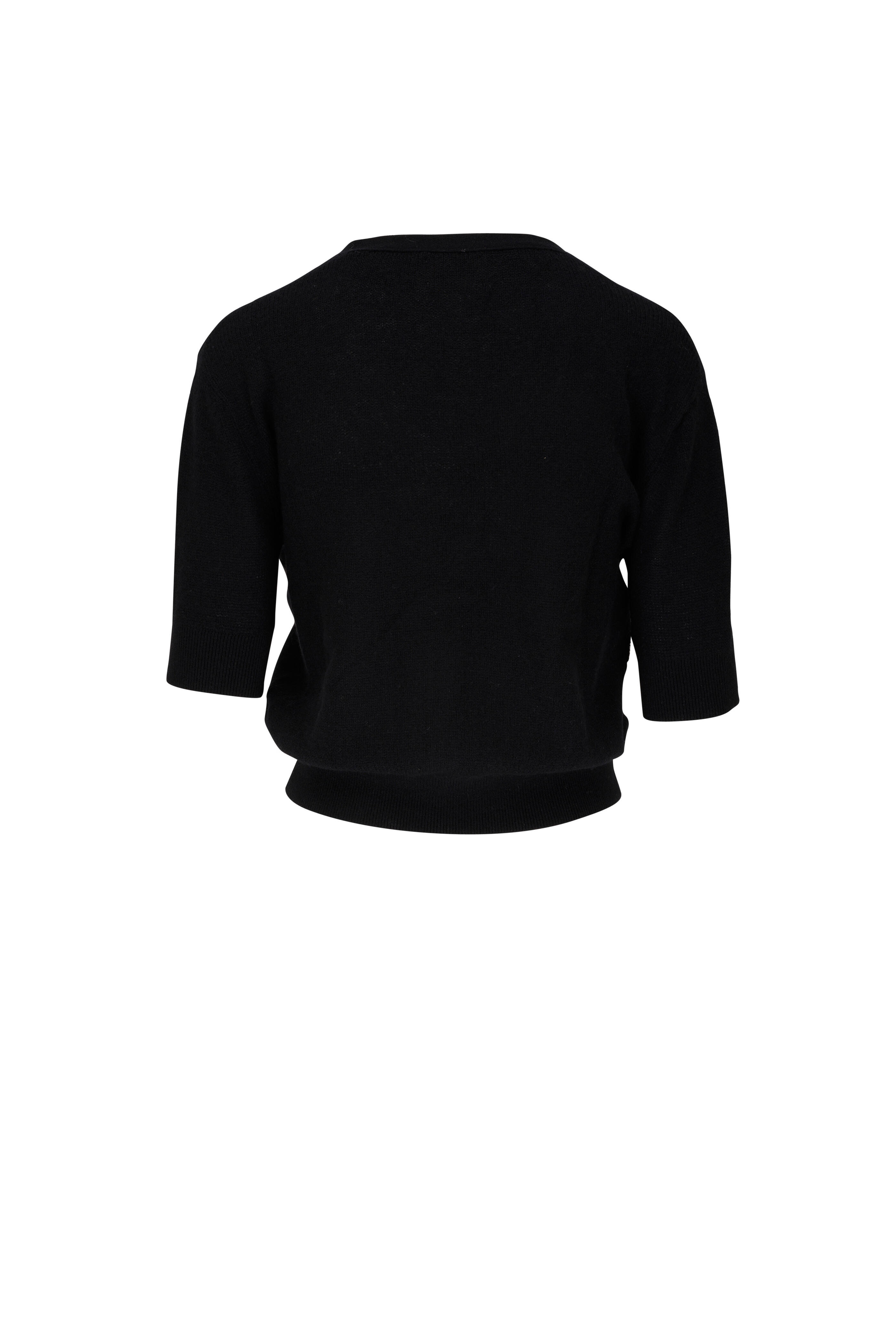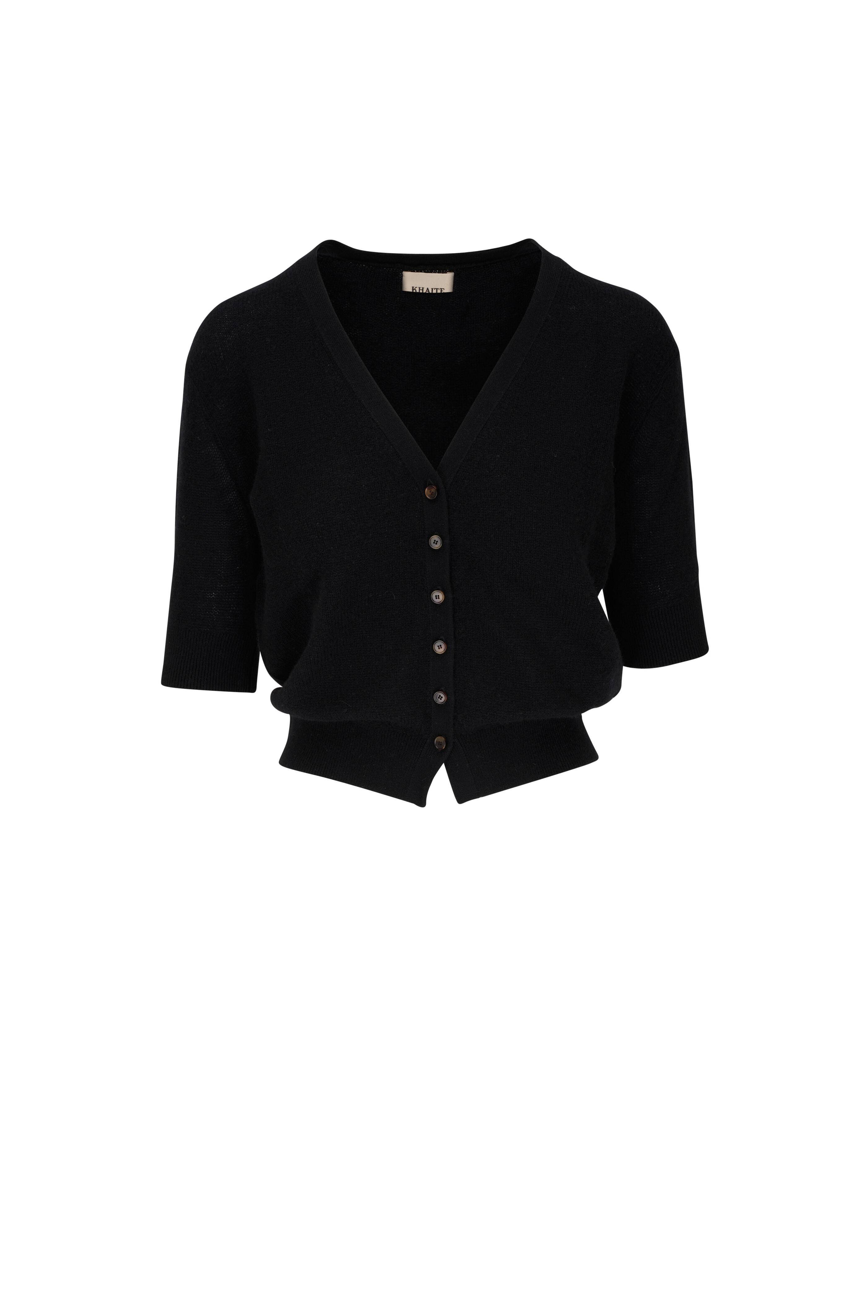 V-neckline. Front button placket. Elbow length sleeves. Ribbed trims. Imported. 20" shoulder to hem. 93% cashmere, 7% elastane. Dry clean.