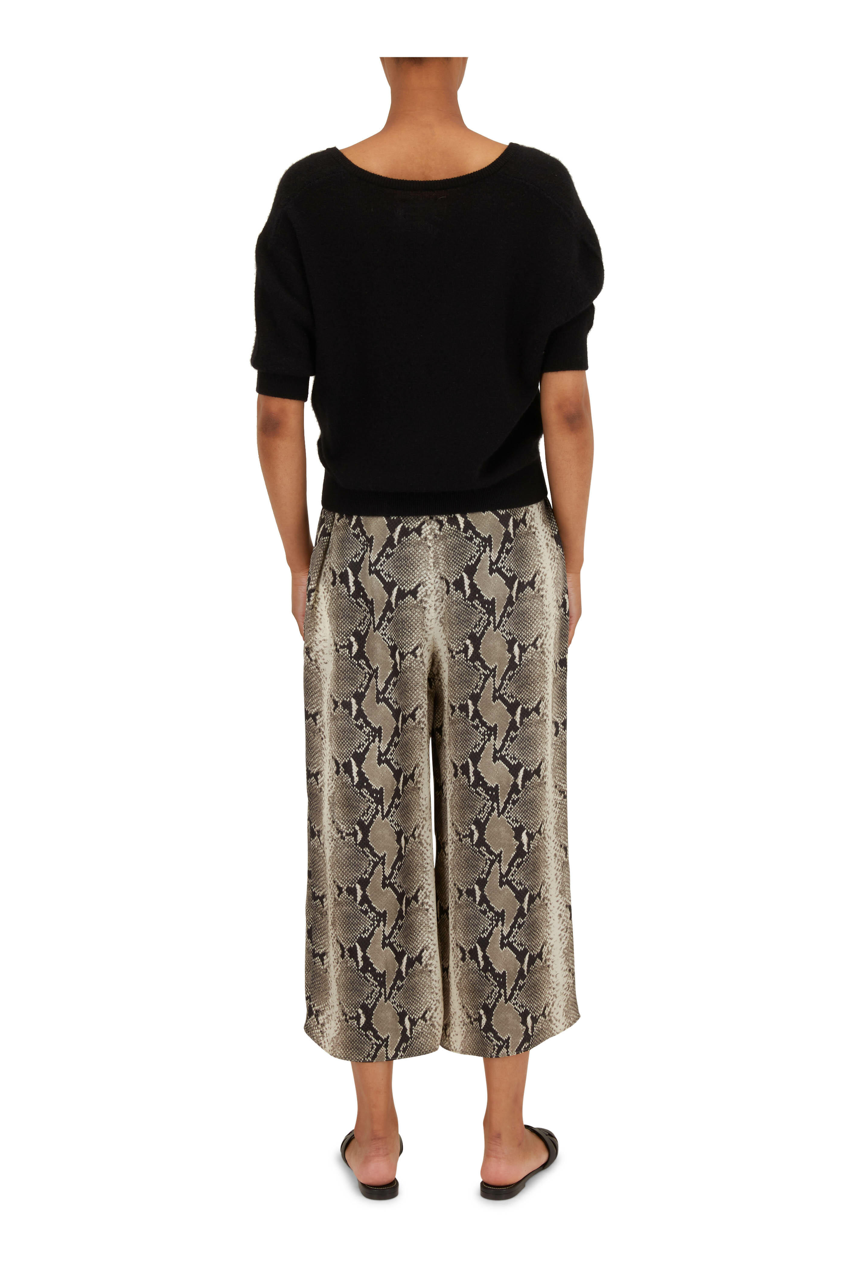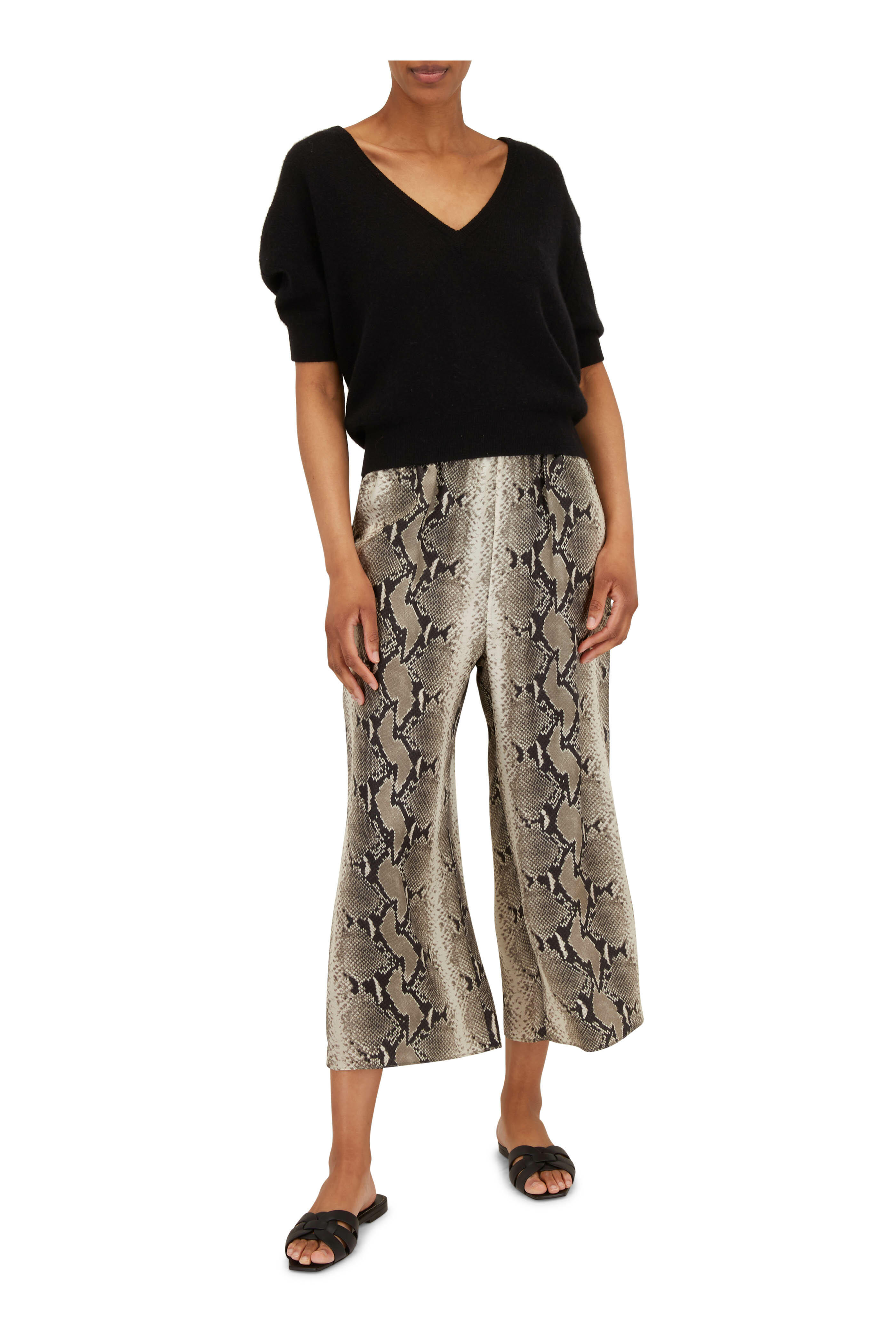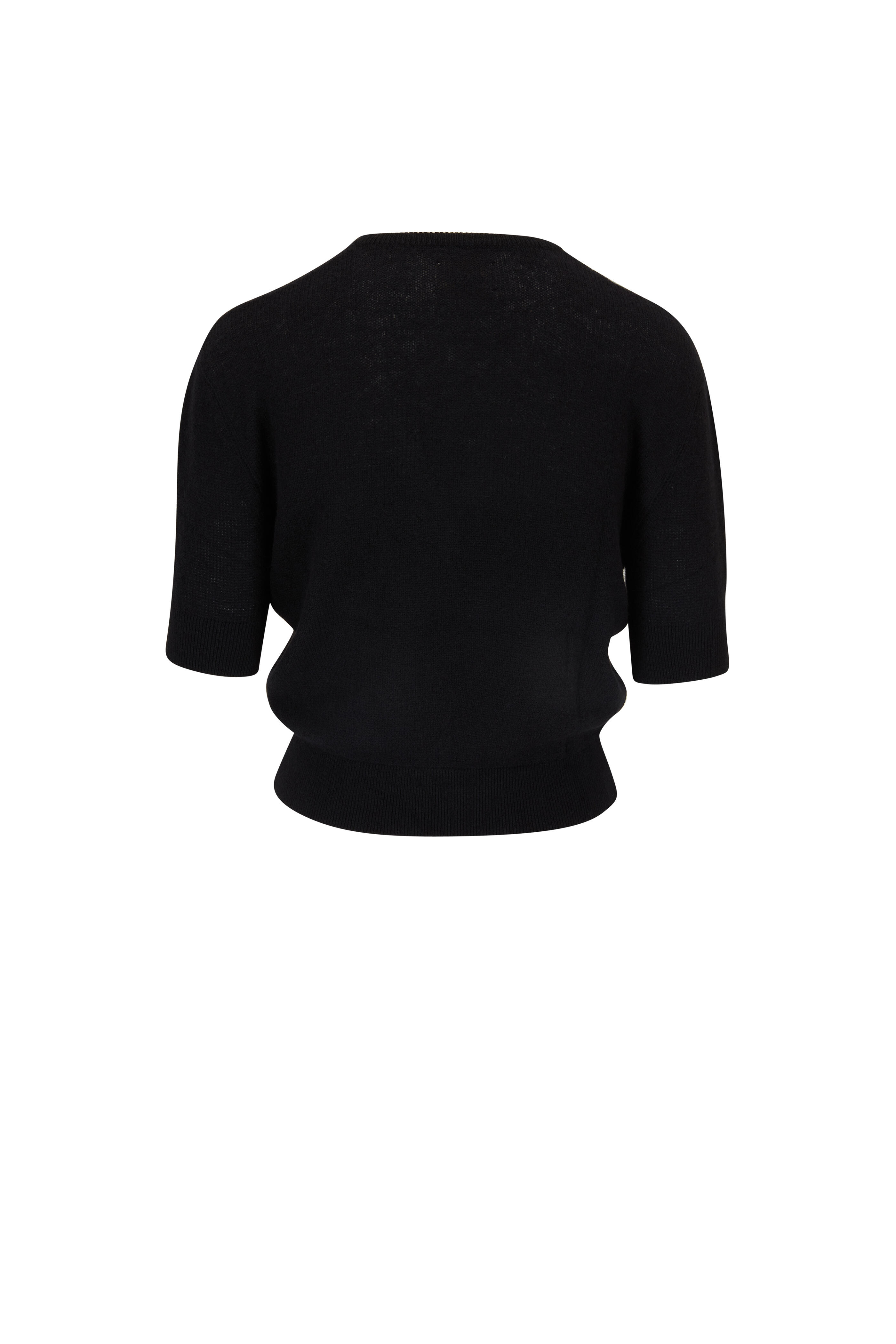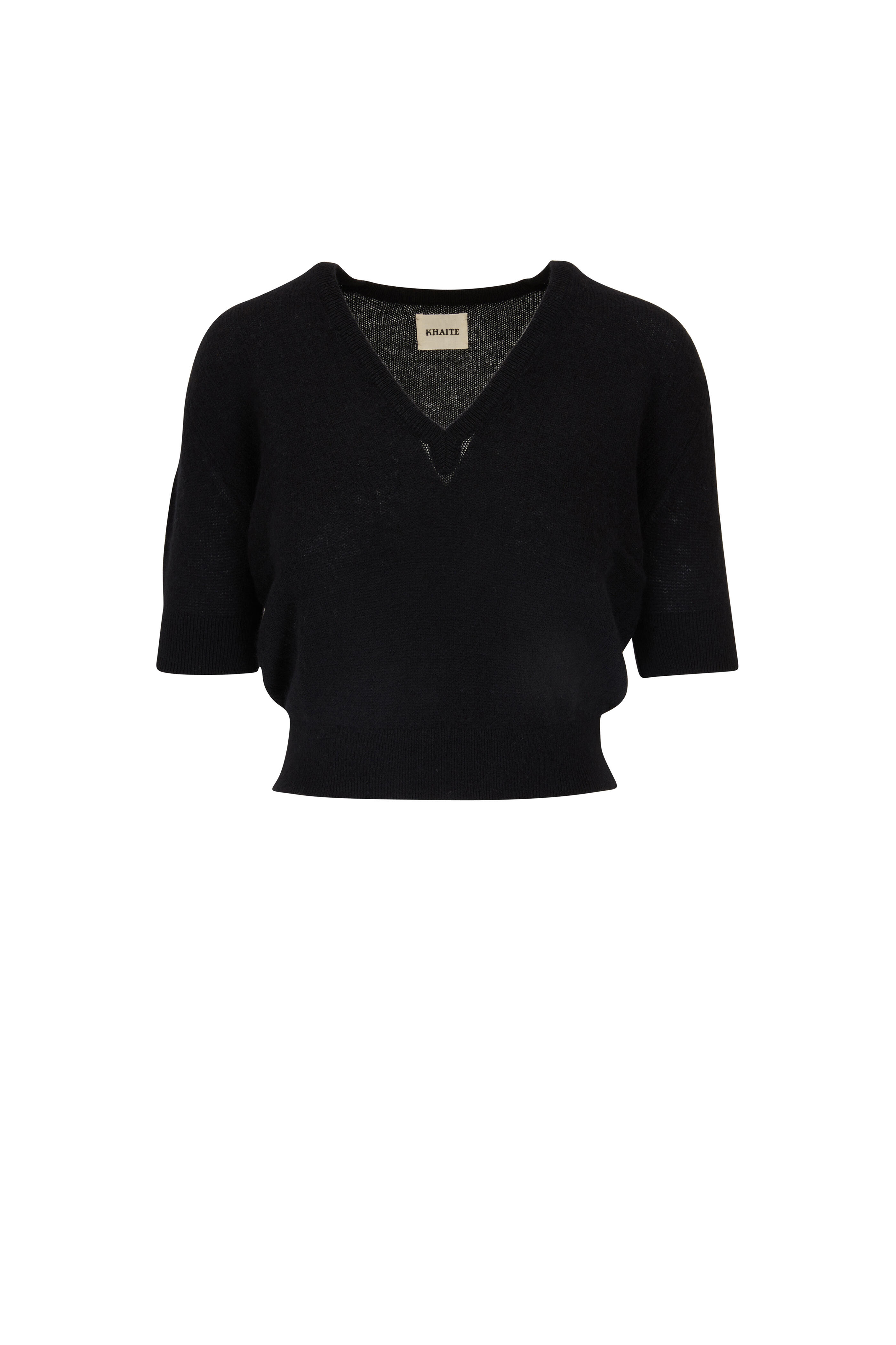 V-neckline. Ribbed trim. Made in USA. 100% cashmere. Dry clean.