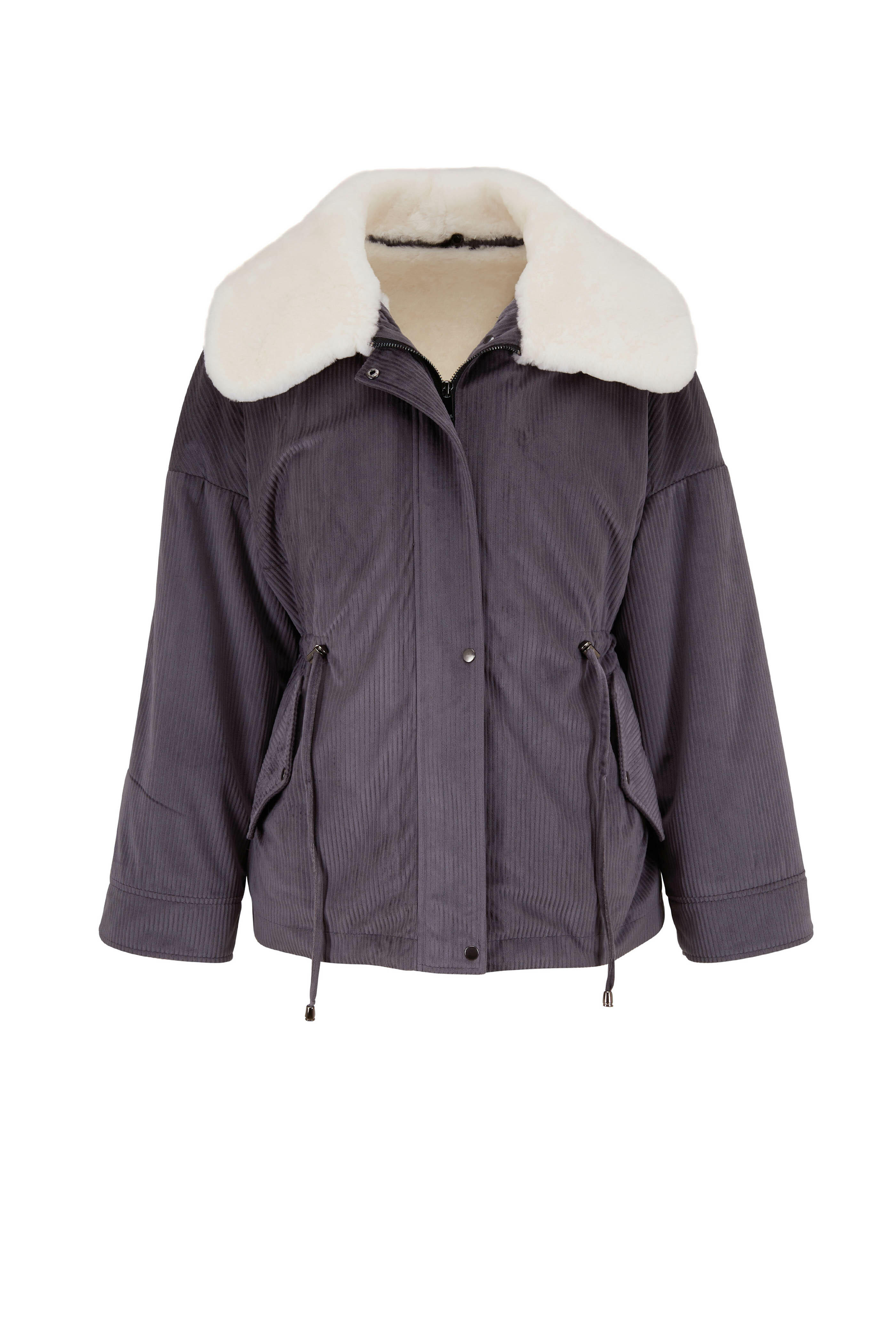 Specialist clean. Spread collar. Zip front with snap button detail. Drawstring waist. Imported. 100% merino shearling lining ; 100% cotton shell.