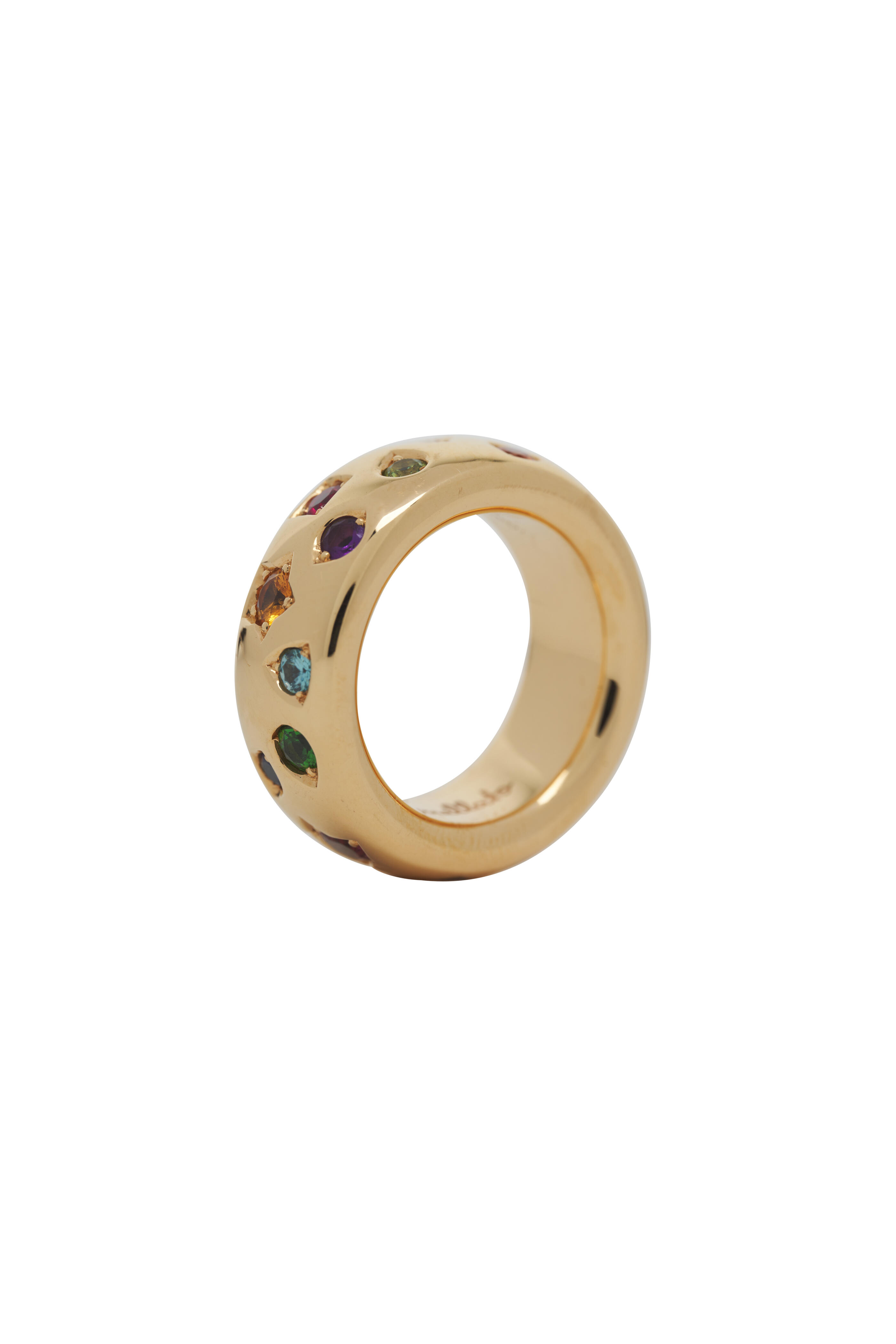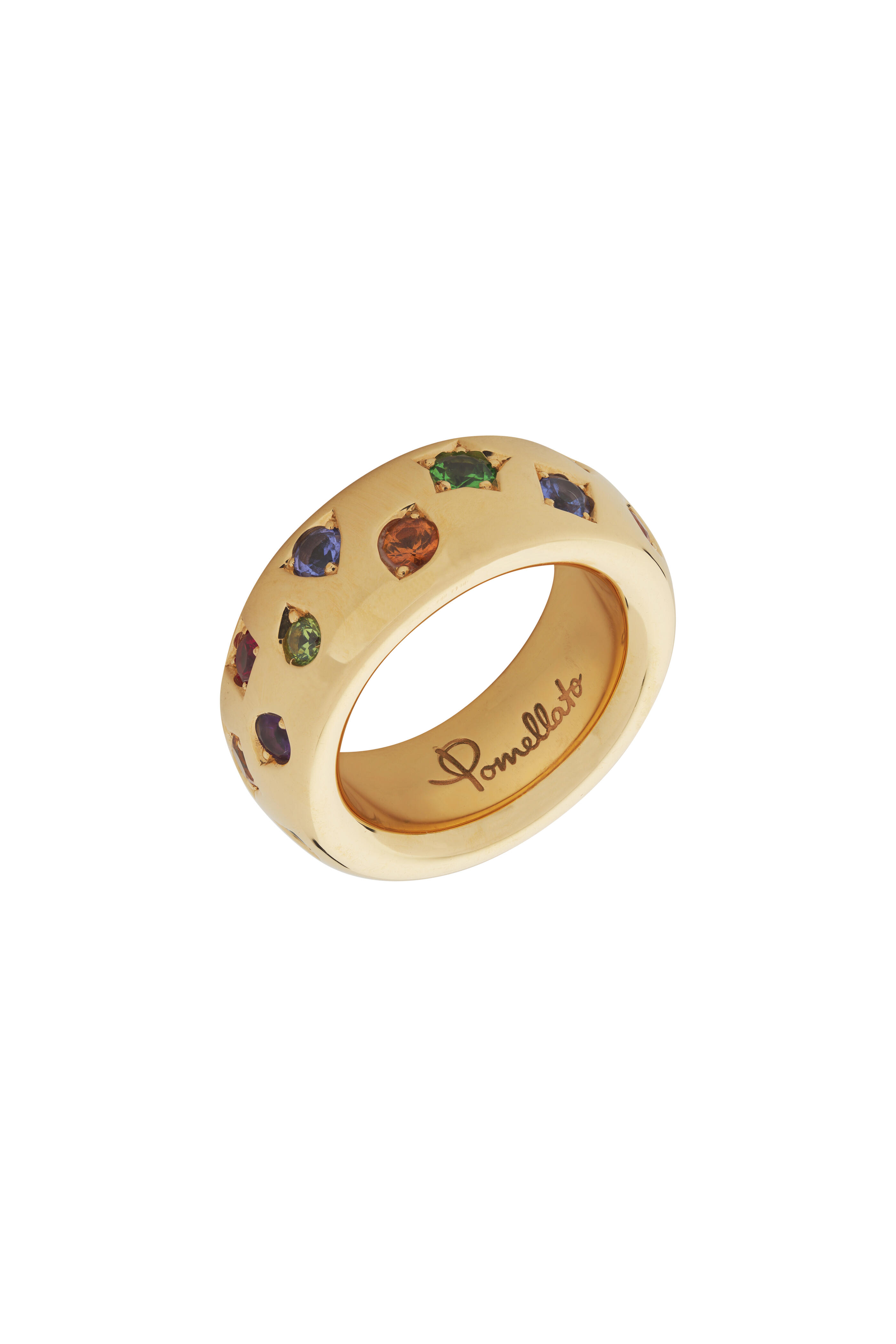 18K Rose Gold. 2 Pink Tourmalines: 0.3CT. 4 Orange Sapphire: 0.6CT. 2 Blue Sapphires: 0.2CT. 4 Tsavorites: 0.6CT. 2 Red Spinels: 0.2CT. 2 Blue Zircons: 0.2CT. 2 Tanzanites: 0.2CT. 1 Demantoid: 0.1CT. 1 Amethyst: 0.2CT. Size 7. Made in Italy.
