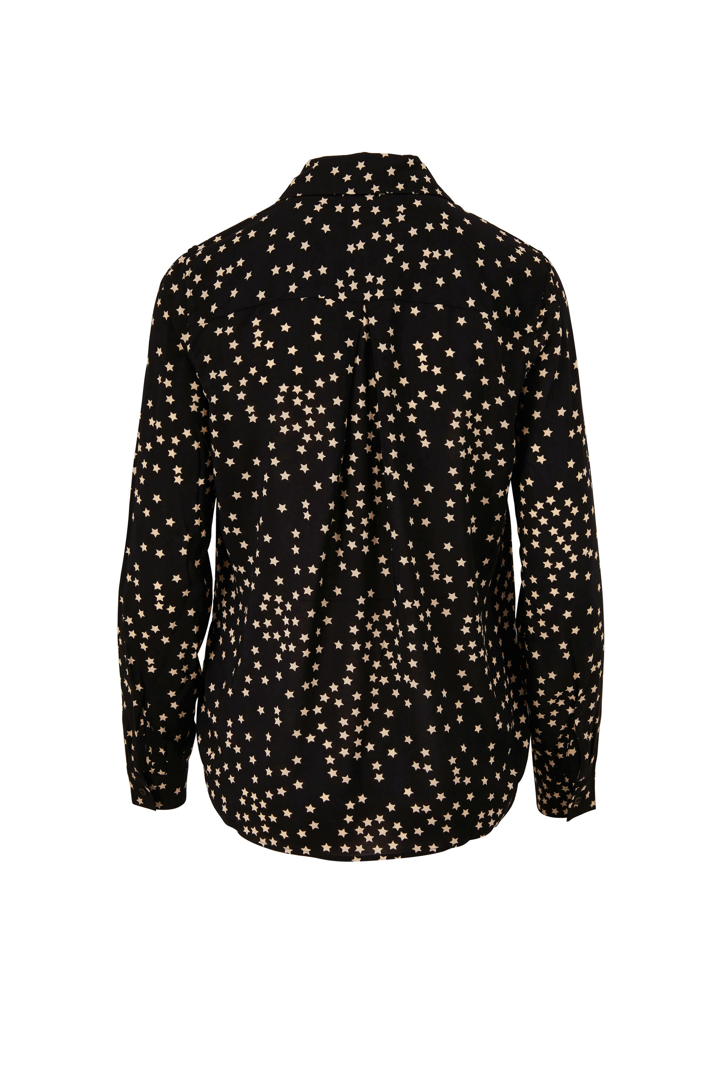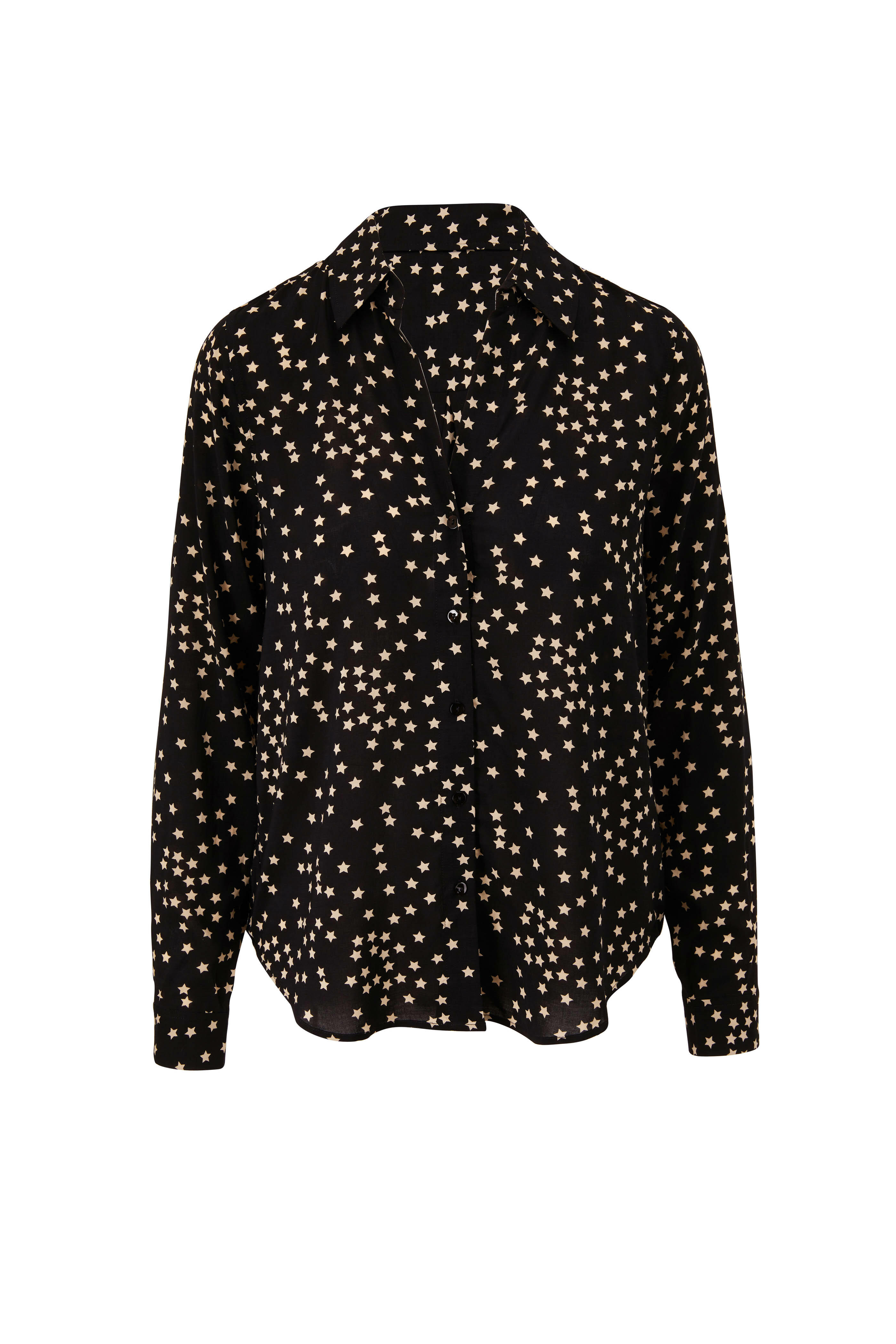 V-neckline. Button down placket. High-low shirttail hem. Imported. About 26.25" shoulder to hem. 100% viscose. Dry clean.