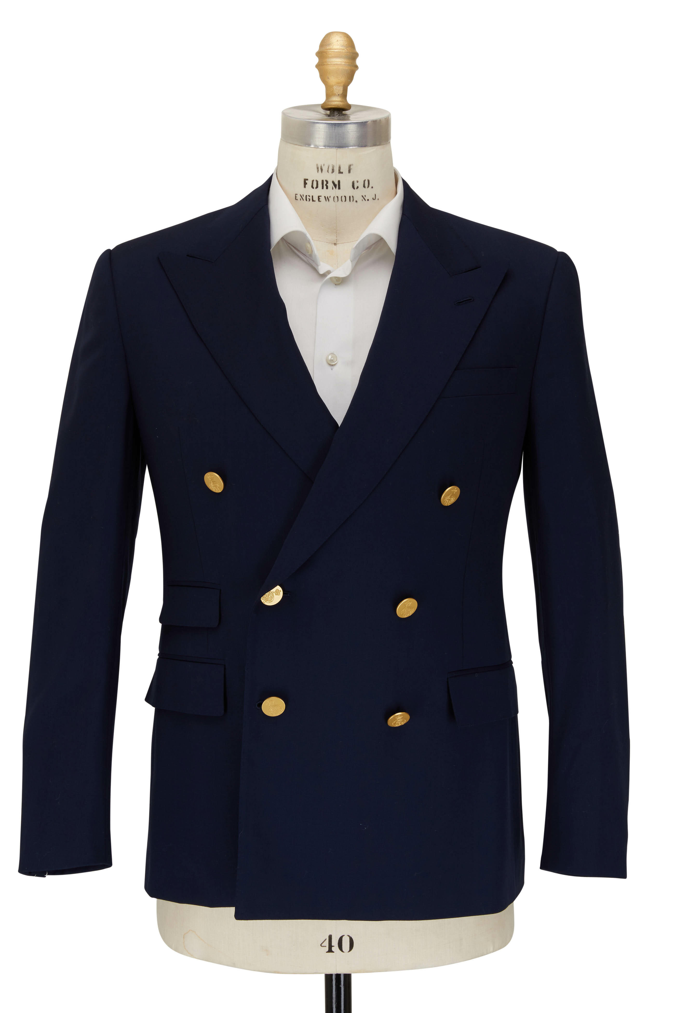Wool; fully lined. Notched lapels. Two button closure. Lower flap pockets; chest welt pocket. Double vent. Made in Italy. Dry clean.