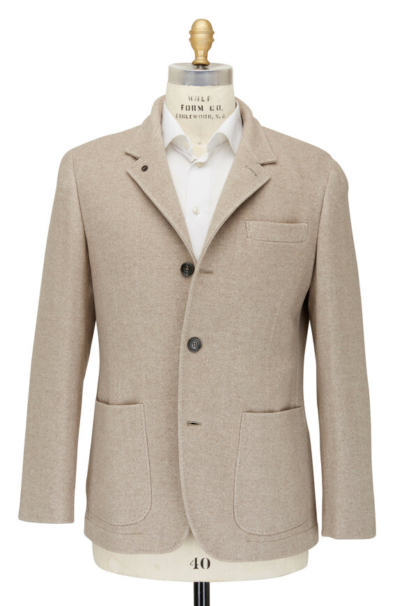 Notched lapels. Button placket. Lower patch pockets; chest welt pockets. Double vent. Made in Italy. 70% virgin wool, 30% cashmere; partially lined. Dry clean.