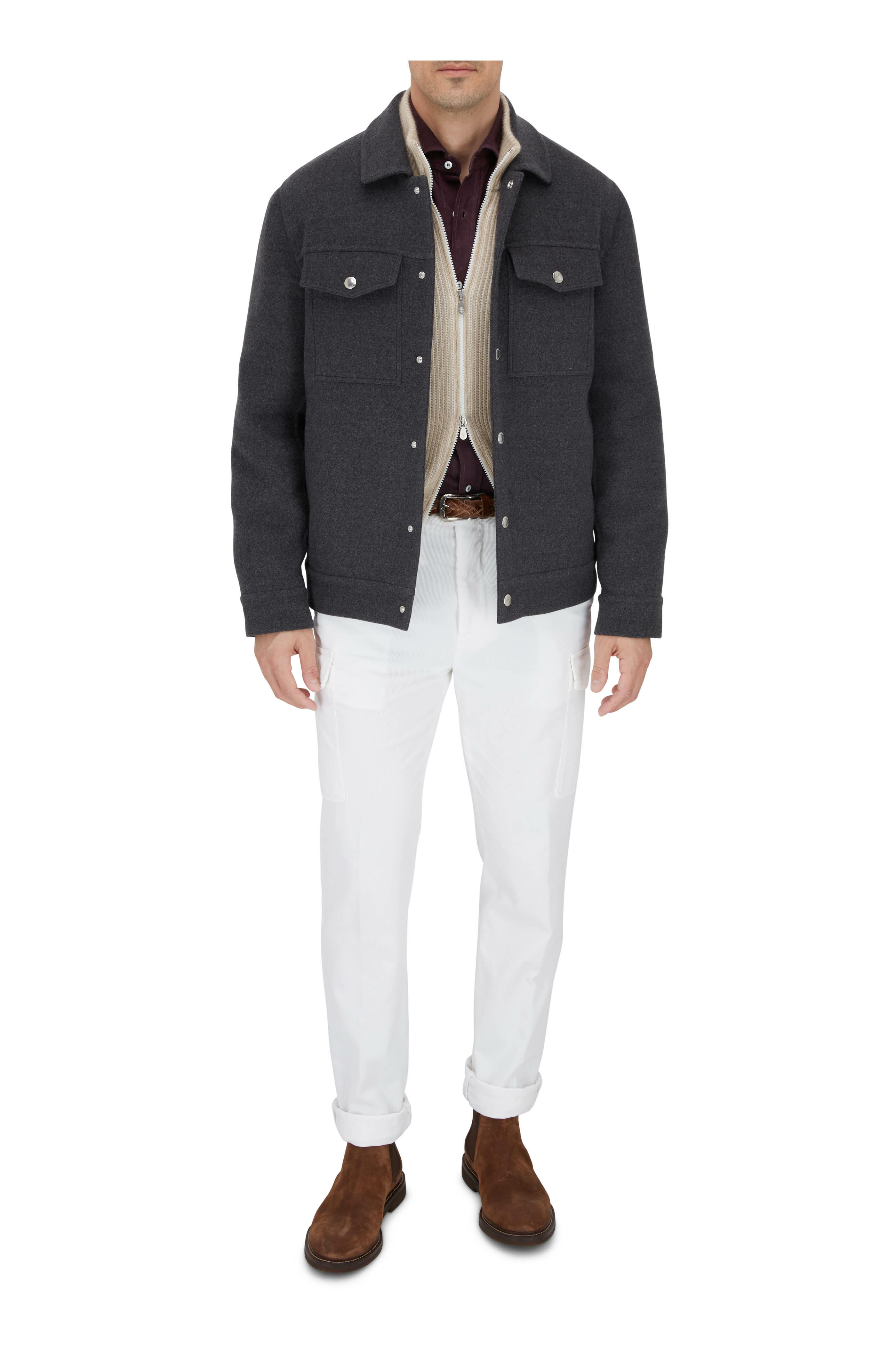 Spread collar. Front snap placket. Single snap cuffs. Chest snap flap pockets; lower slip pockets. Made in Italy. 100% virgin wool; partially lined. Dry clean.