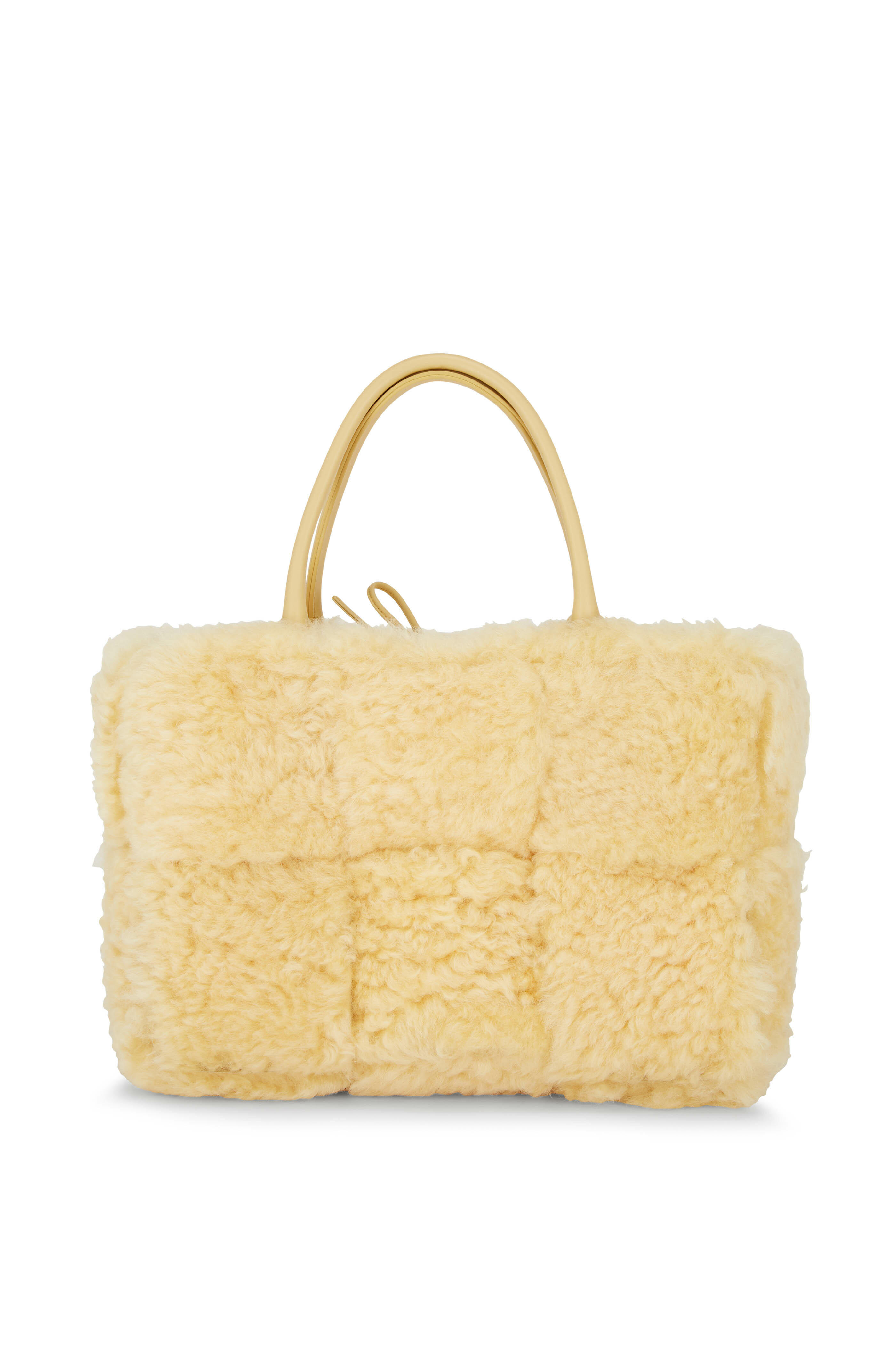 Lambskin. Dual rolled top handles. Top tie closure. Interior leather zip pouch. Leather lining. Made in Italy. Height: 7.8". Width: 11.8". Depth: 4.5". Handle drop: approx. 6".