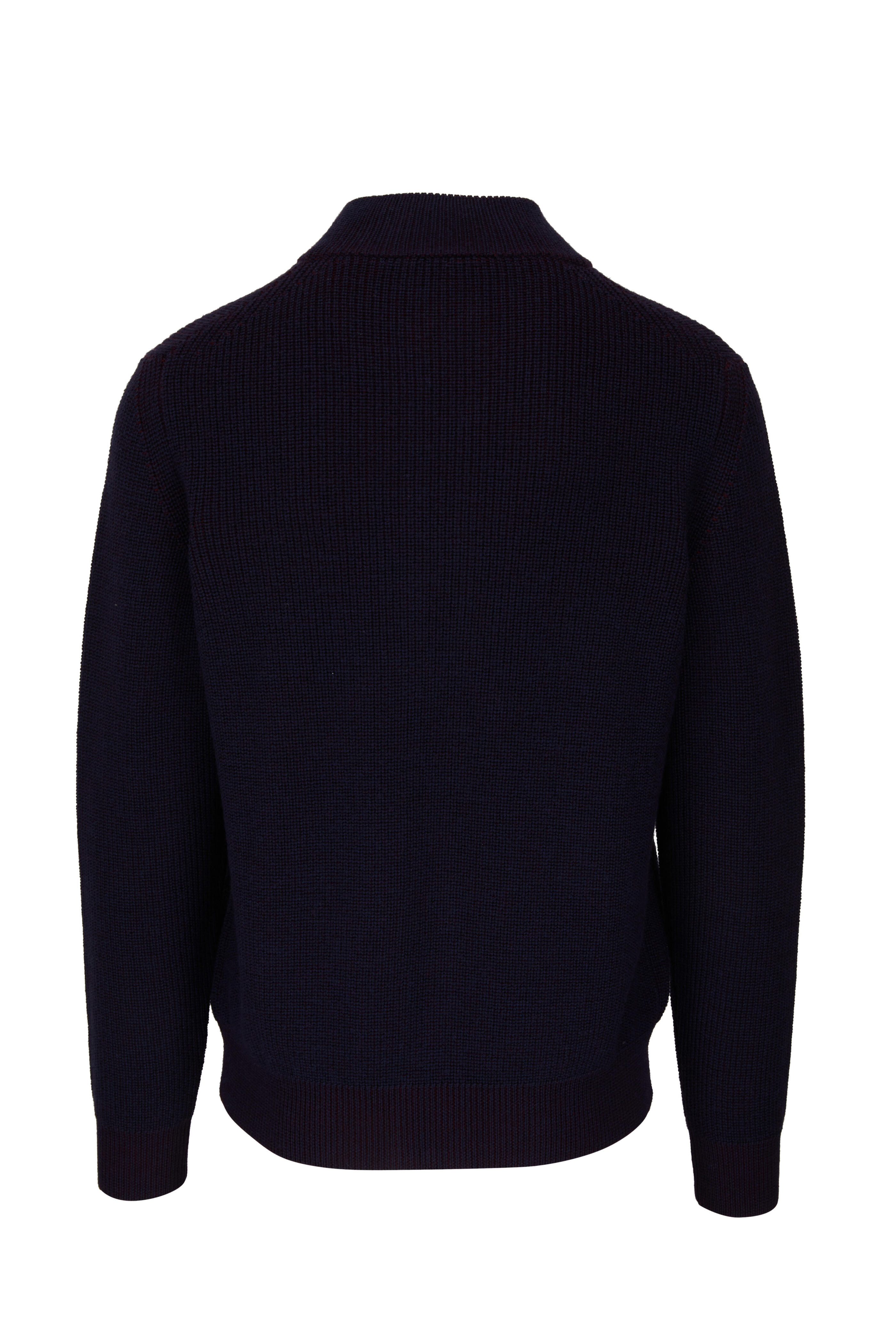 Mock neck. Two-way zip. Contrast ribbed trim. Made in Italy. 100% virgin wool. Hand wash.
