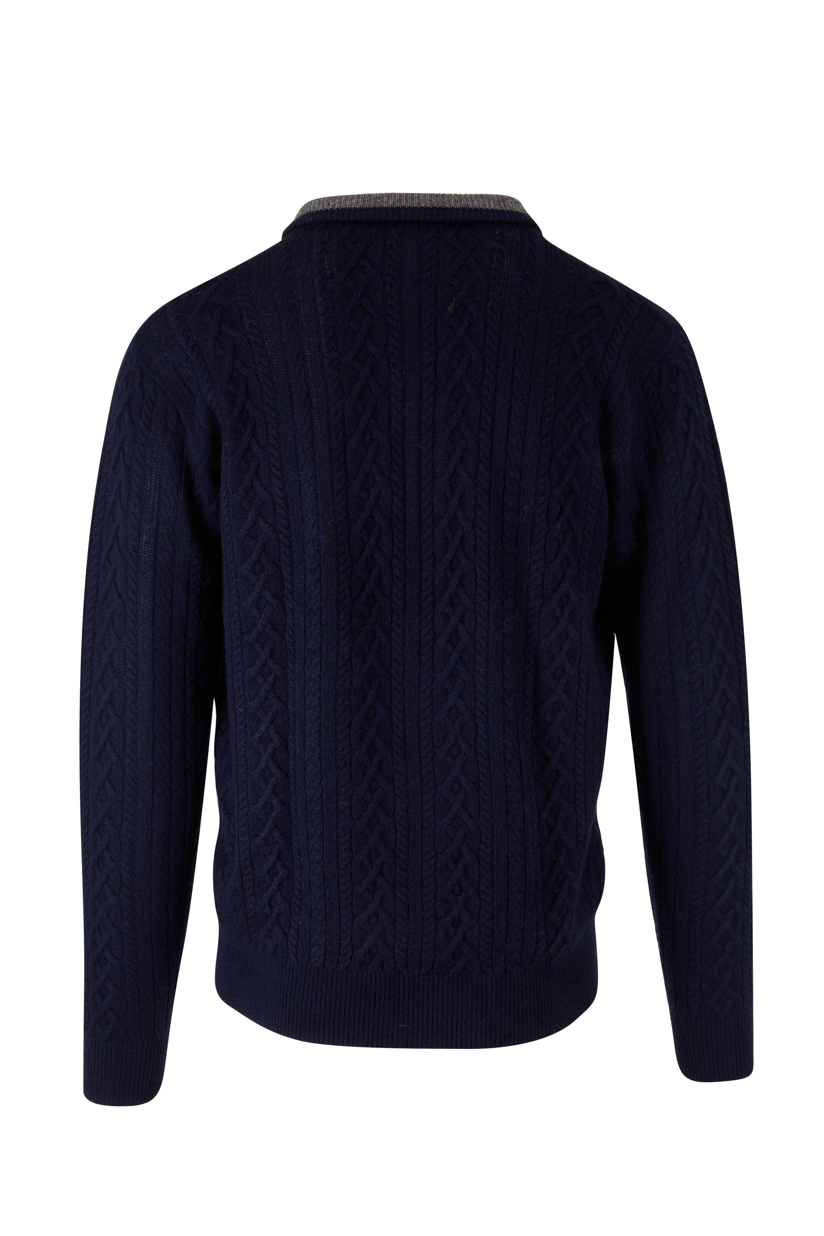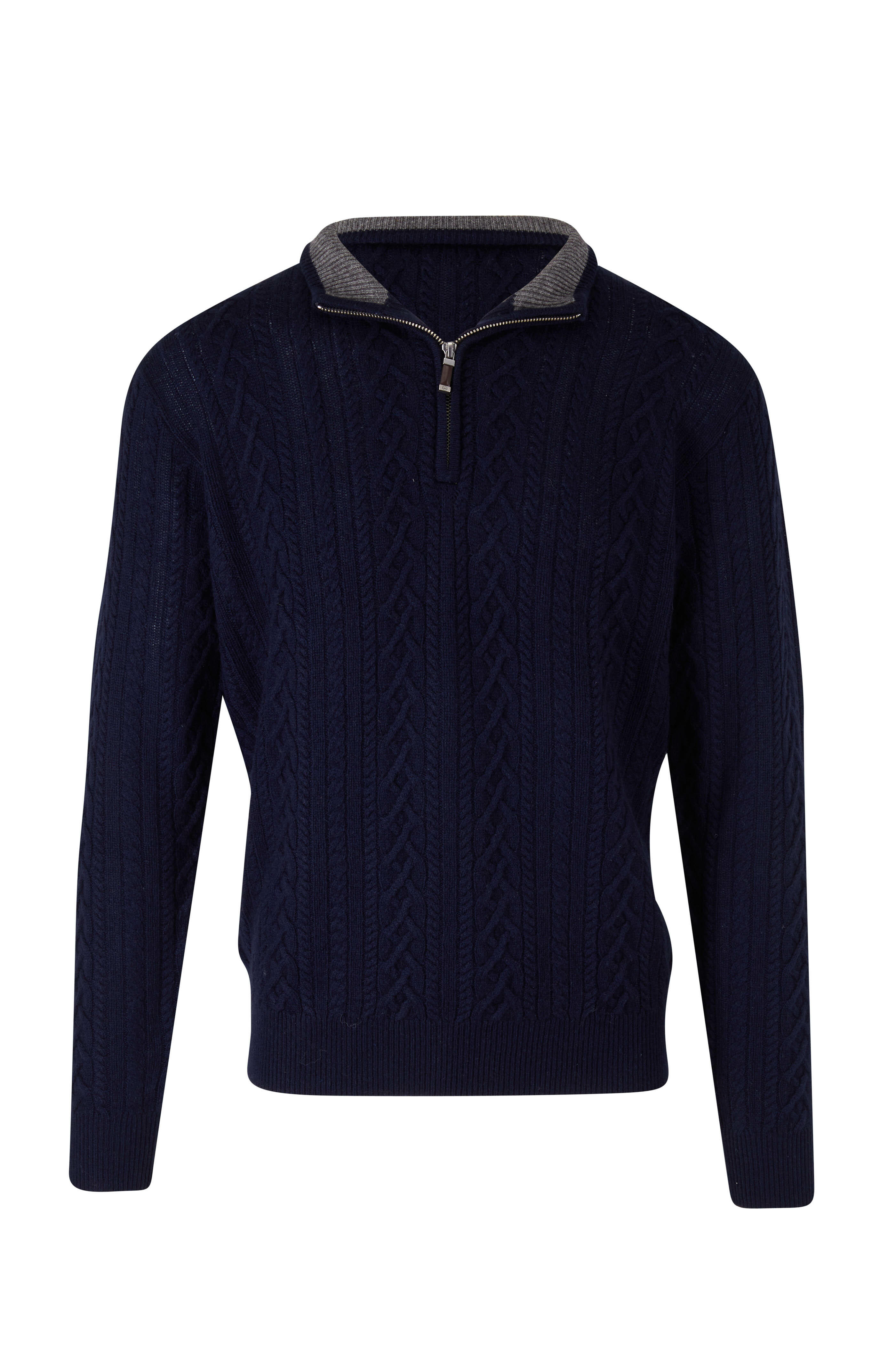 Stand collar. Quarter-zip. Contrast ribbed trim. Imported. 65% wool, 25% yak, 10% cashmere. Hand wash.
