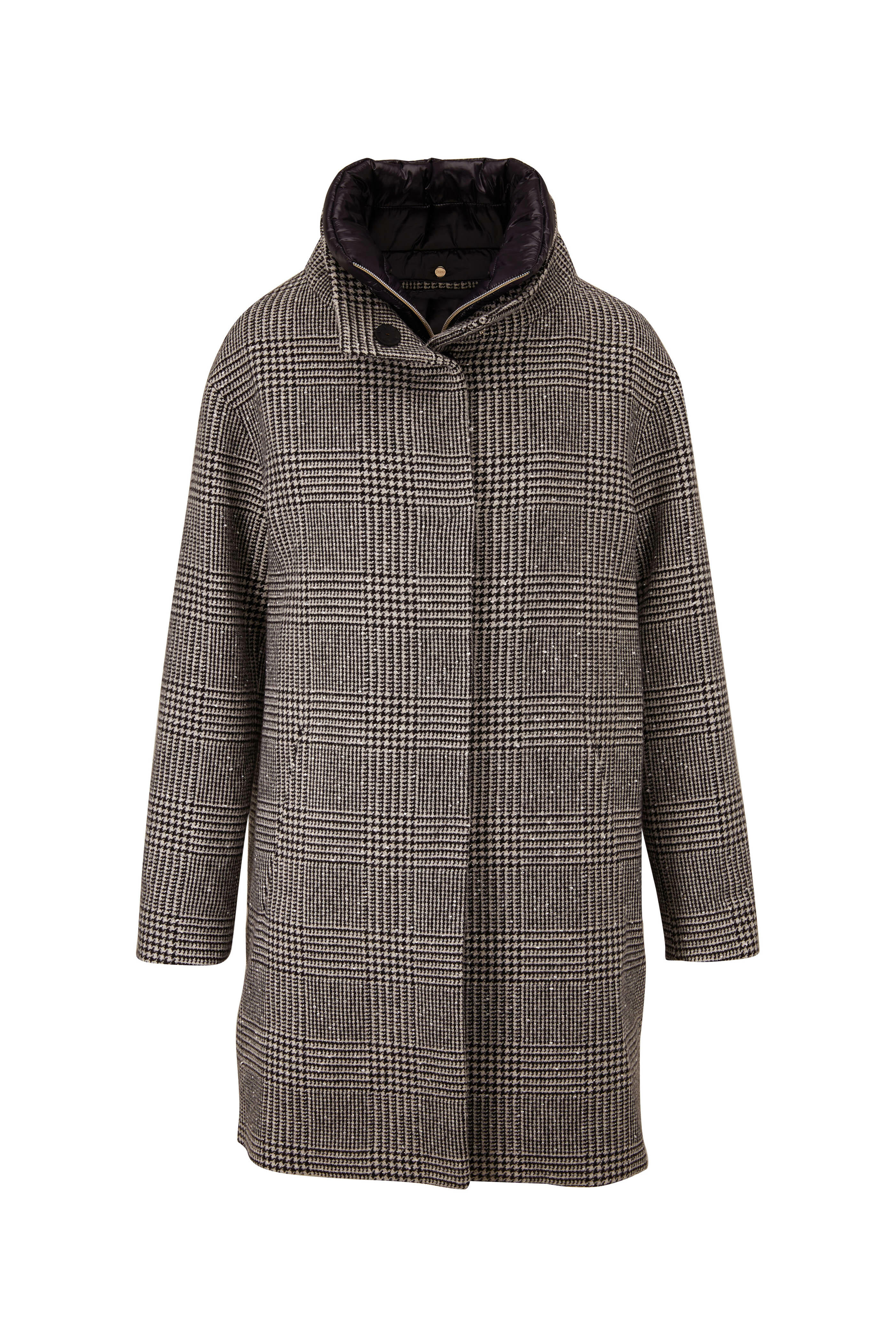 High collar. Concealed snap closure. Drop shoulders. Lower welt pockets. Removable zip puffer dickey. Made in Italy. 82% virgin wool, 15% polyamide, 3% metallic fibers; dickey: 100% polyamide; fully lined. Dry clean.