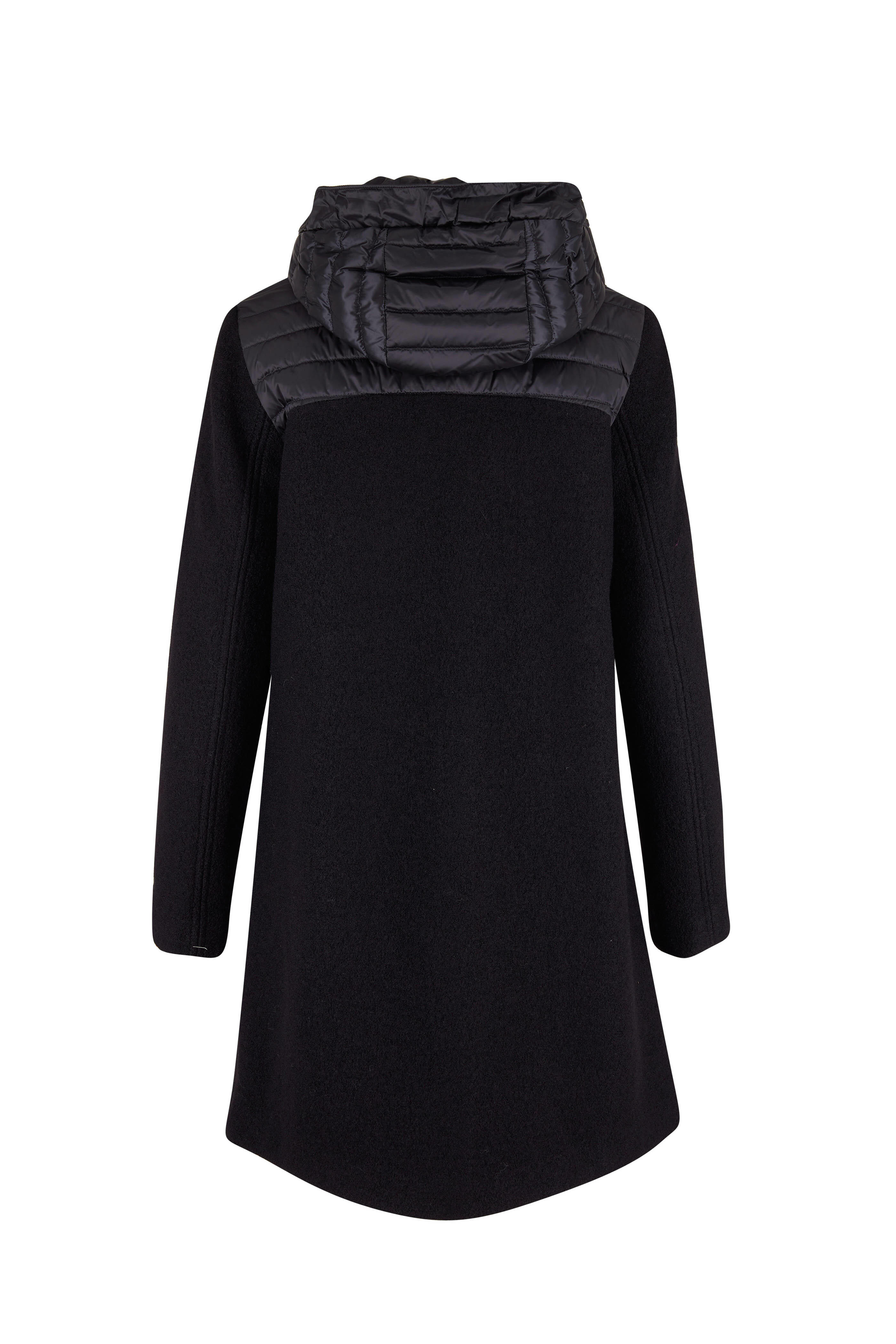 Banded collar. Snap placket. Removable hooded zip dickey. Lower zip pockets. Imported. 100% wool; fabric 2: 60% polyester, 40% polyamide; fill: 100% duck down. Dry clean.