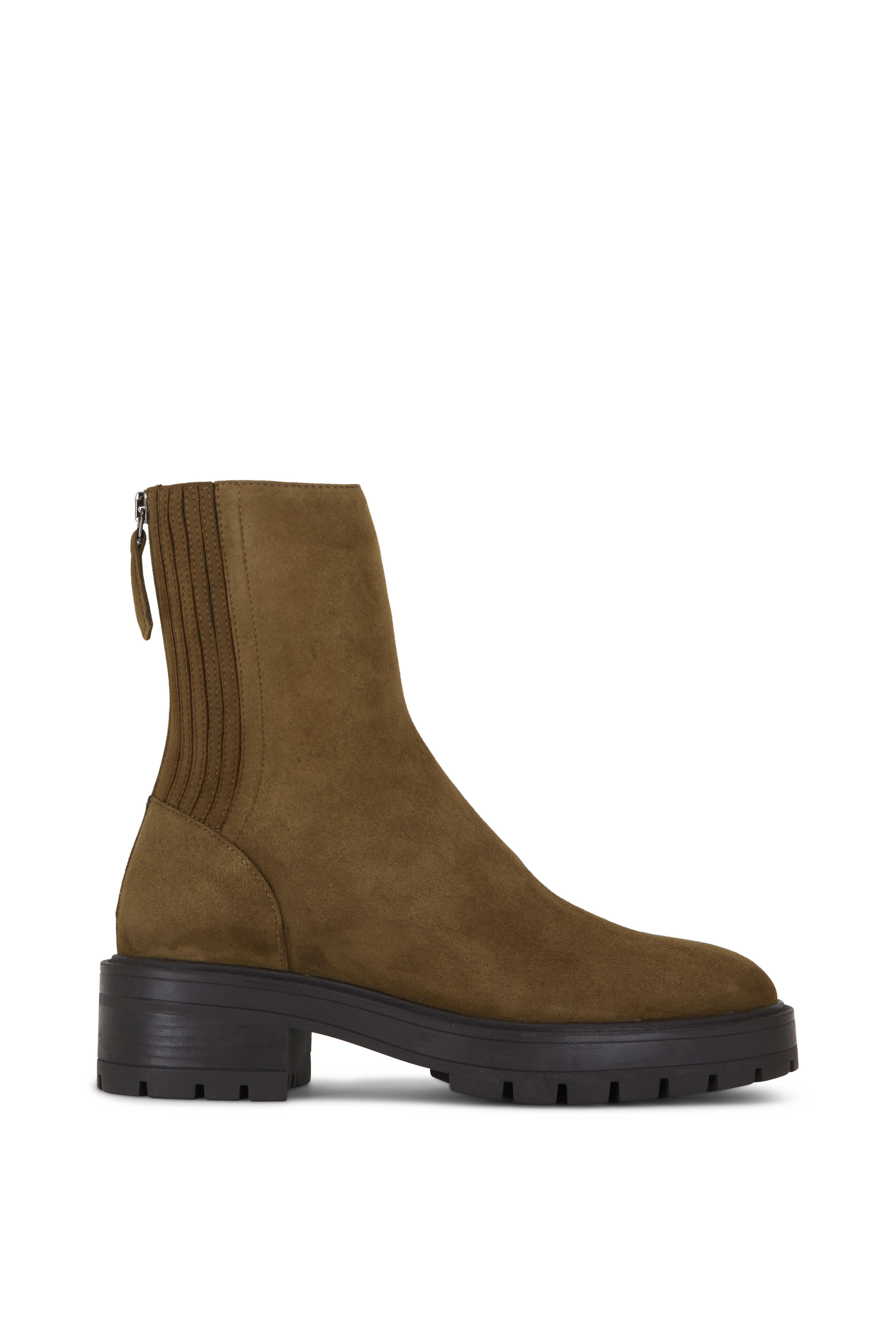 Suede upper. Round toe. Back zip. Leather lining and insole. Chunky rubber lug sole. Made in Italy.