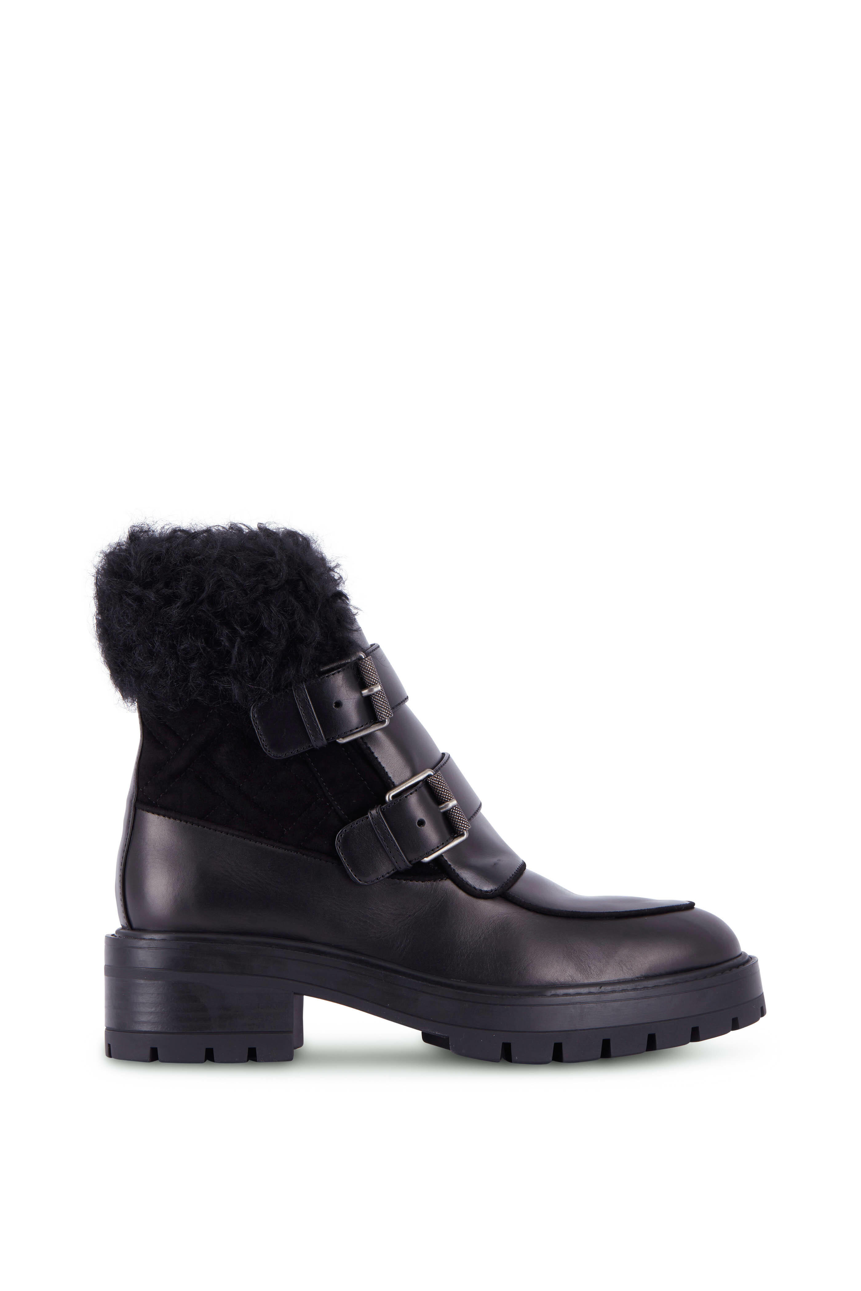 Leather and quilted suede upper. Moc toe. Adjustable two buckle straps at vamp. Leather lining and insole. Shearling trim collar. Rubber lug sole. Made in Italy.