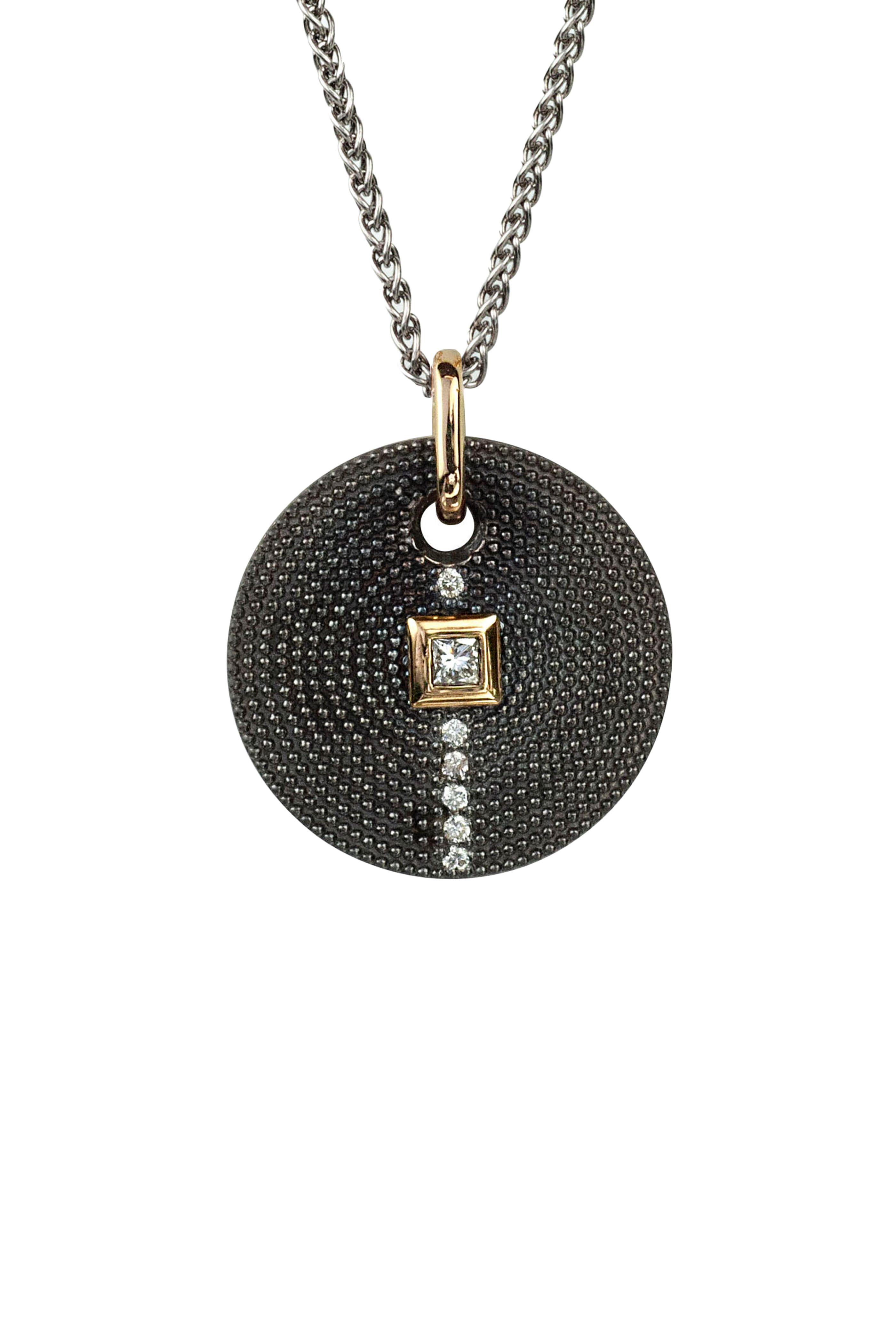 Blackened sterling silver. 14k yellow gold. .18 carat diamonds.