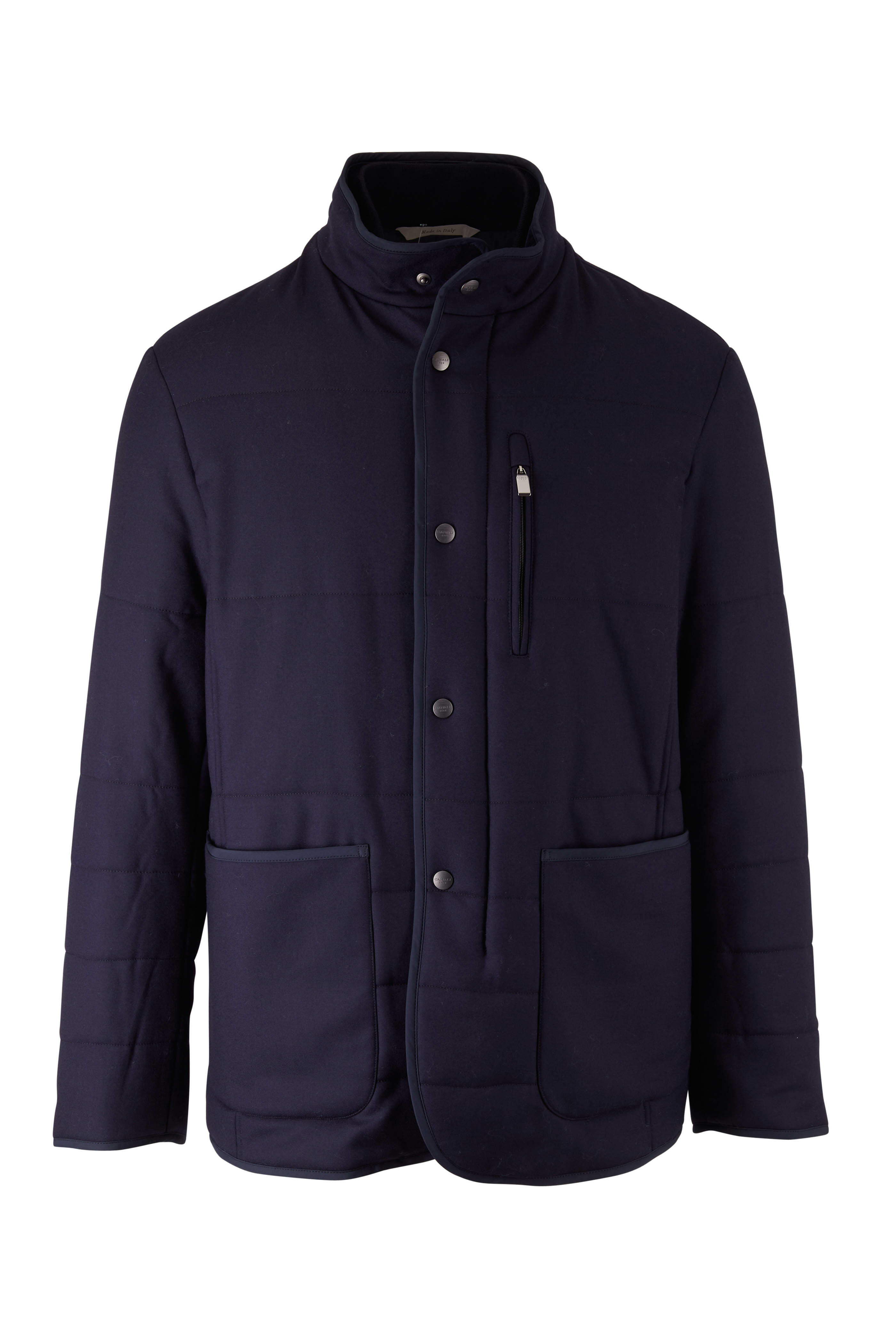 Stand collar. Concealed two-way; snap placket. Lower patch pockets; chest zip pocket. Made in Italy. 94% wool, 6% cashmere; fill: 55% polyester, 45% recycledPet. Dry clean.