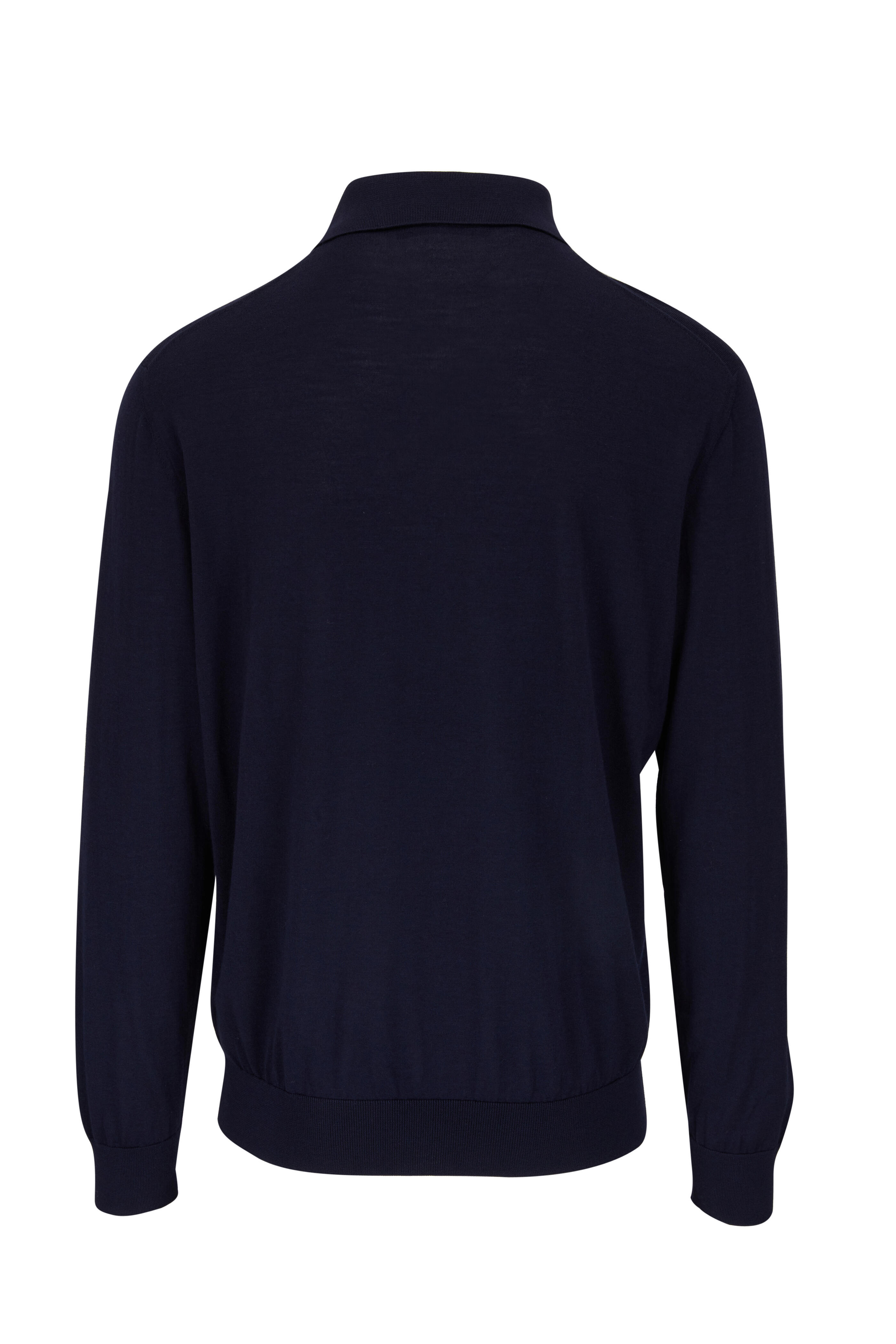 Spread collar. Button placket. Long sleeves. Ribbed trim. Imported. 70% cashmere, 30% silk. Dry clean.