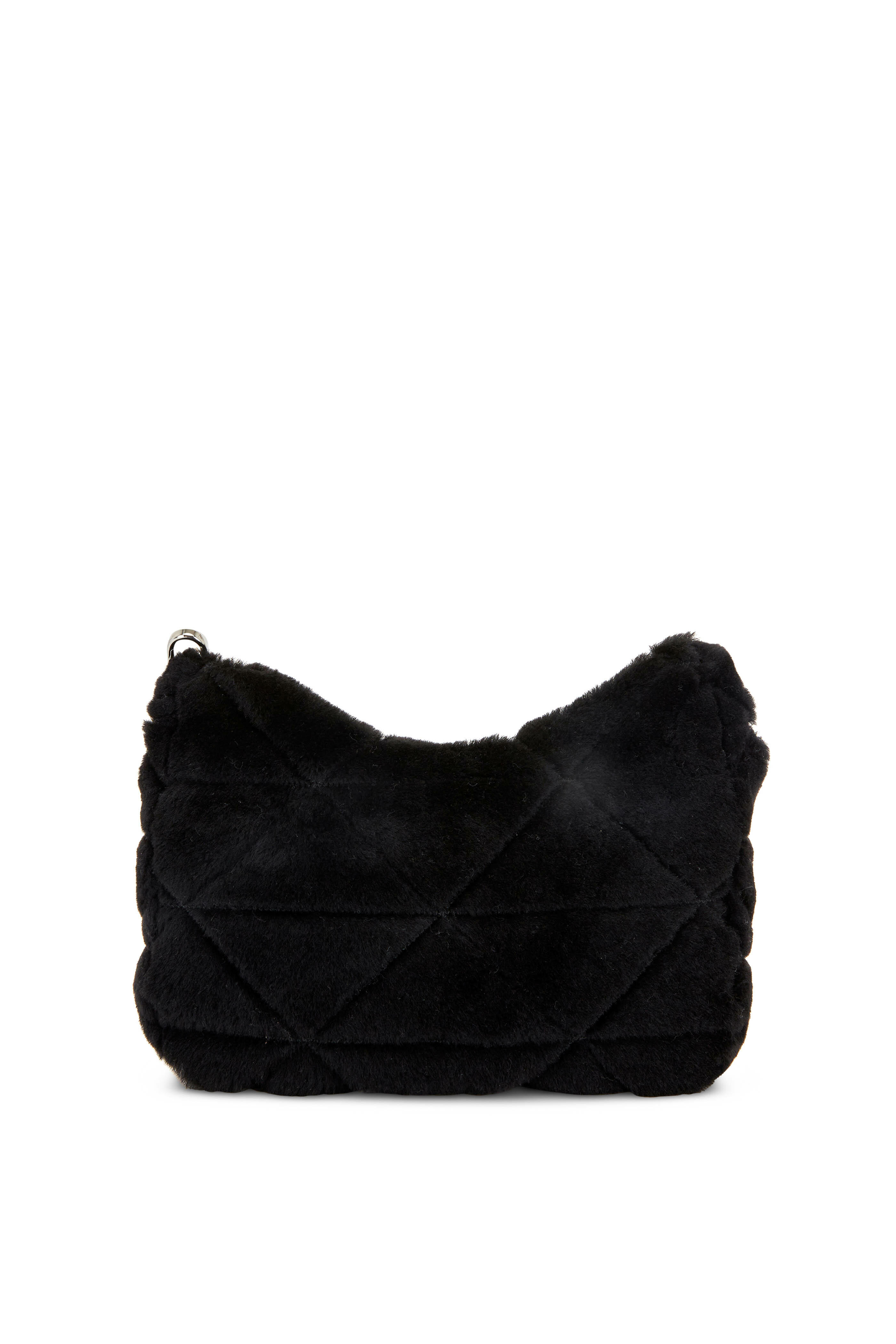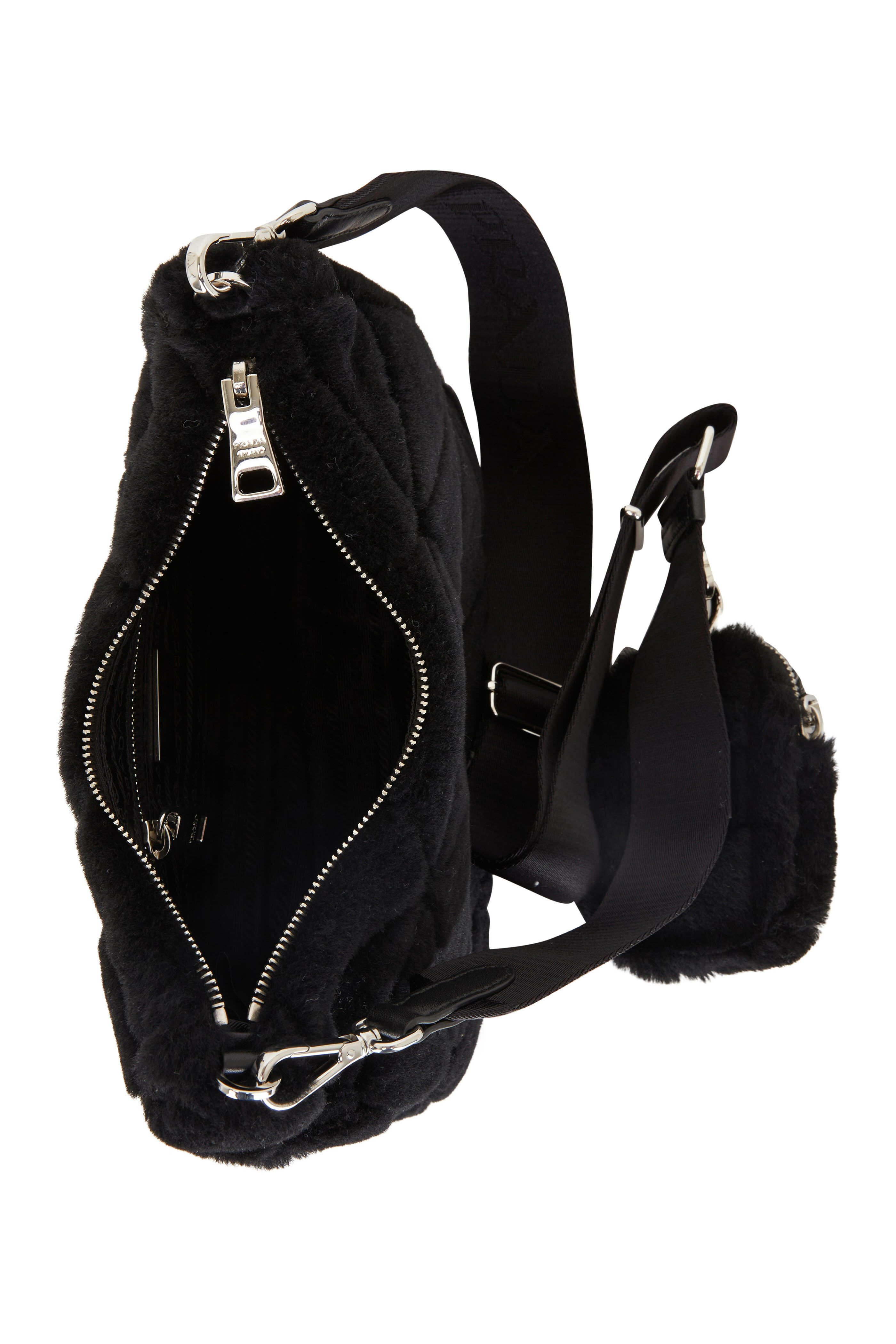Shearling. Top zip. Detachable and adjustable nylon shoulder strap. Removable shearling zip mini pouch. Metal logo detailing. Interior zip pocket. Textile lining. Made in Italy. Width: 10". Height: 7". Depth: 3". Shoulder strap drop: 22".