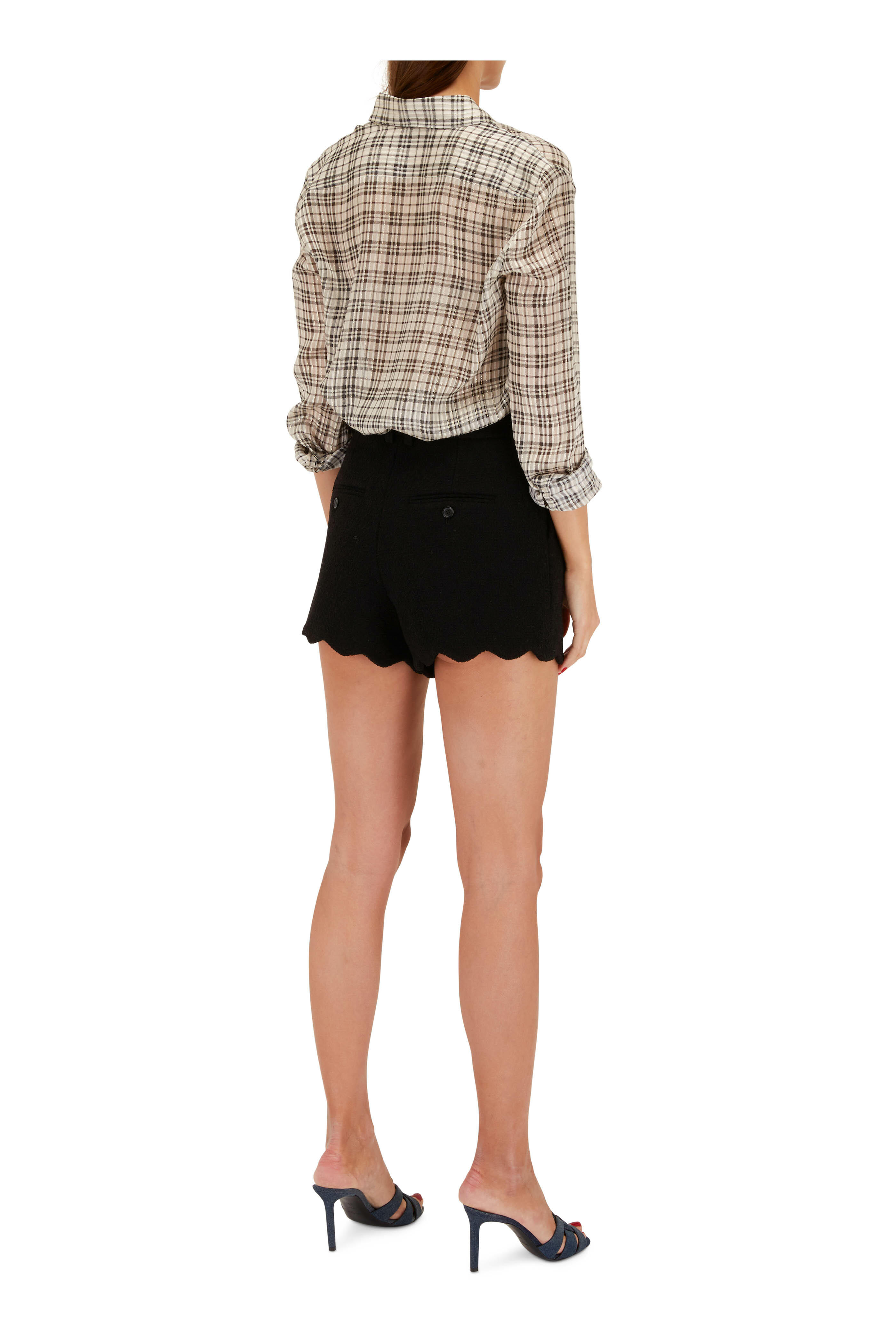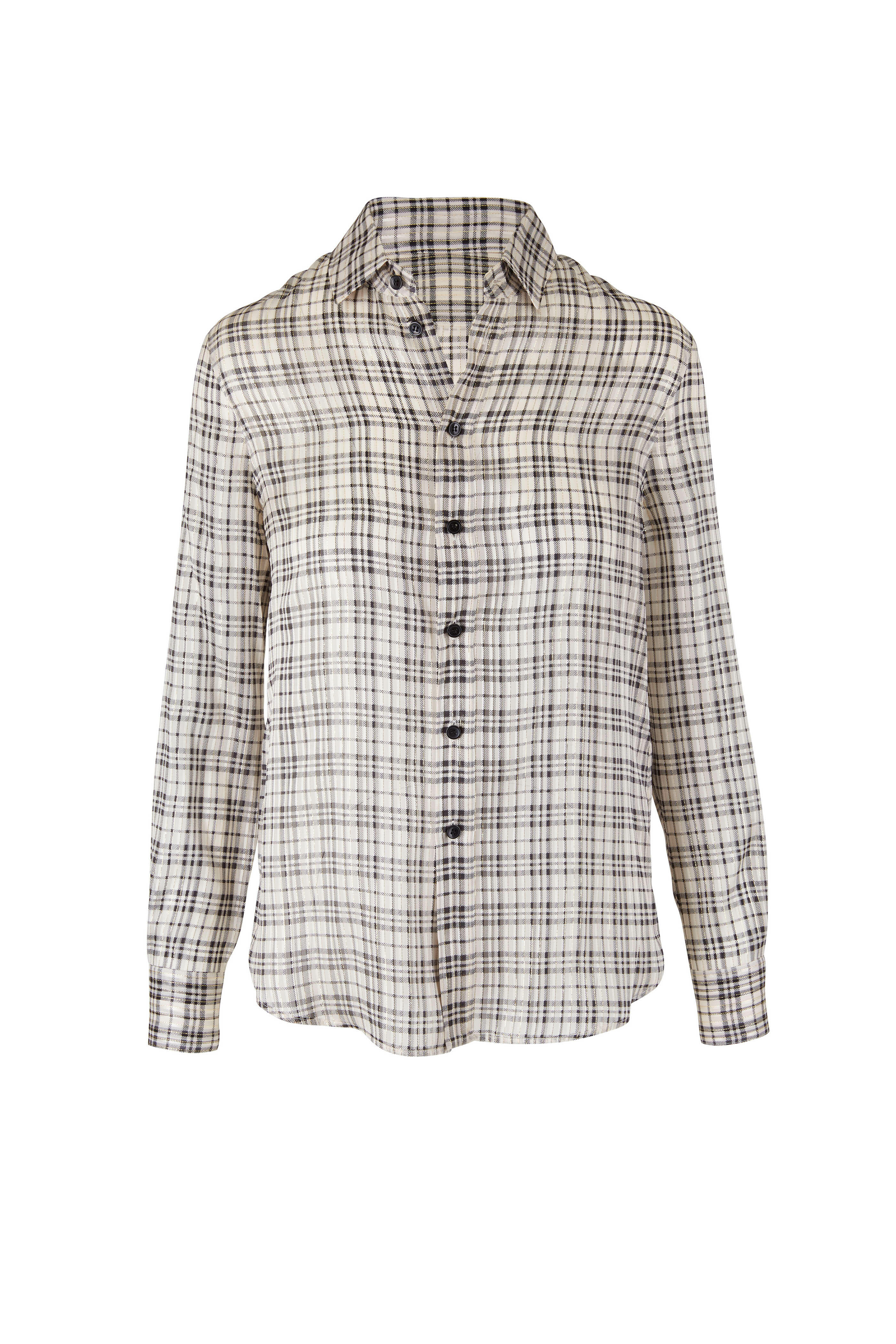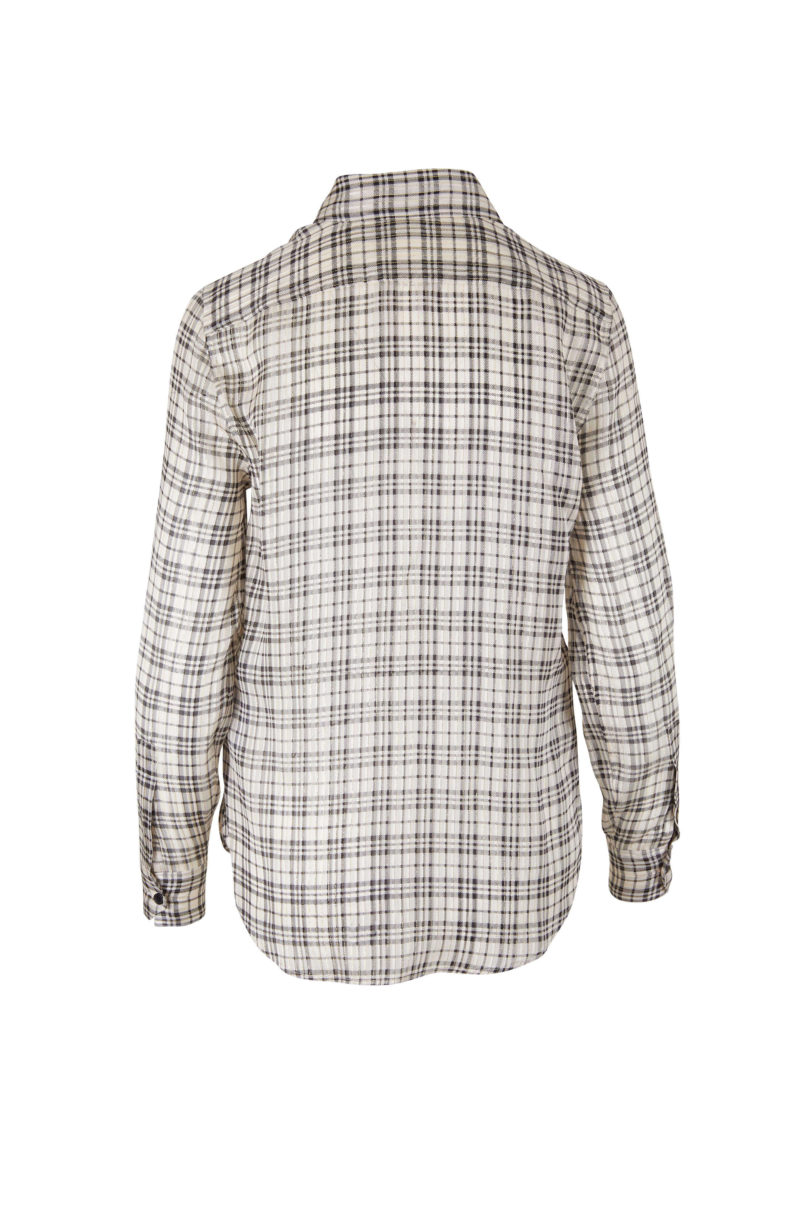 Spread collar. Button down placket. Single button mitered cuffs. Rounded hem. Made in Italy. 97% silk, 3% metallic fibers. Dry clean.