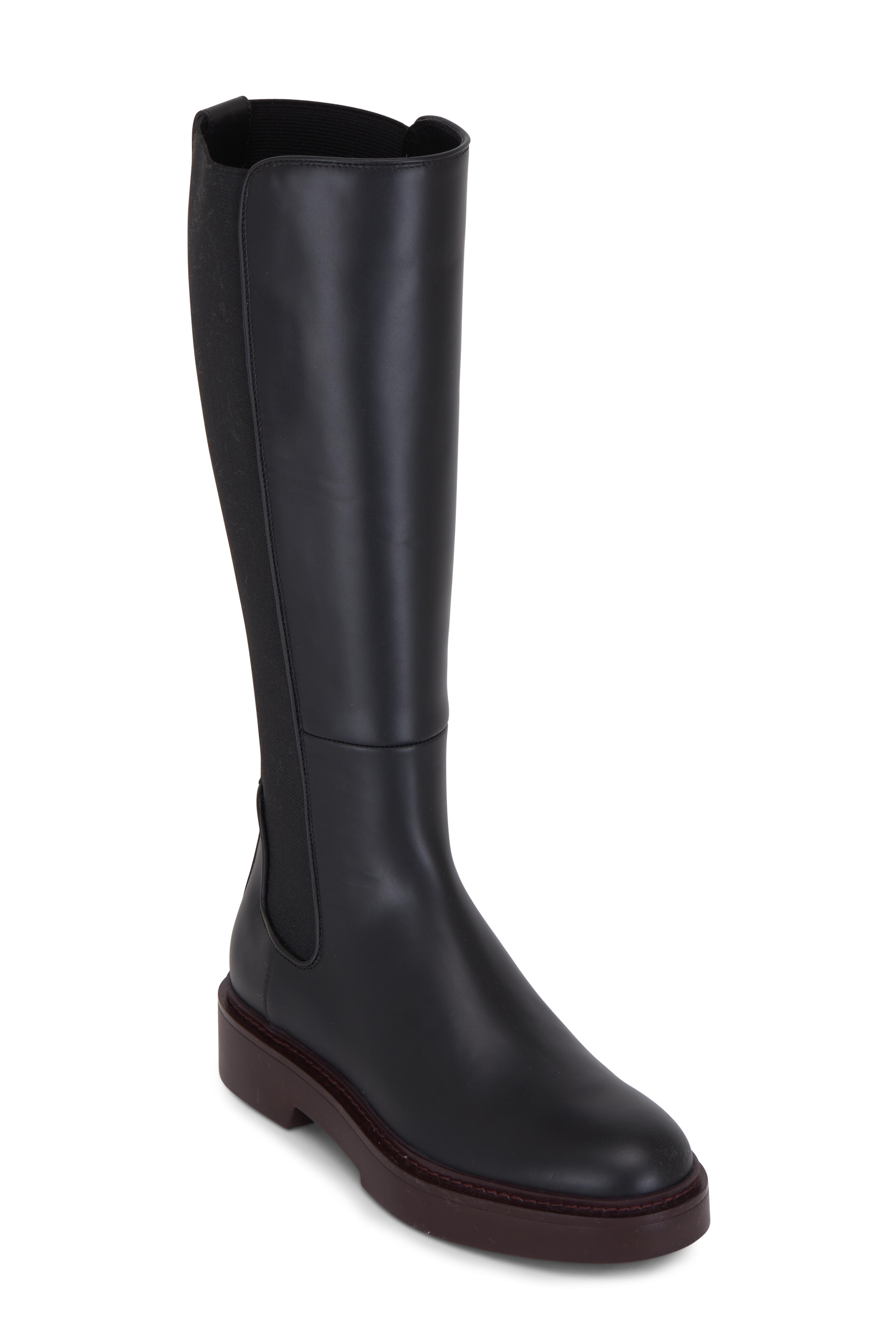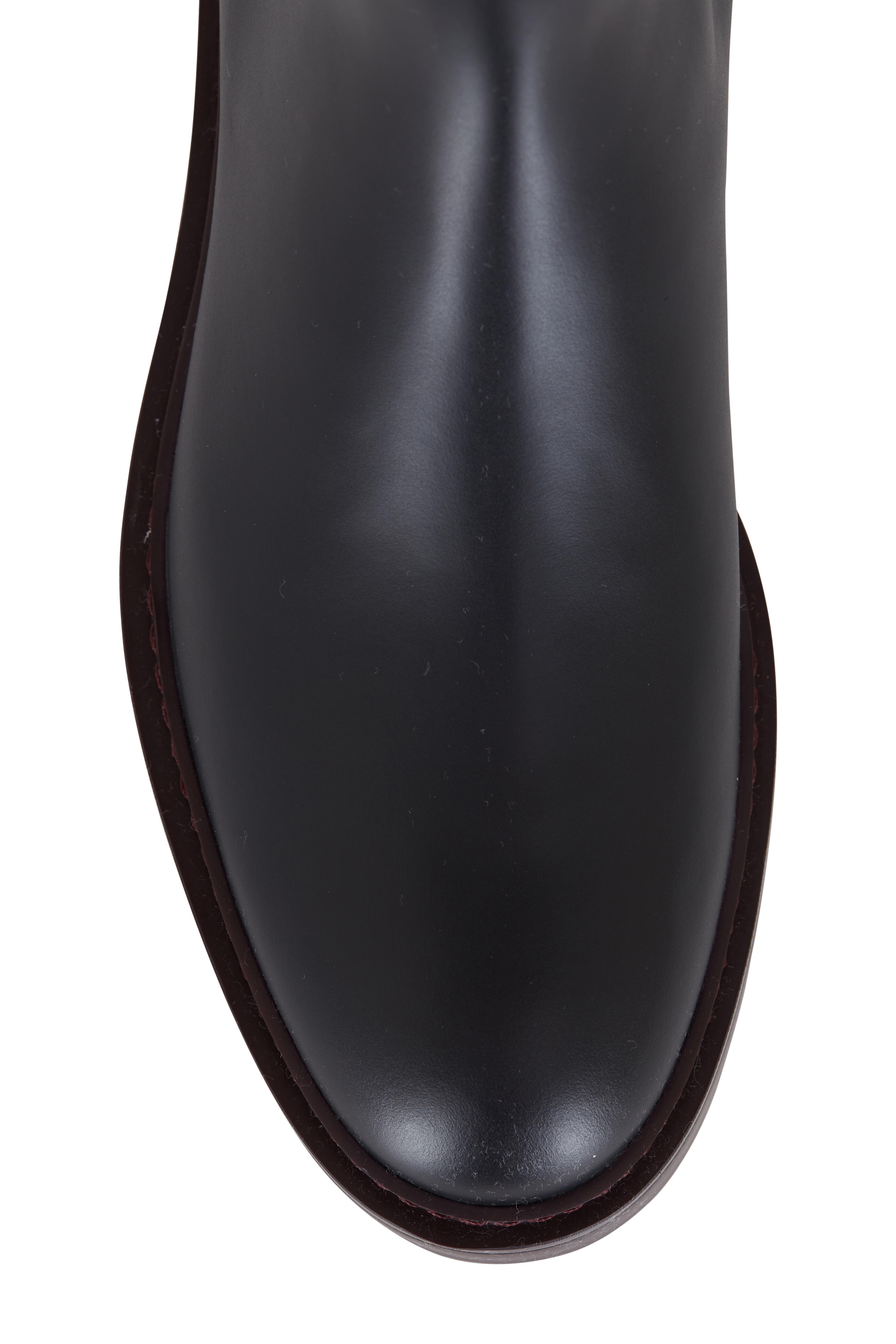 Calfskin leather upper. Round toe. Pull-on style. Elastic gore panels. Block heel. Burgundy rubber sole. Made in Italy.