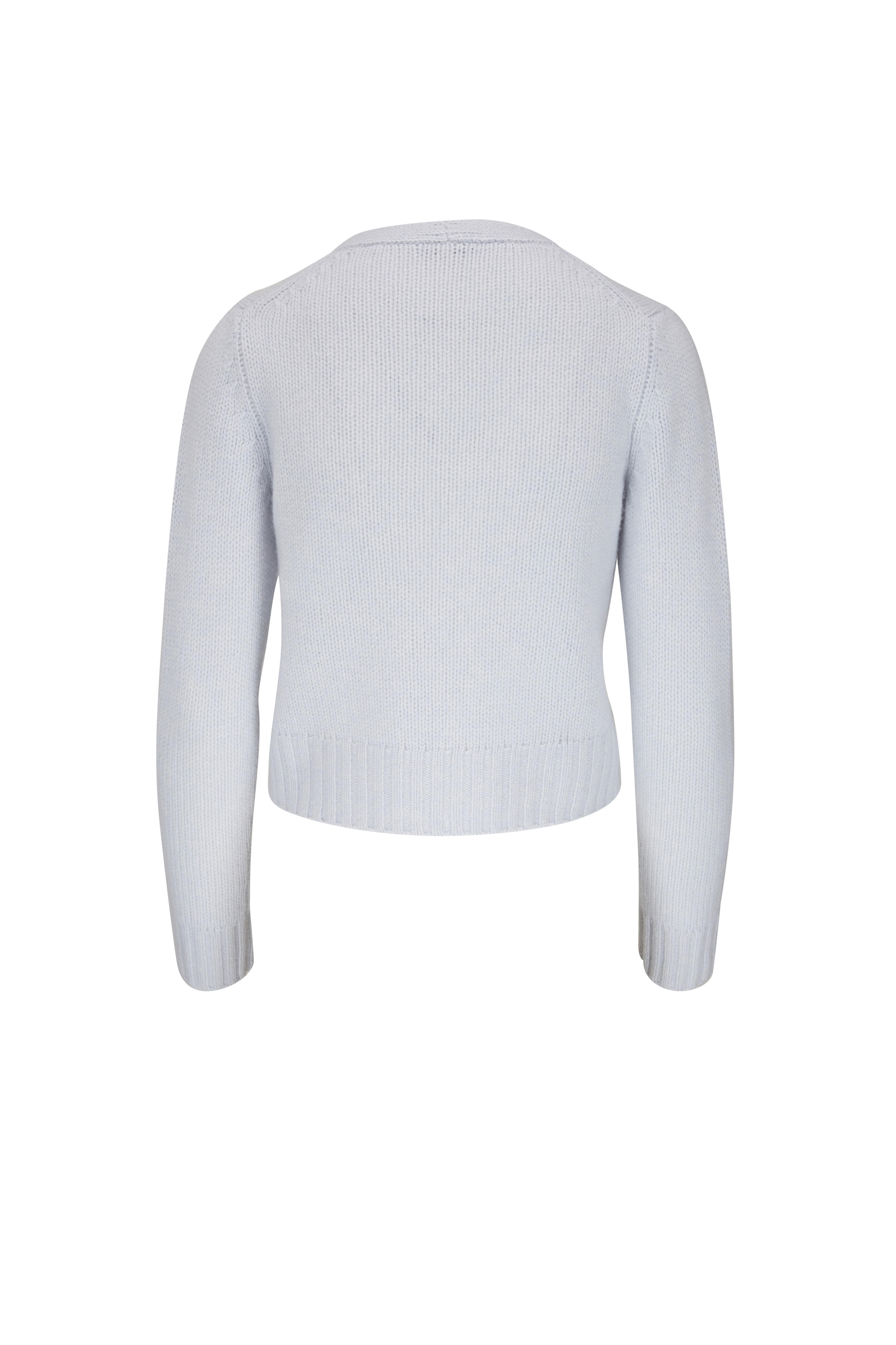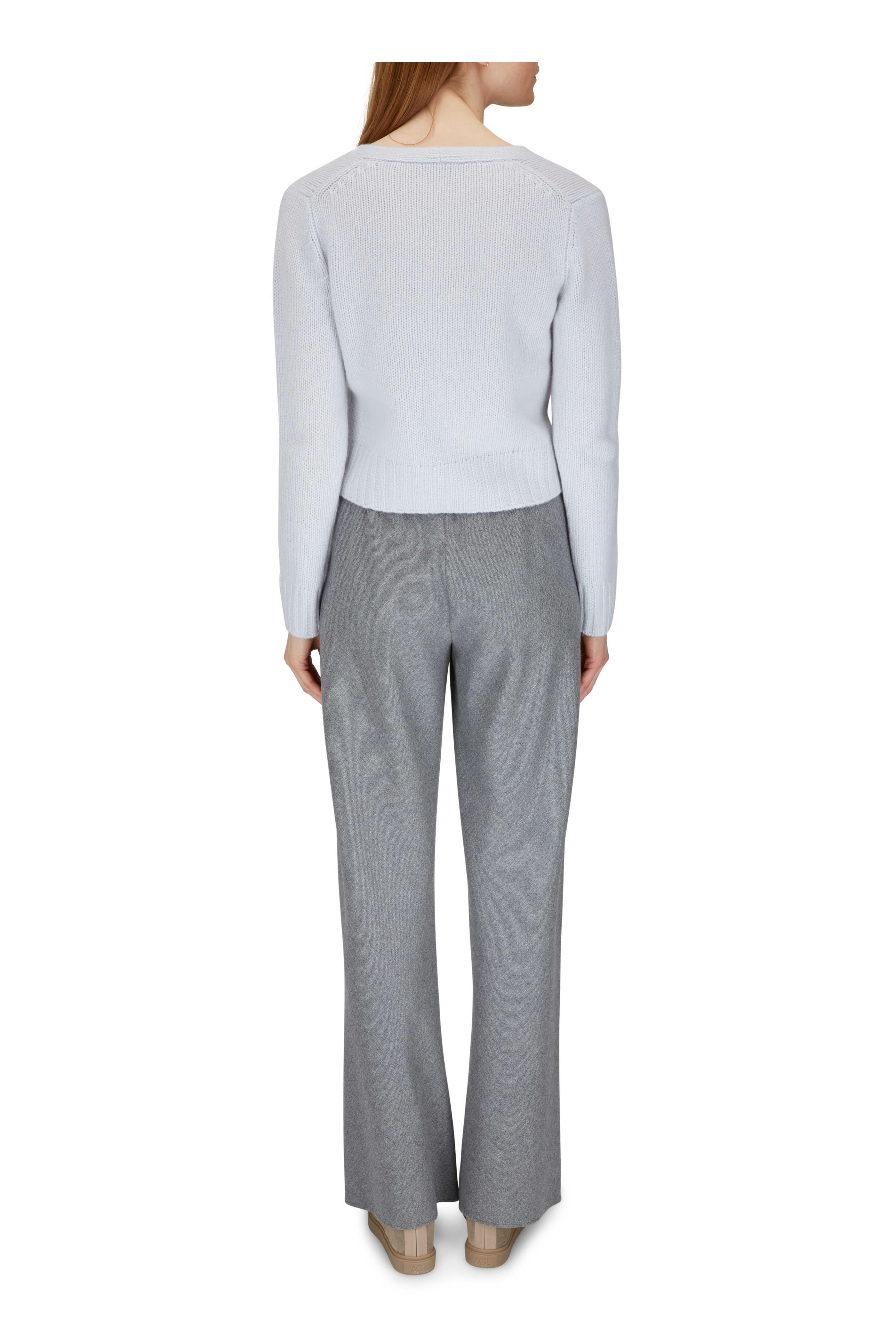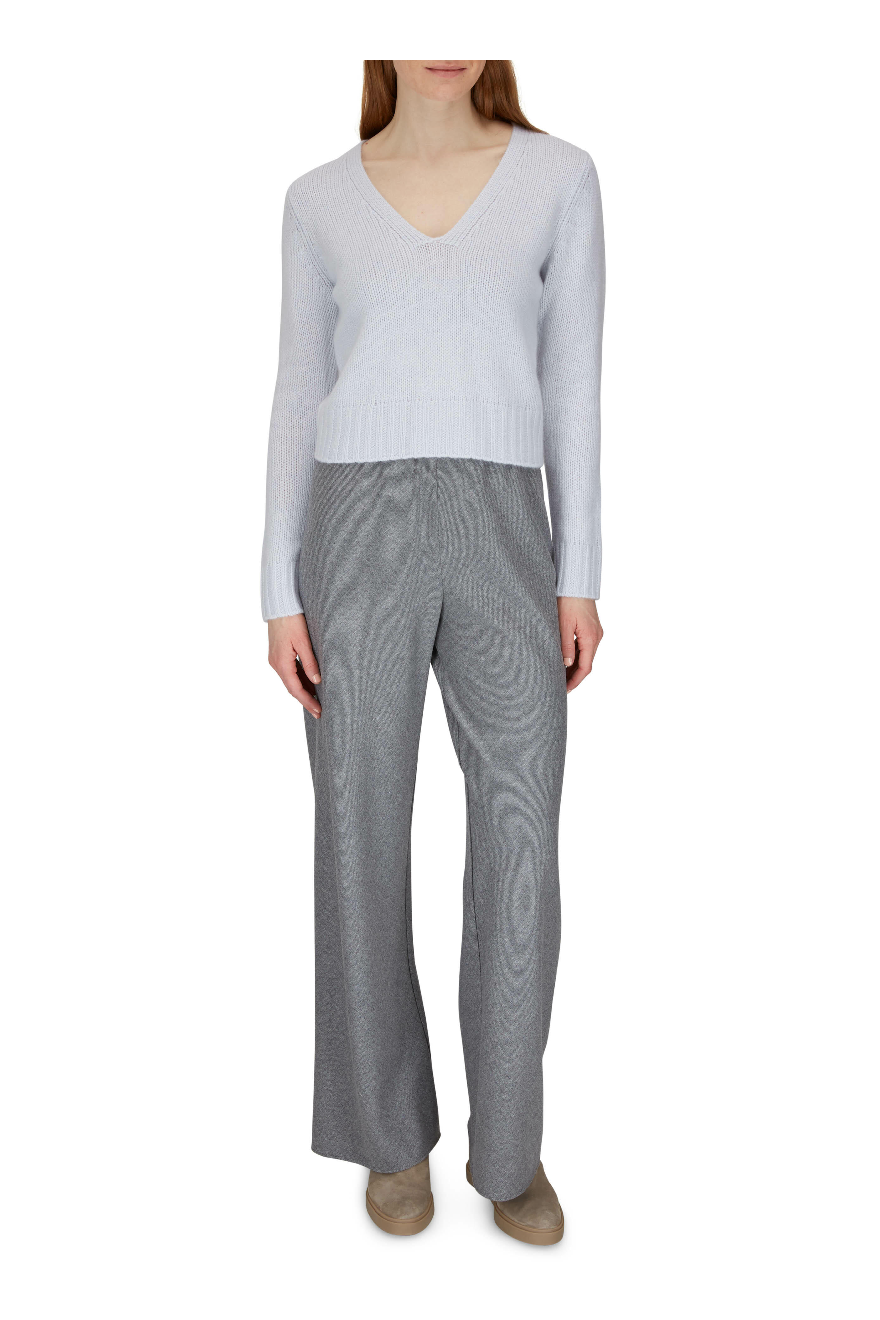 V-neckline. Ribbed trim. Imported. 100% cashmere. Hand wash.